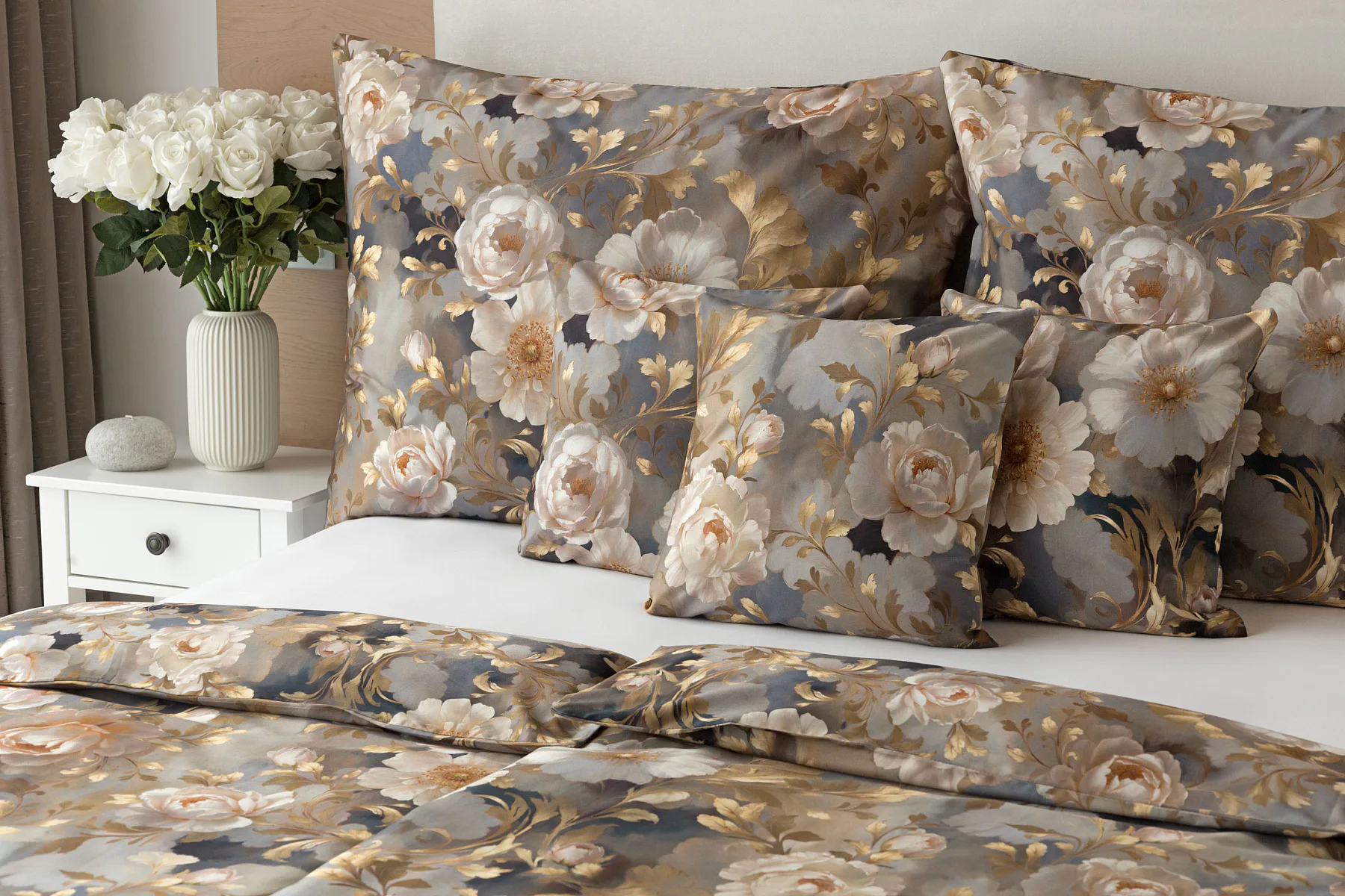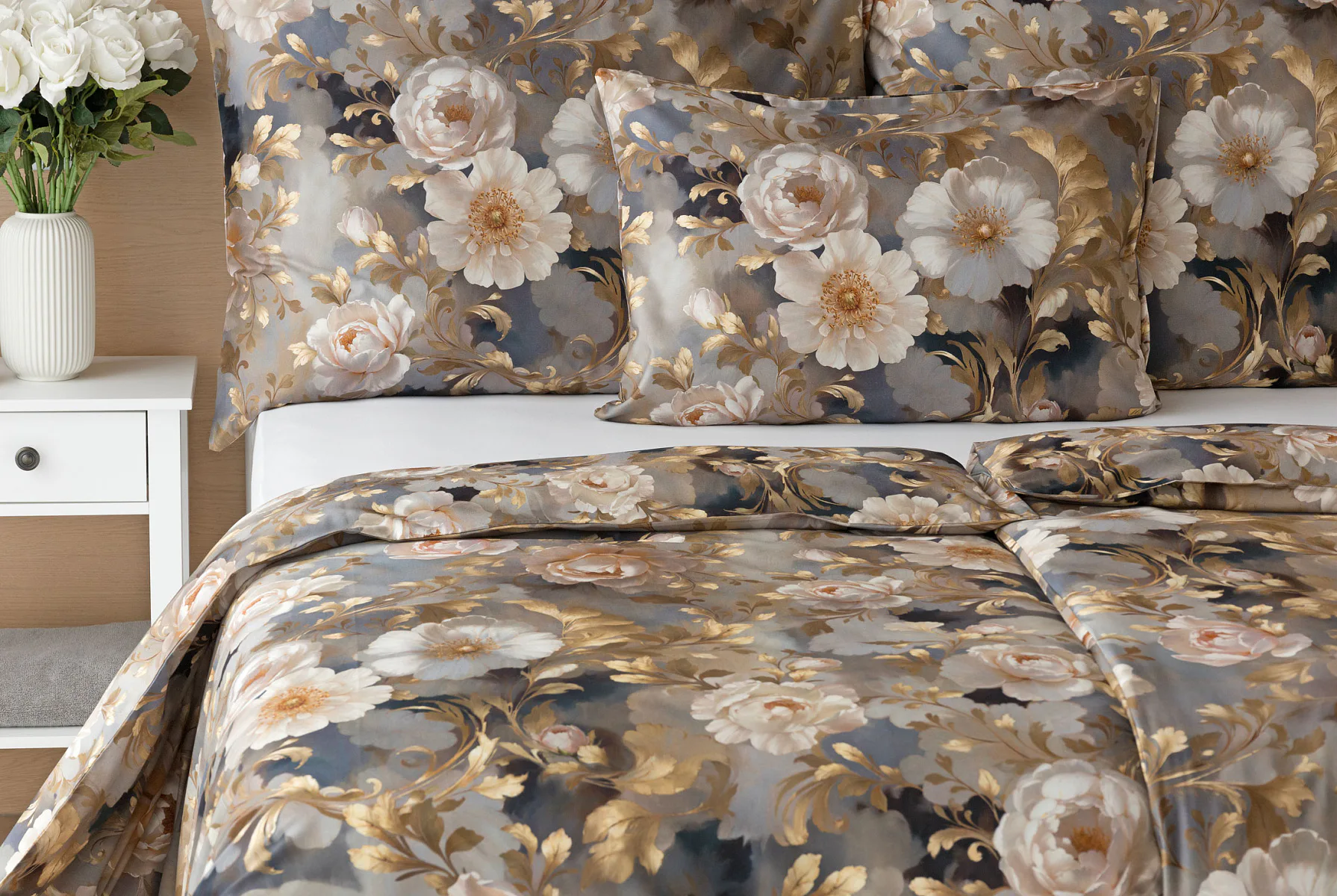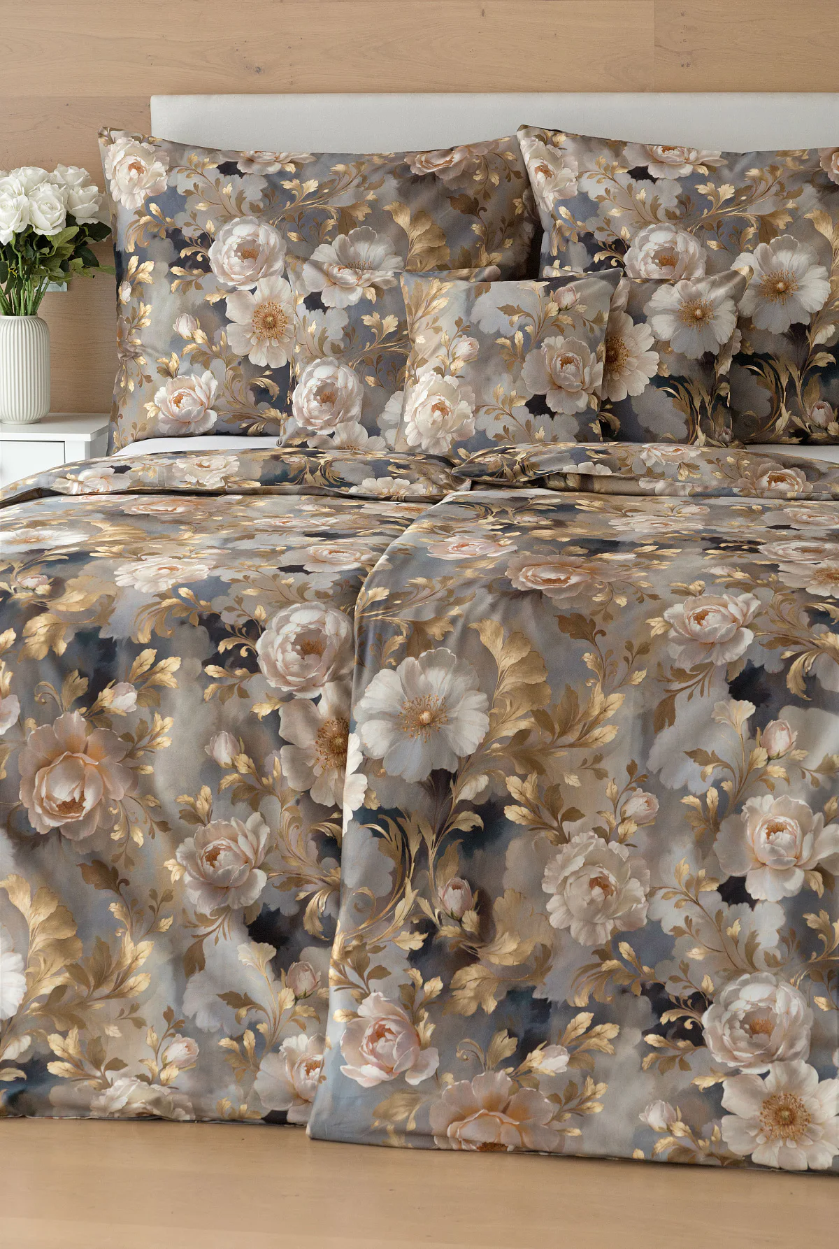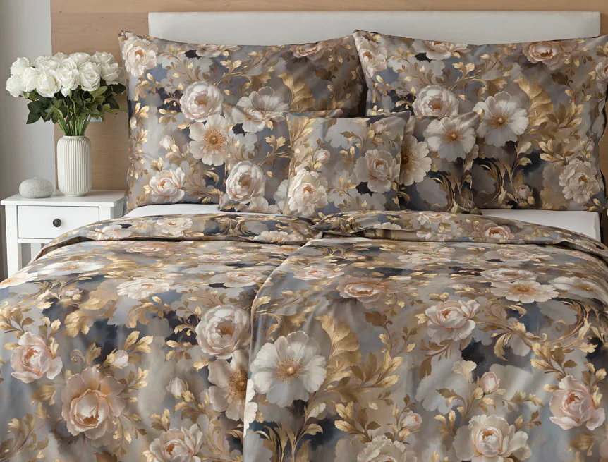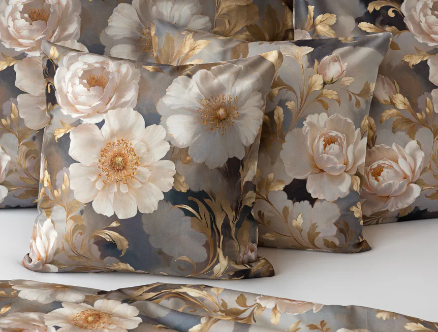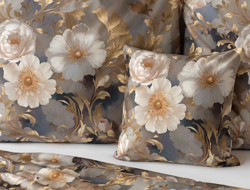 Saténové povlečení Ivelle vnese do vaší ložnice nádech zámecké atmosféry. Zlatavé tóny, které dominují tomuto jedinečnému květinovému vzoru, působí nesmírně elegantním dojmem, a promění každou ložnici v okouzlující oázu odpočinku. O precizní detail tištěného vzoru se postarala nejmodernější digitální technologie a hebký bavlněný satén propůjčil ložnímu povlečení decentní odlesk, který si tento vzor opravdu zaslouží.
