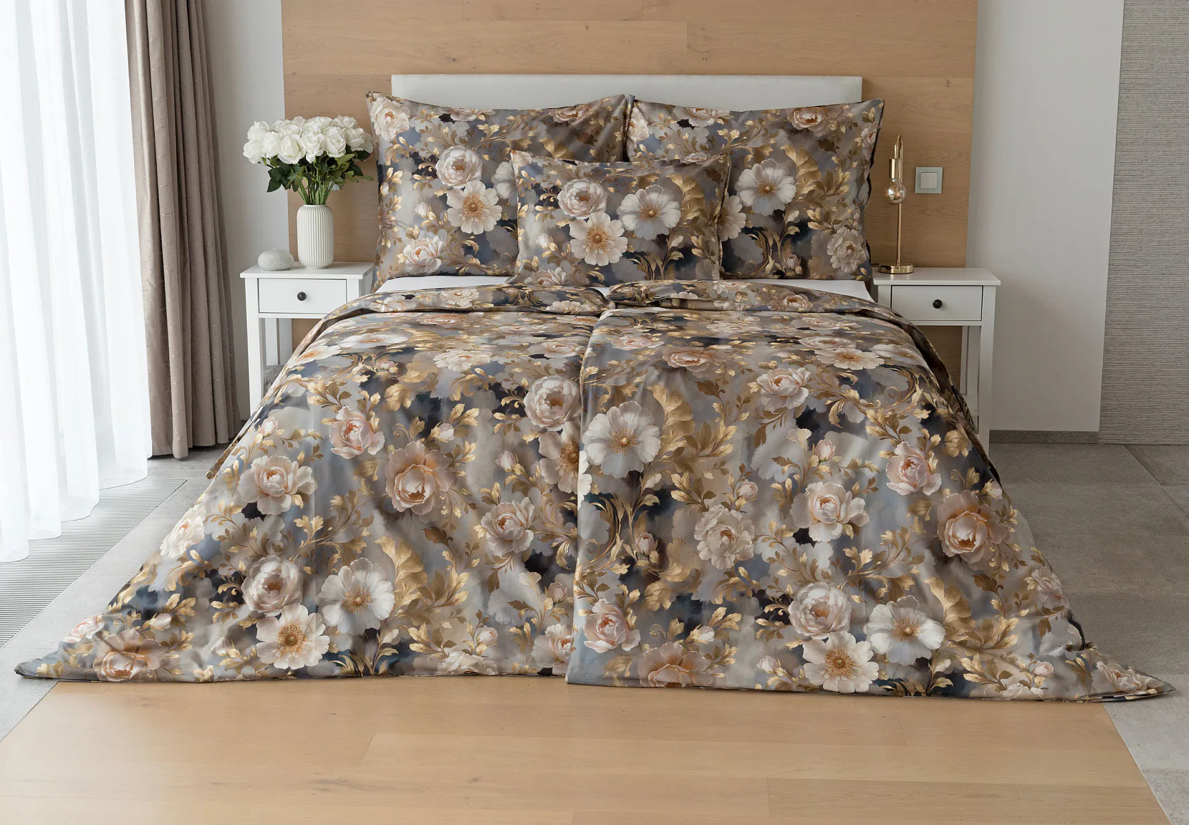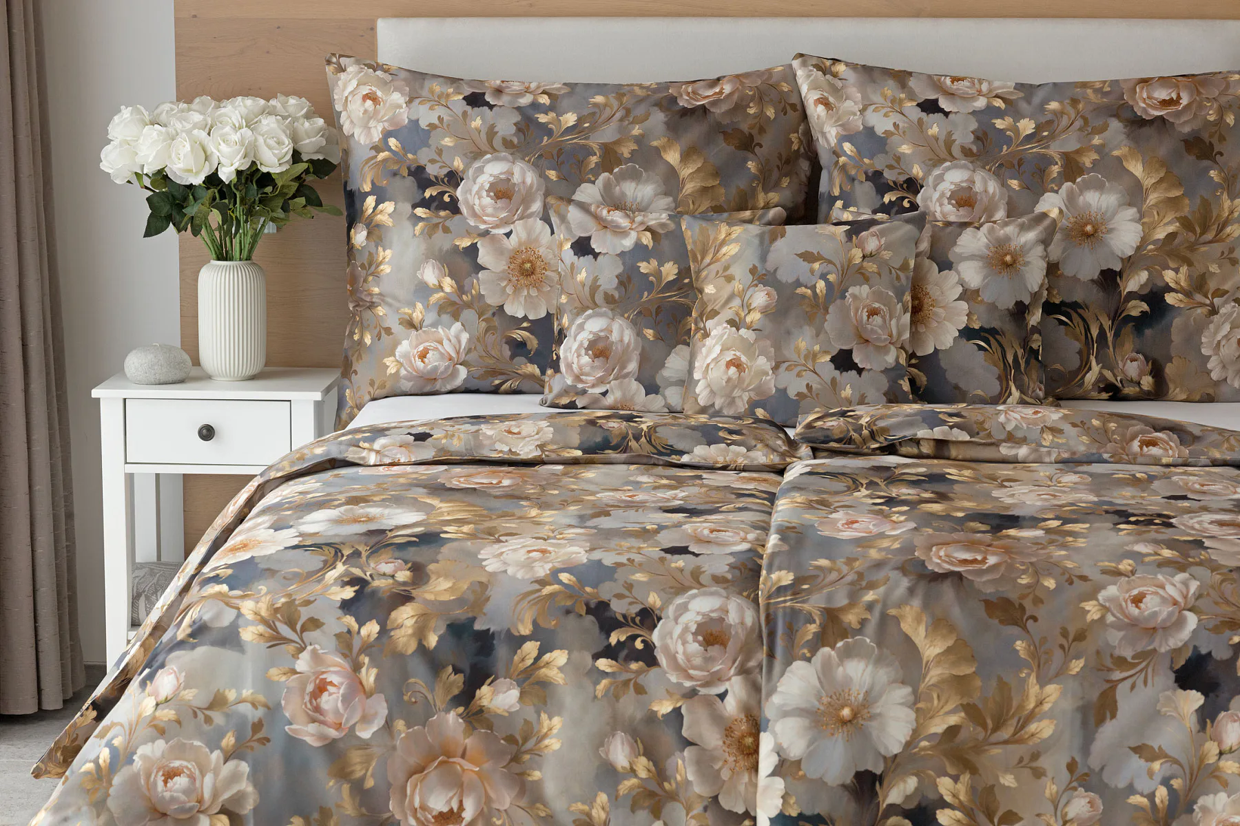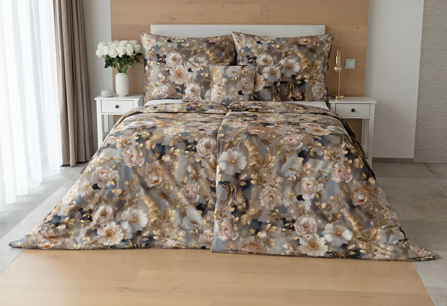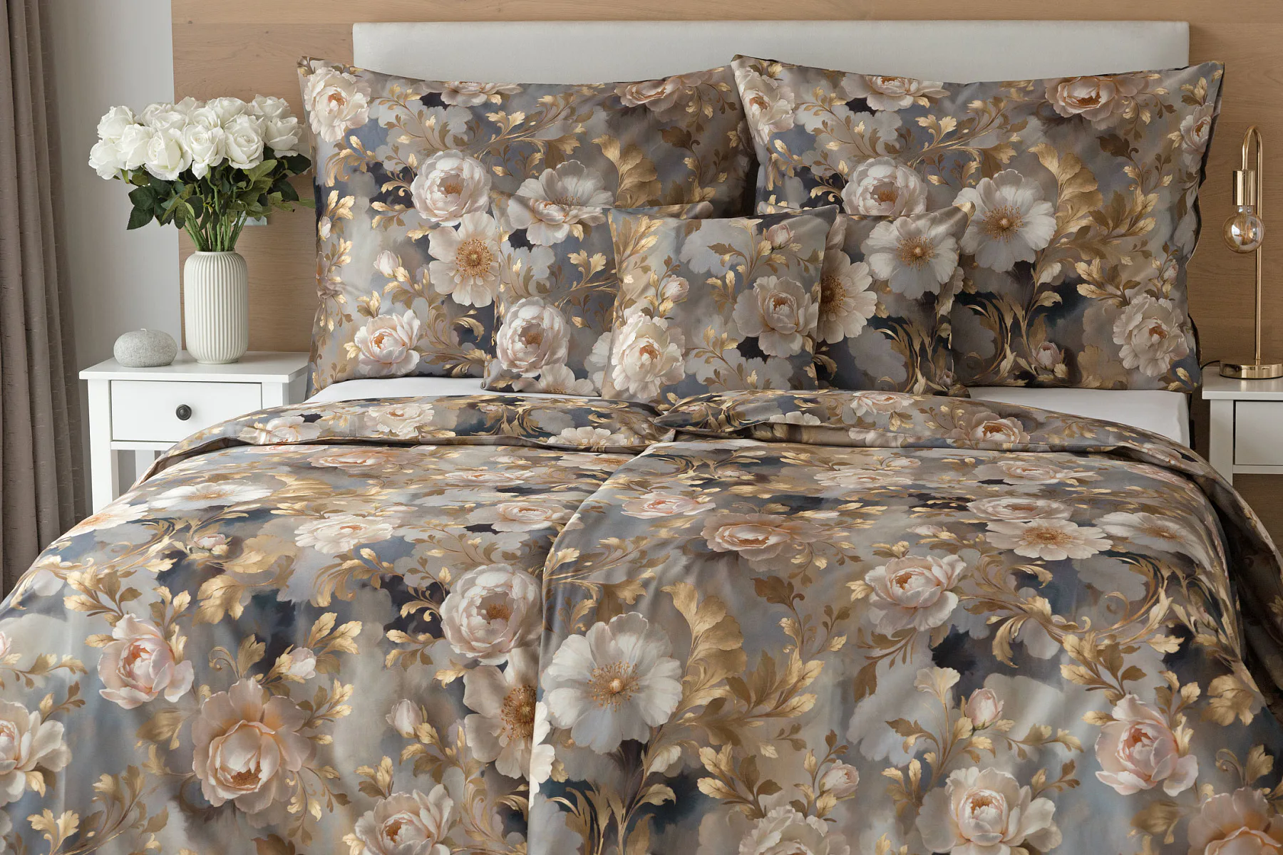 Saténové povlečení Ivelle vnese do vaší ložnice nádech zámecké atmosféry. Zlatavé tóny, které dominují tomuto jedinečnému květinovému vzoru, působí nesmírně elegantním dojmem, a promění každou ložnici v okouzlující oázu odpočinku. O precizní detail tištěného vzoru se postarala nejmodernější digitální technologie a hebký bavlněný satén propůjčil ložnímu povlečení decentní odlesk, který si tento vzor opravdu zaslouží.
