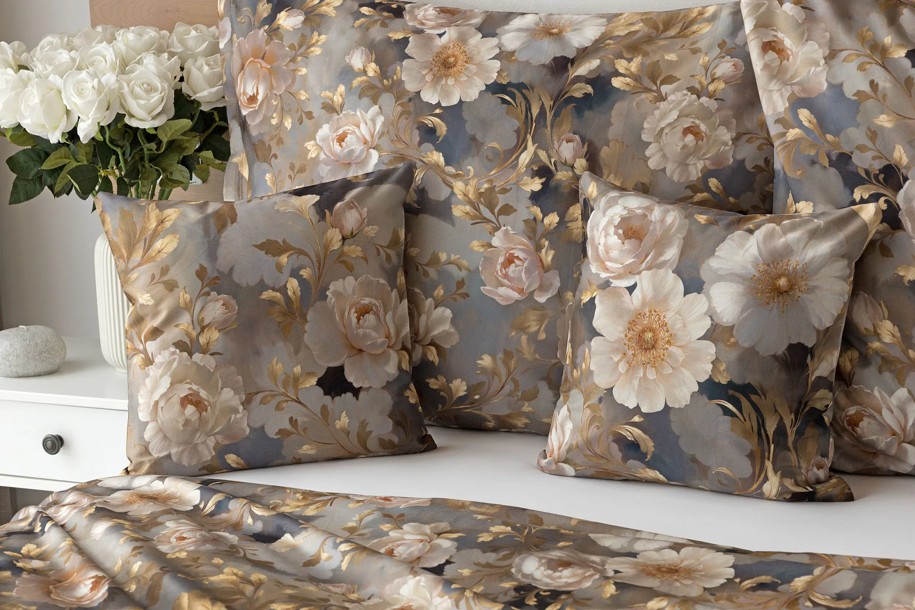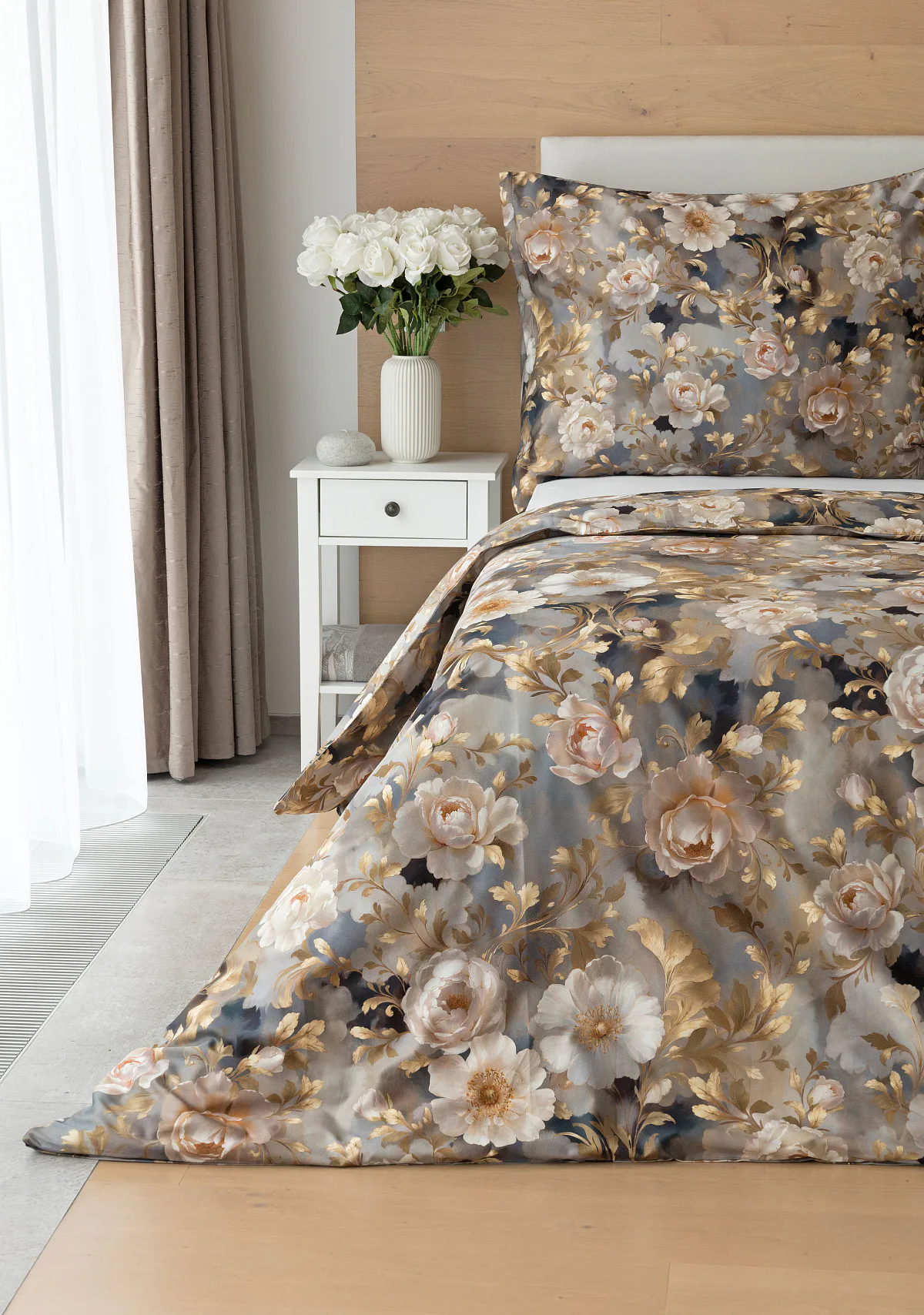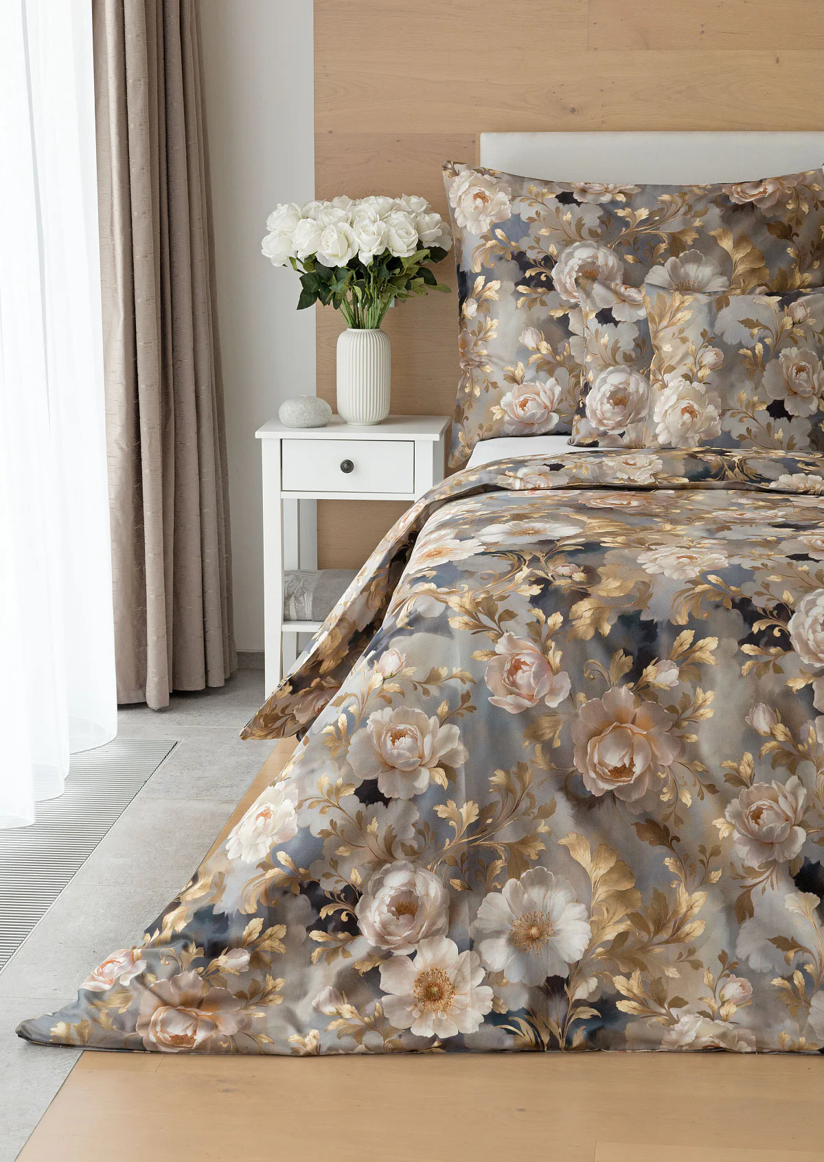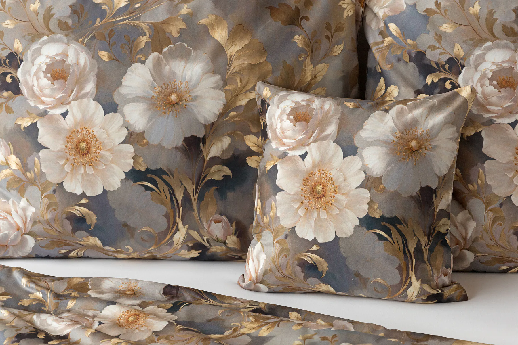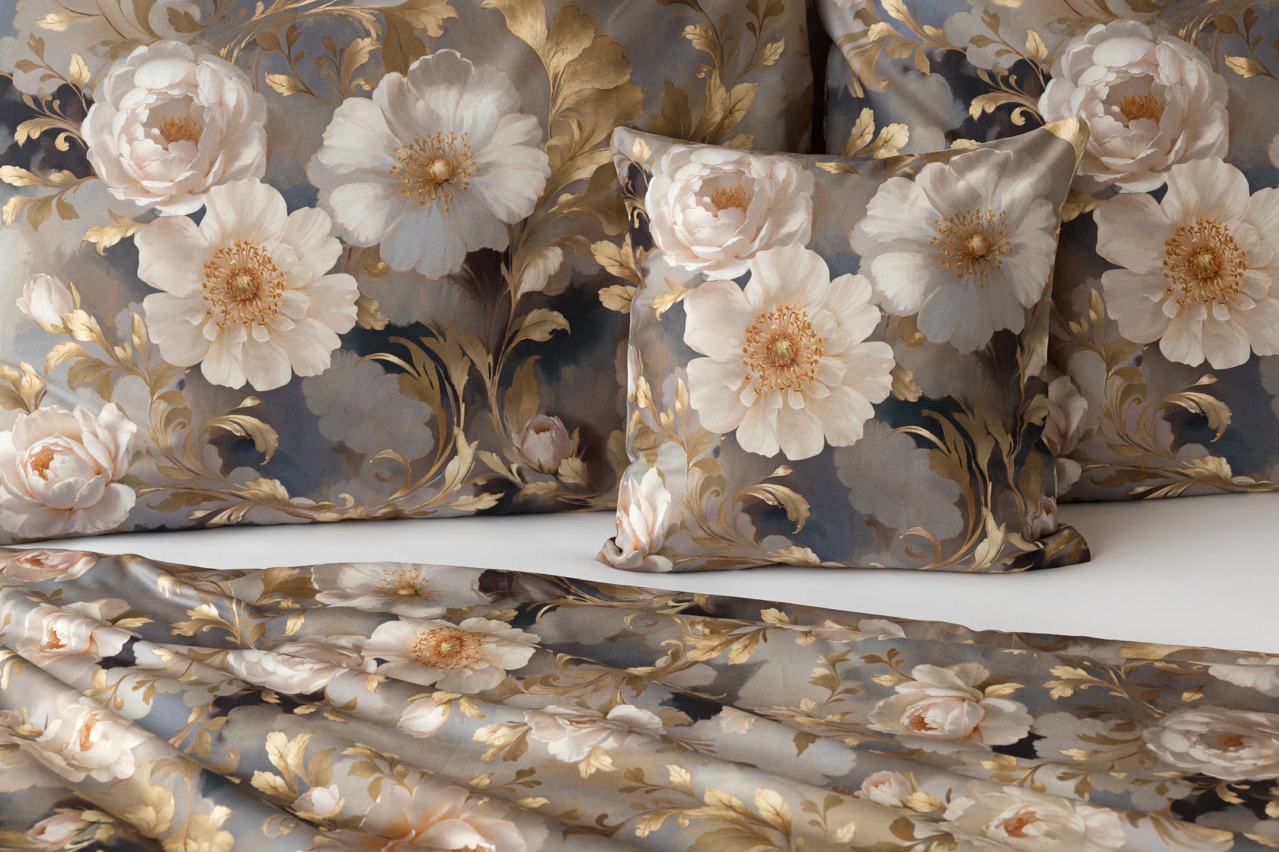 Saténové povlečení Ivelle vnese do vaší ložnice nádech zámecké atmosféry. Zlatavé tóny, které dominují tomuto jedinečnému květinovému vzoru, působí nesmírně elegantním dojmem, a promění každou ložnici v okouzlující oázu odpočinku. O precizní detail tištěného vzoru se postarala nejmodernější digitální technologie a hebký bavlněný satén propůjčil ložnímu povlečení decentní odlesk, který si tento vzor opravdu zaslouží.