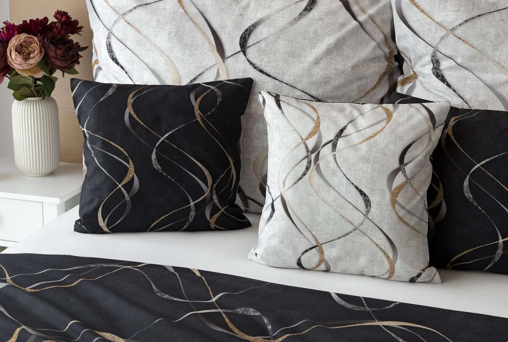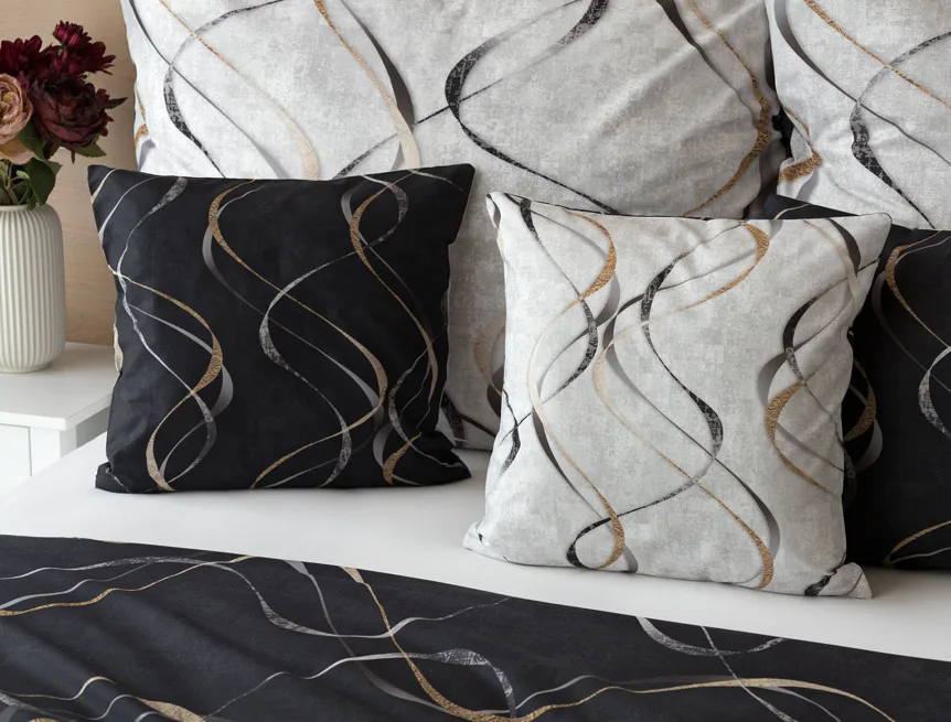 Vylaďte si ložnici podle nálady s elegantním bavlněným povlečením Kingston. Oblíbené oboustranné provedení vám umožní jednoduše změnit vzhled interiéru, aniž byste museli nutně převlékat. Jednoduchý motiv zvlněných šedozlatých linek se prolíná na černém a světle šedém podkladu. Originální vzhled vzoru podtrhuje tzv. Grunge textura, která vyniká díky preciznímu digitálnímu tisku.