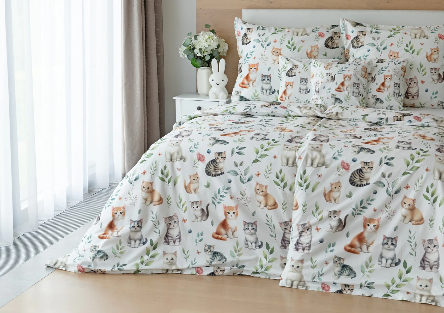 Povlak na polštář i na přikrývku zachycuje z obou stran motiv koťátek. Povlečení je vyrobeno ze 100% bavlny a je opatřeno praktickým zipovým uzávěrem.