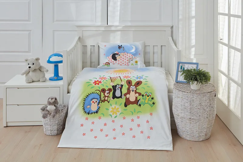 Roztomilé povlečení Krtek a počítadlo rozveselí dětskou postýlku a dětem se v něm bude krásně usínat. Povlak na přikrývku je z obou stran stejný, povlak na polštář zachycuje z každé strany jiný motiv.