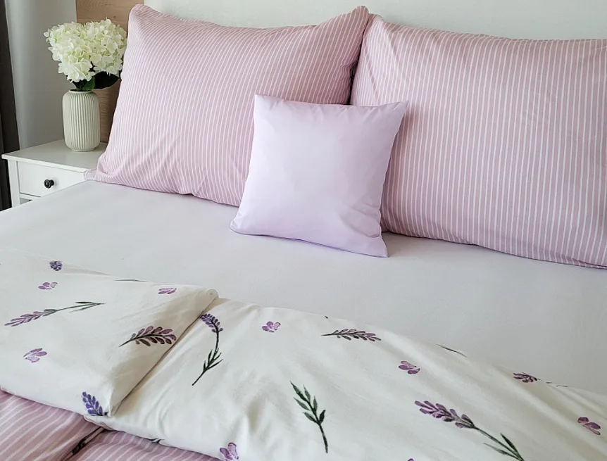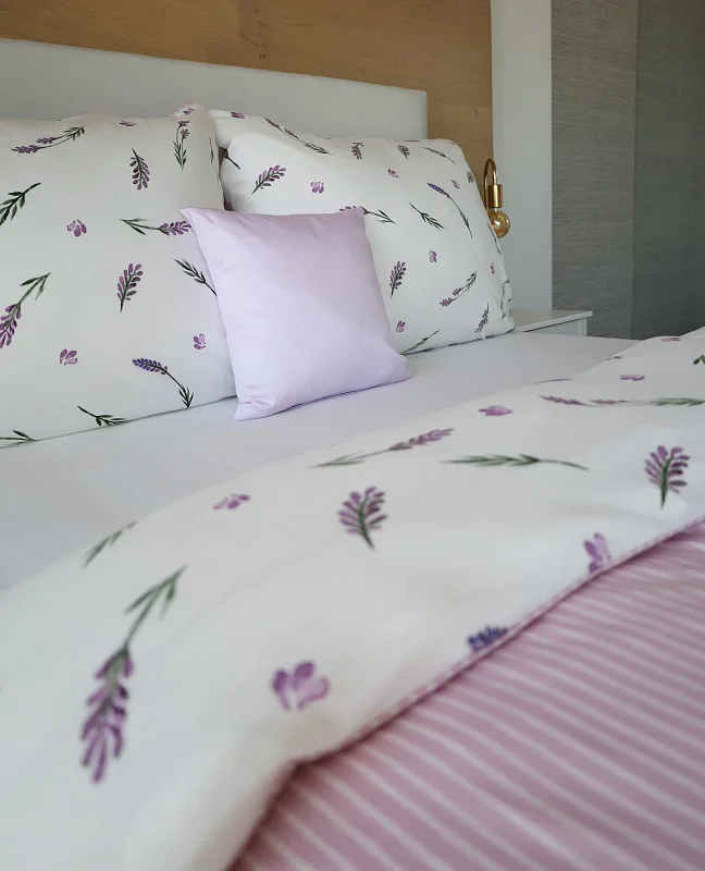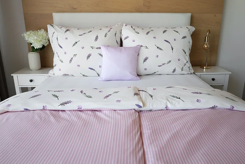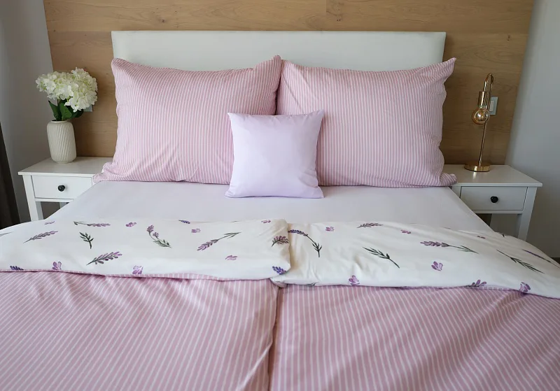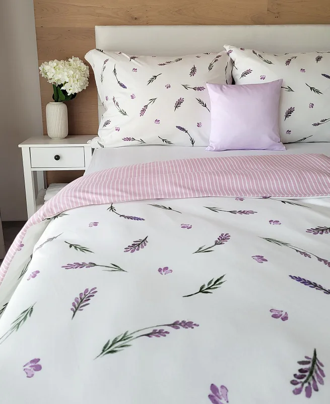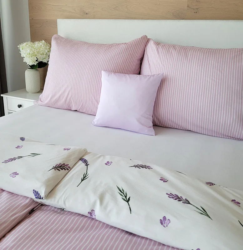 Oblíbený motiv levandule ve spojení s elegantním proužkem přináší ložní povlečení Lavender. Vrchní stranu povlečení zdobí levandulové snítky na bílém podkladu, spodní stranu tvoří pastelově růžový podklad protnutý jemnými bílými proužky.