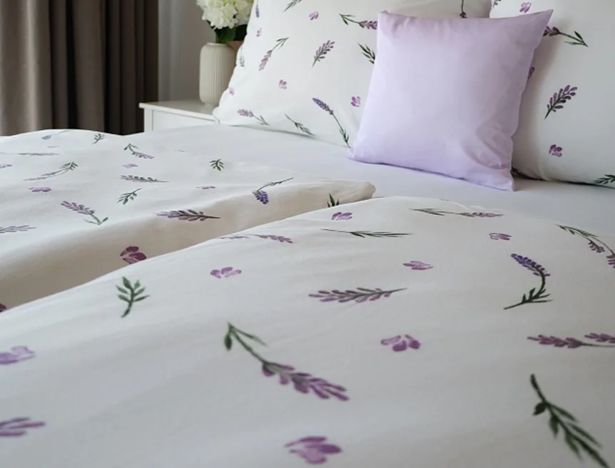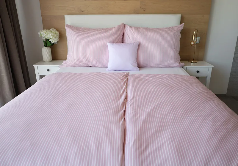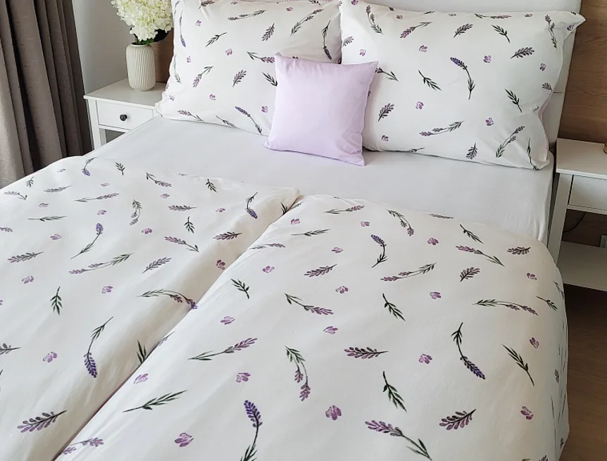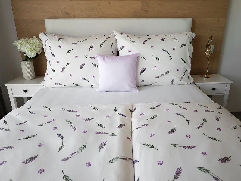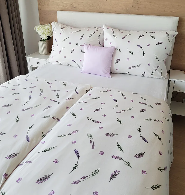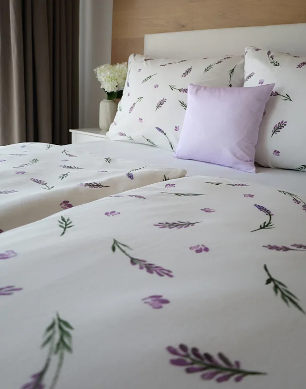 Oblíbený motiv levandule ve spojení s elegantním proužkem přináší ložní povlečení Lavender. Vrchní stranu povlečení zdobí levandulové snítky na bílém podkladu, spodní stranu tvoří pastelově růžový podklad protnutý jemnými bílými proužky.