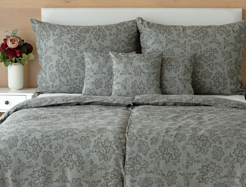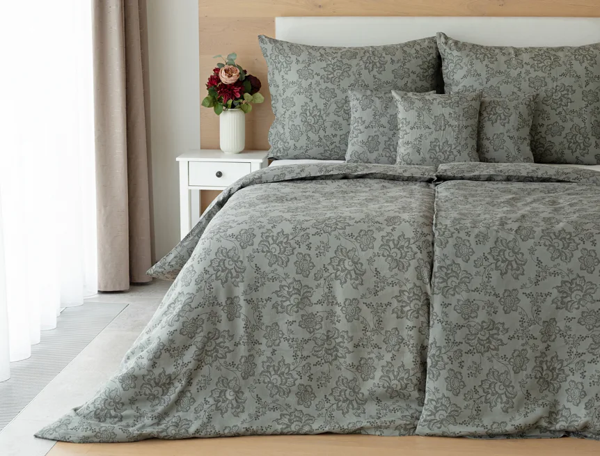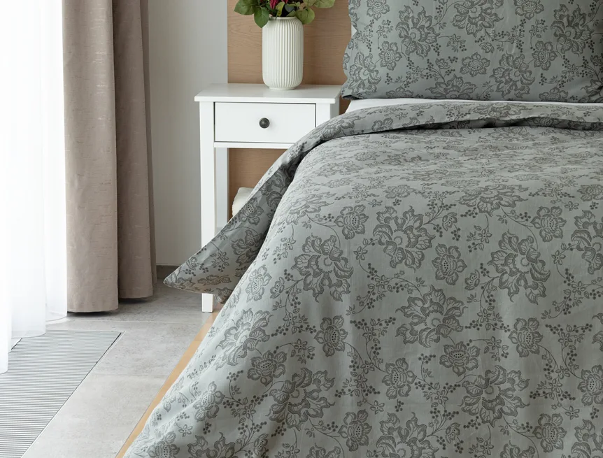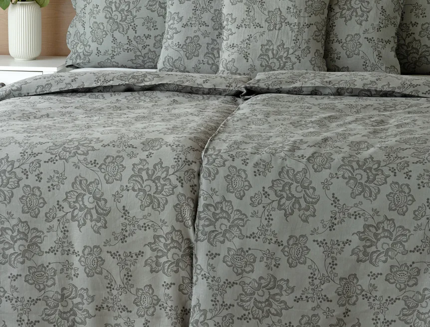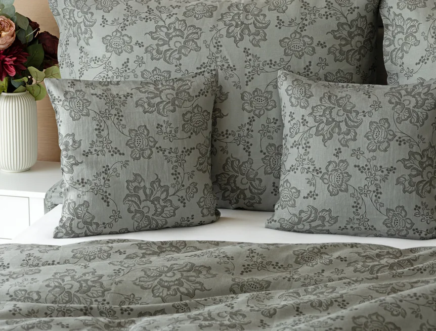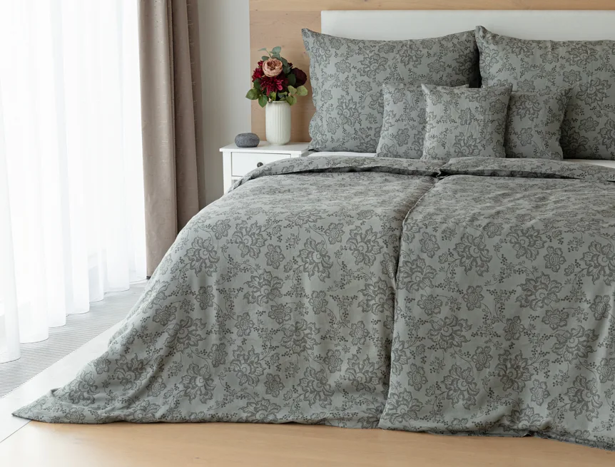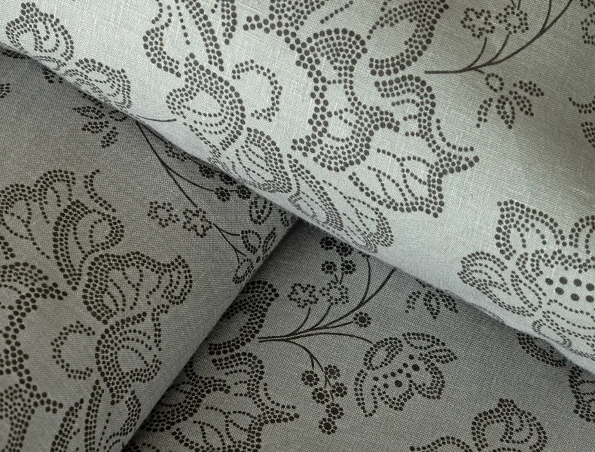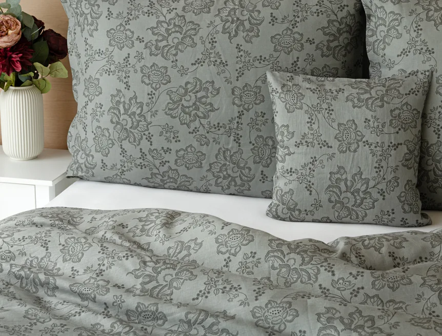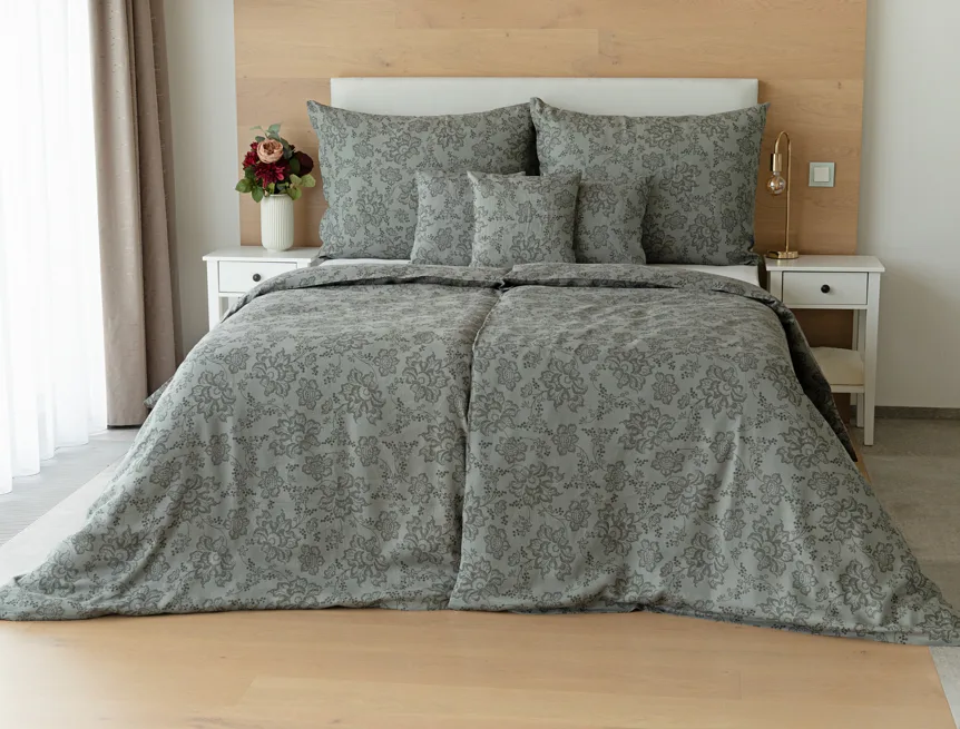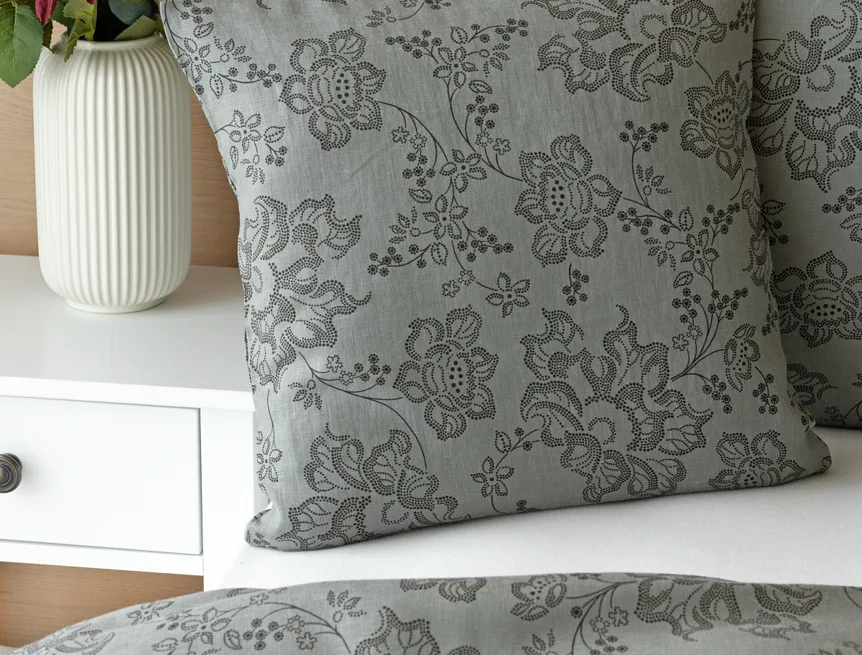 Objevte benefity jedinečného přírodního materiálu a dopřejte si nezaměnitelný komfort s naším lněným povlečením Leilani. Originální florální motiv v antracitové barvě vyniká na šédém podkladu ložního povlečení. Elegntní vzor v kombinaci s tímto ekologicky šetrným materiálem doladí k dokonalosti každý interiér s rustikálním nádechem, ale může být noblesní ozdobou i v moderně zařízené ložnici.