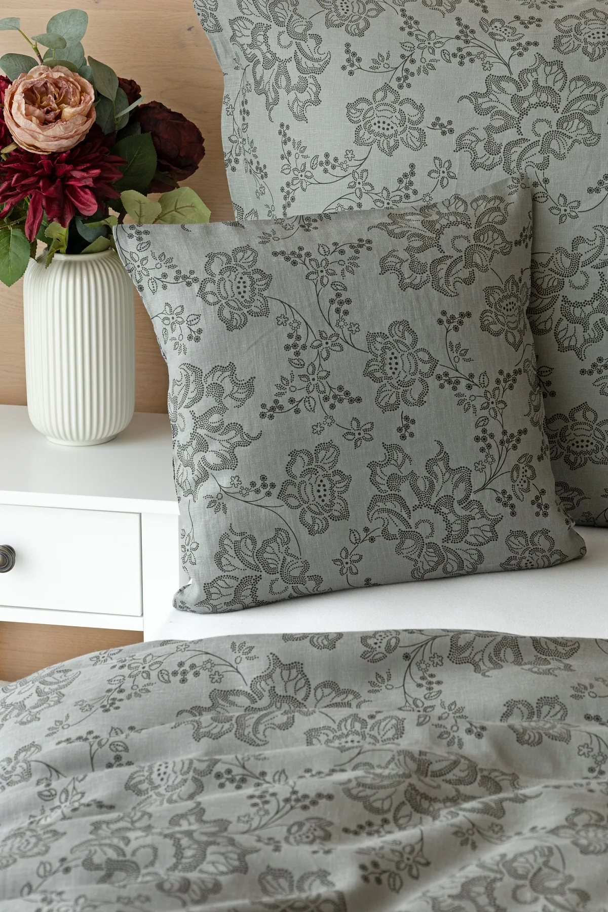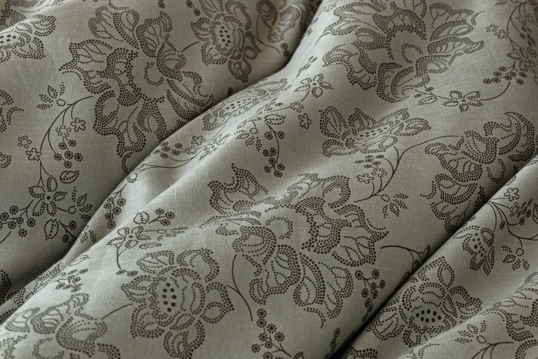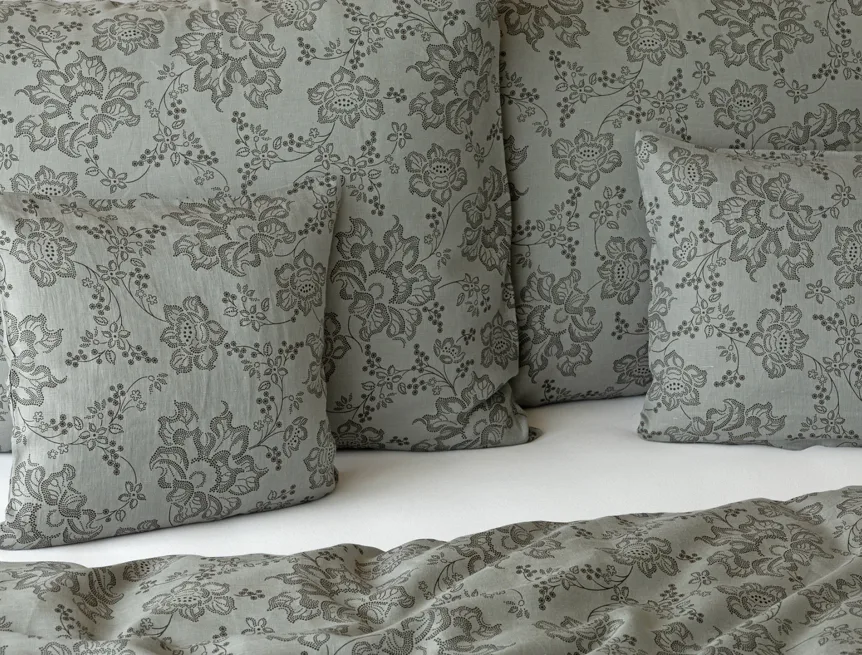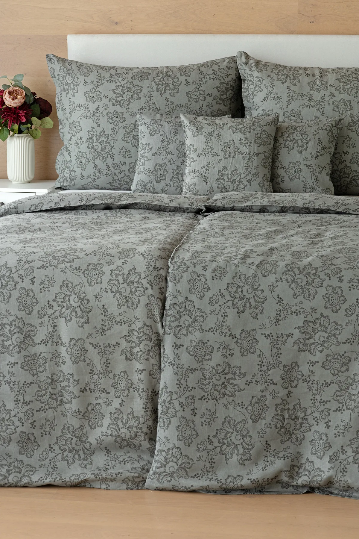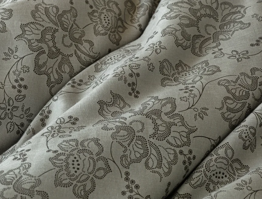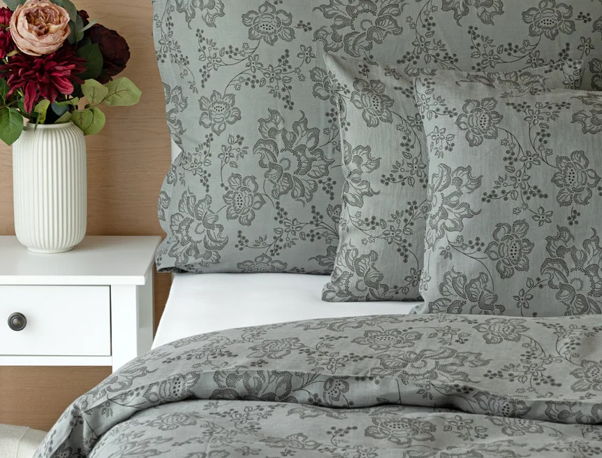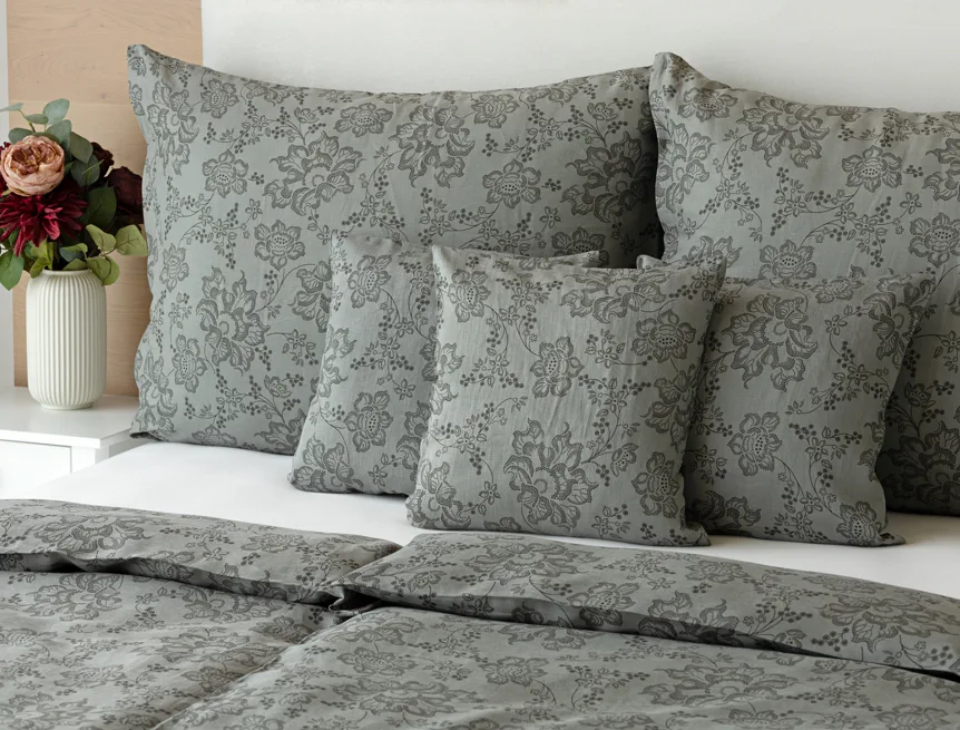 Objevte benefity jedinečného přírodního materiálu a dopřejte si nezaměnitelný komfort s naším lněným povlečením Leilani. Originální florální motiv v antracitové barvě vyniká na šédém podkladu ložního povlečení. Elegntní vzor v kombinaci s tímto ekologicky šetrným materiálem doladí k dokonalosti každý interiér s rustikálním nádechem, ale může být noblesní ozdobou i v moderně zařízené ložnici.