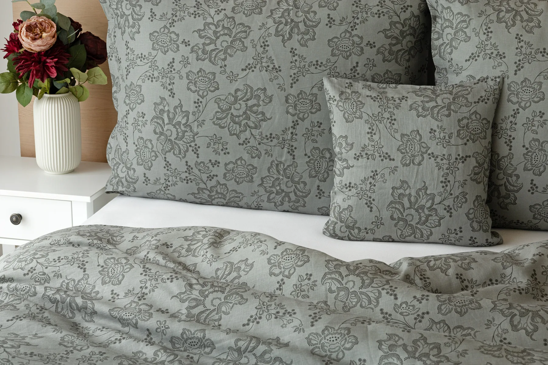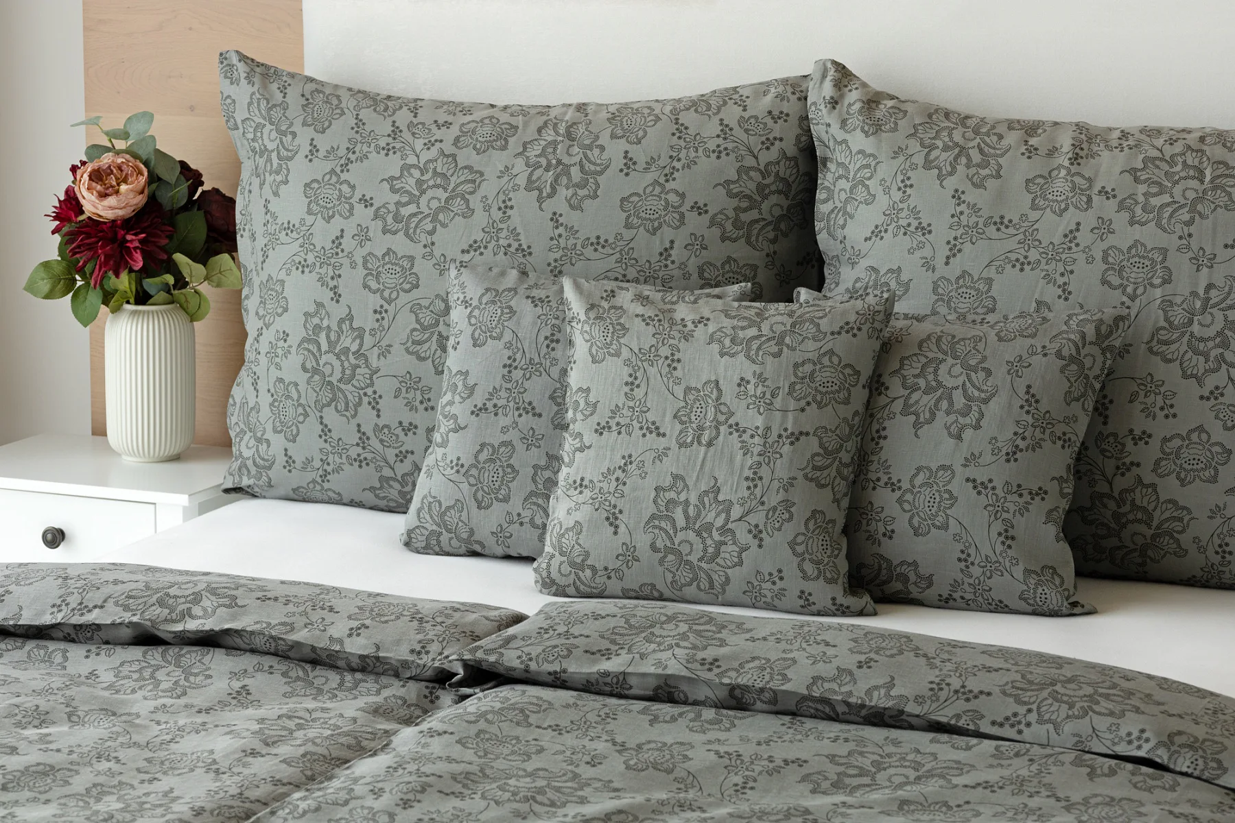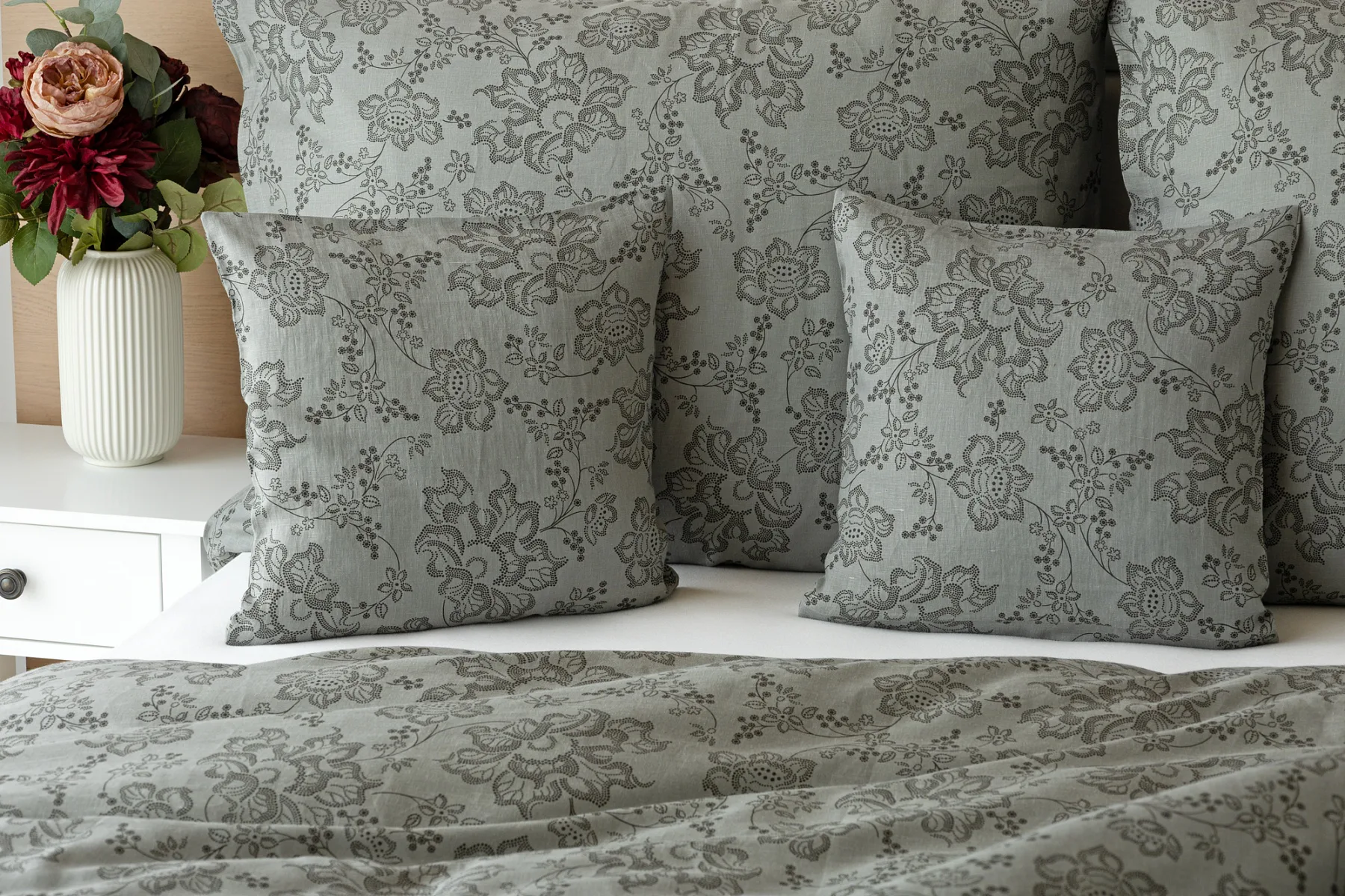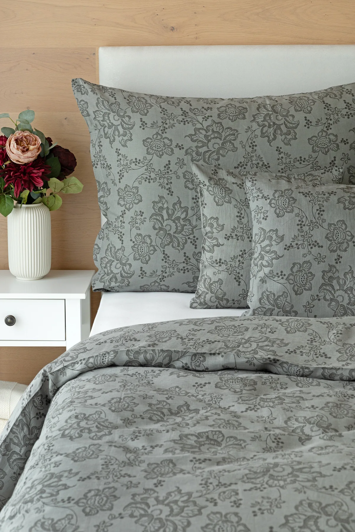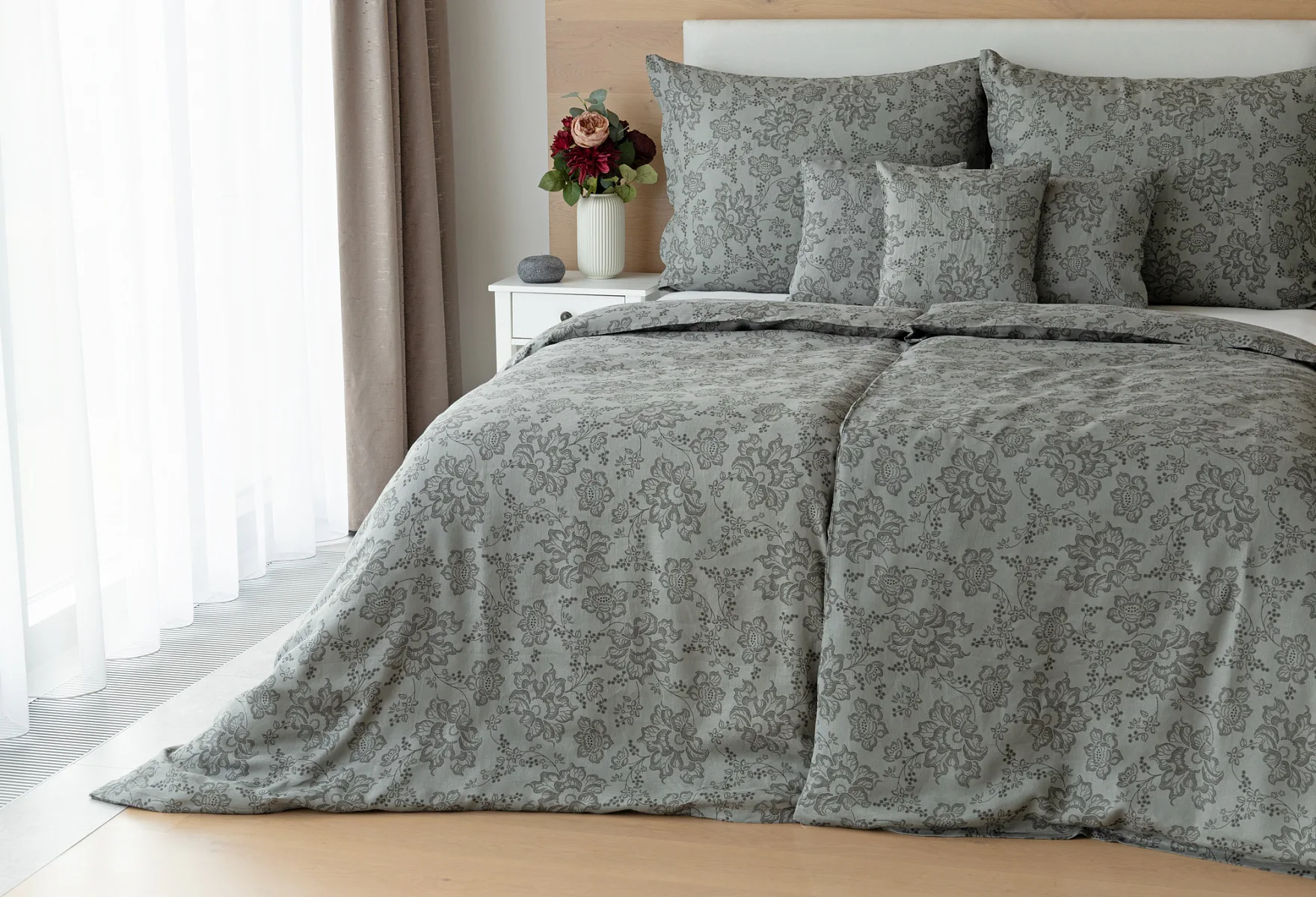 Objevte benefity jedinečného přírodního materiálu a dopřejte si nezaměnitelný komfort s naším lněným povlečením Leilani. Originální florální motiv v antracitové barvě vyniká na šédém podkladu ložního povlečení. Elegntní vzor v kombinaci s tímto ekologicky šetrným materiálem doladí k dokonalosti každý interiér s rustikálním nádechem, ale může být noblesní ozdobou i v moderně zařízené ložnici.