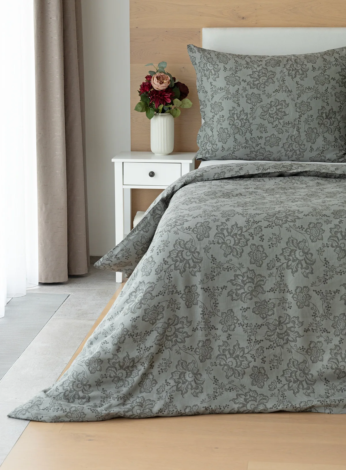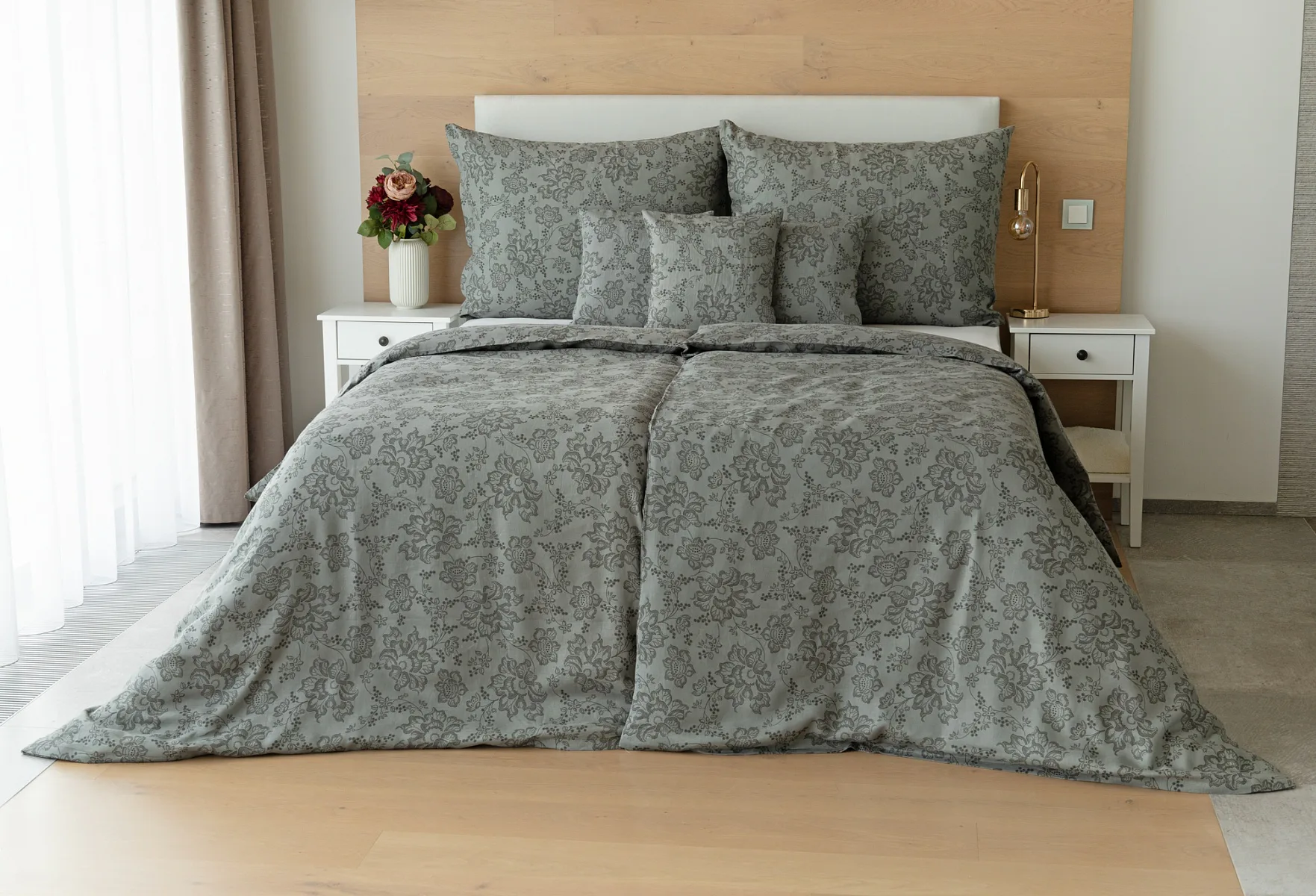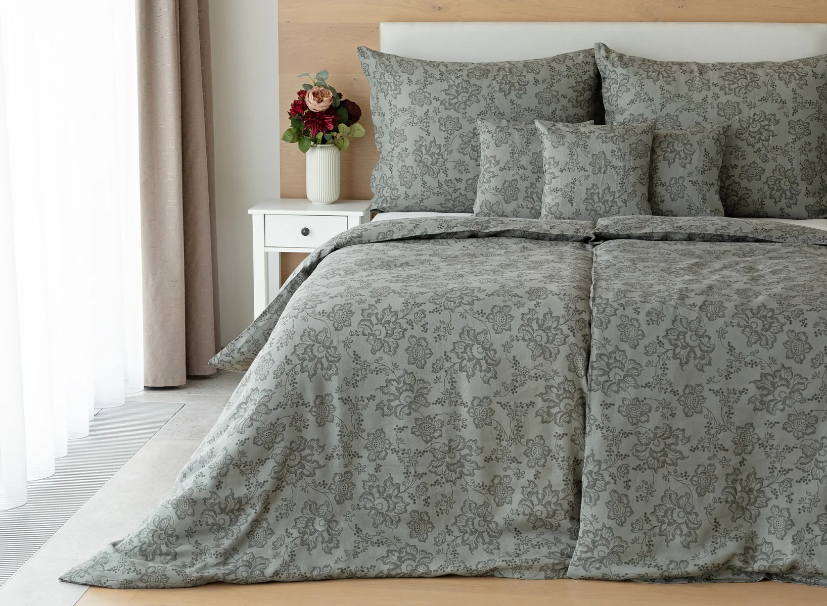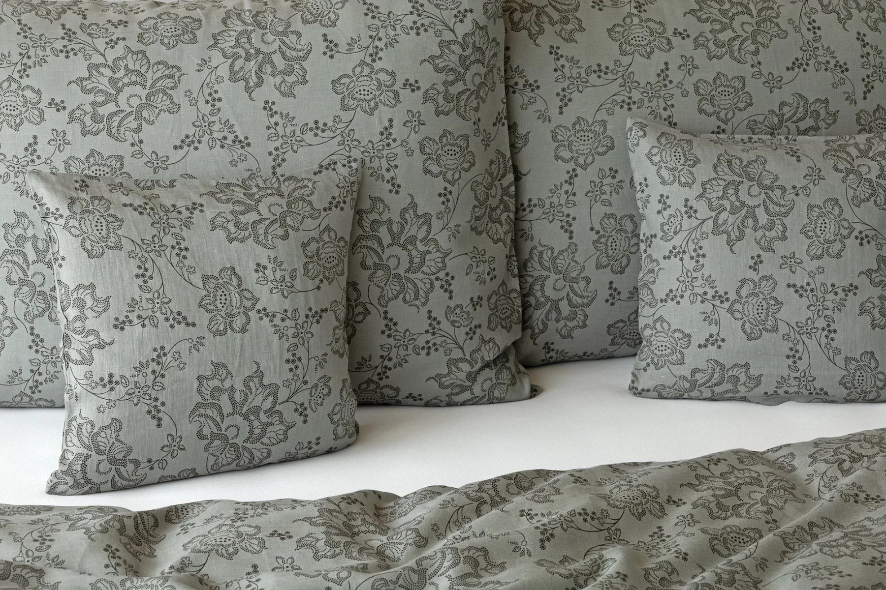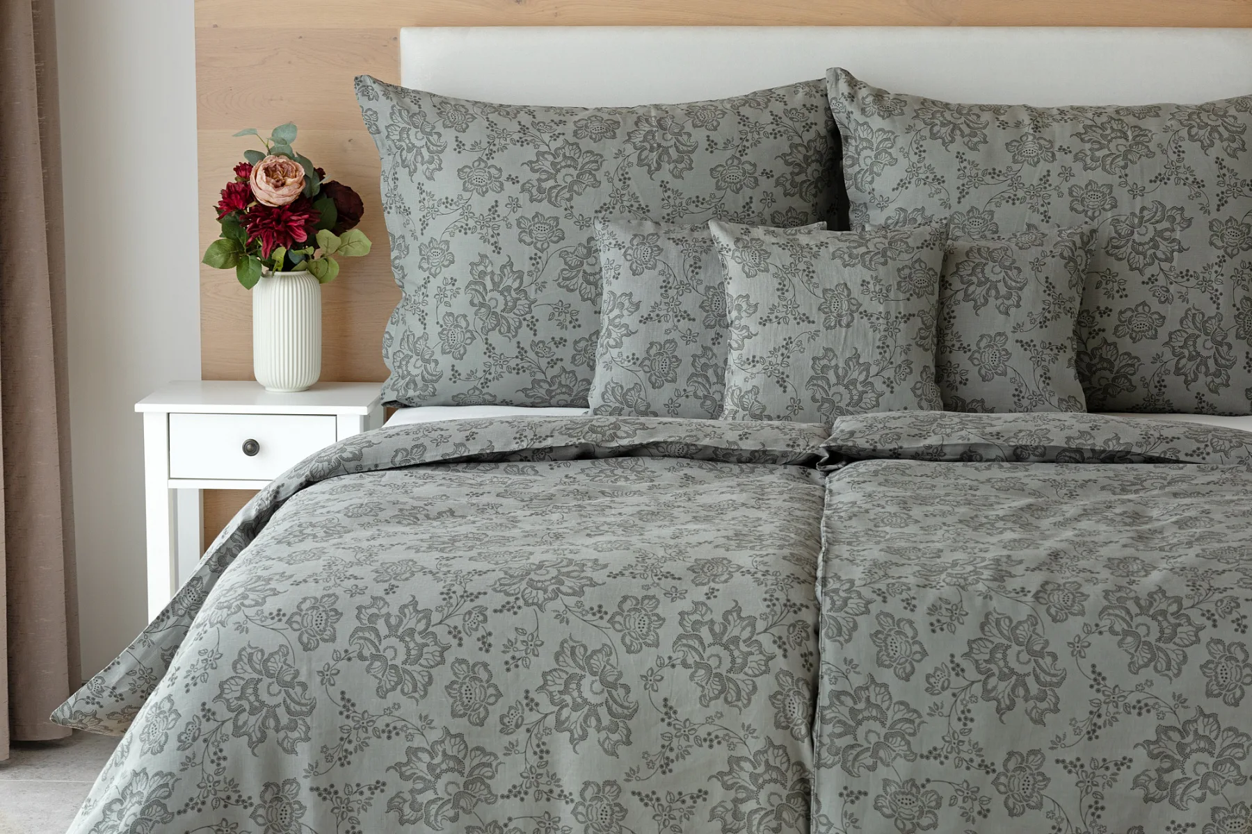 Objevte benefity jedinečného přírodního materiálu a dopřejte si nezaměnitelný komfort s naším lněným povlečením Leilani. Originální florální motiv v antracitové barvě vyniká na šédém podkladu ložního povlečení. Elegntní vzor v kombinaci s tímto ekologicky šetrným materiálem doladí k dokonalosti každý interiér s rustikálním nádechem, ale může být noblesní ozdobou i v moderně zařízené ložnici.
