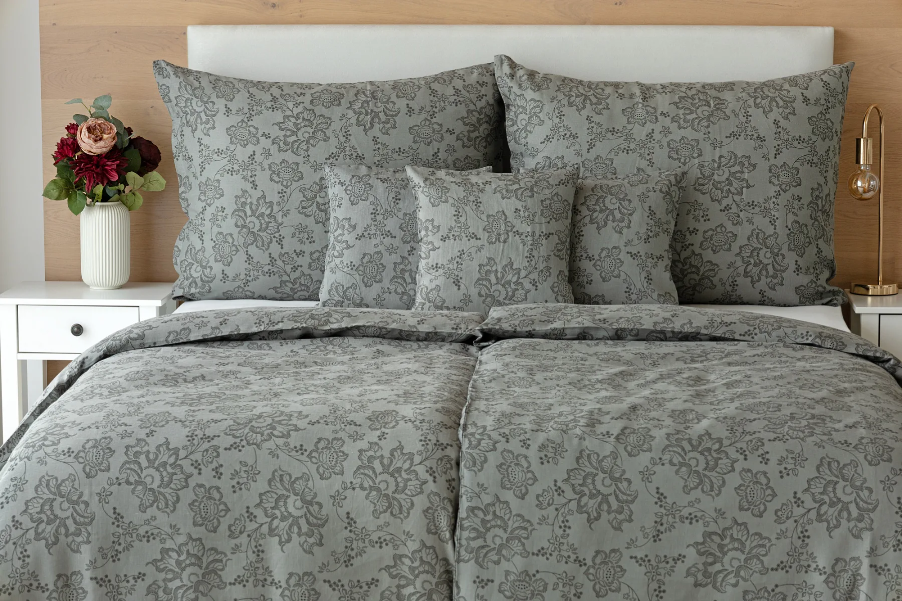 Objevte benefity jedinečného přírodního materiálu a dopřejte si nezaměnitelný komfort s naším lněným povlečením Leilani. Originální florální motiv v antracitové barvě vyniká na šédém podkladu ložního povlečení. Elegntní vzor v kombinaci s tímto ekologicky šetrným materiálem doladí k dokonalosti každý interiér s rustikálním nádechem, ale může být noblesní ozdobou i v moderně zařízené ložnici.