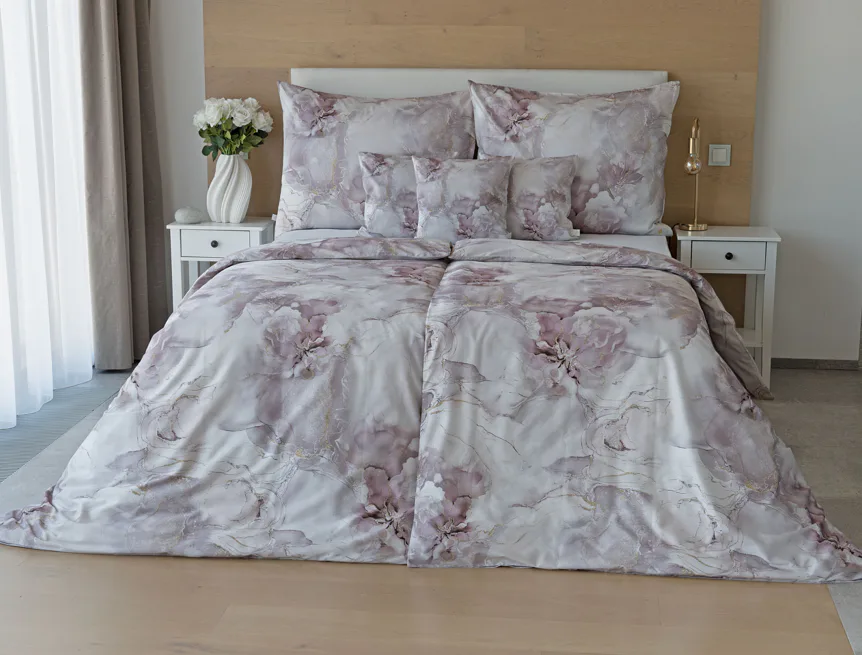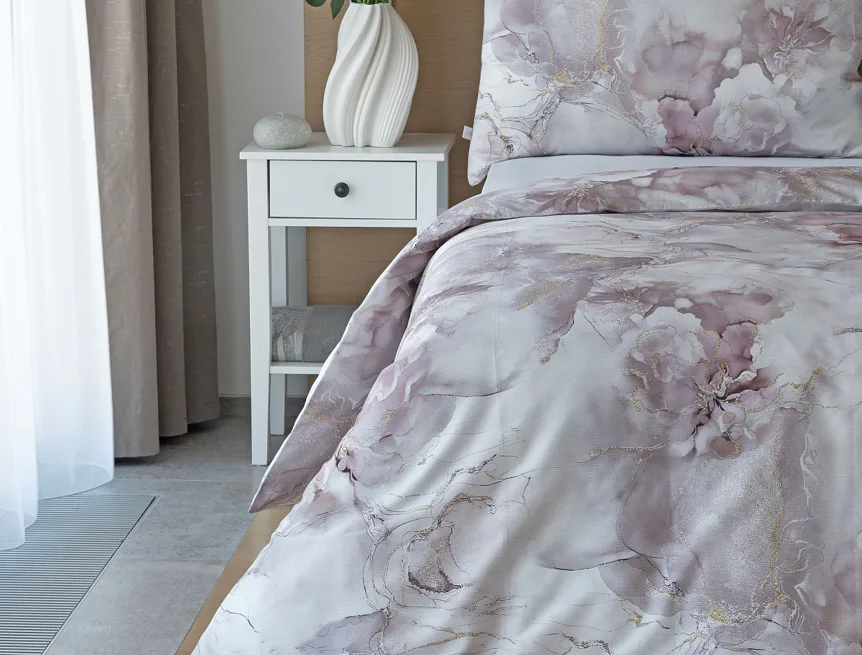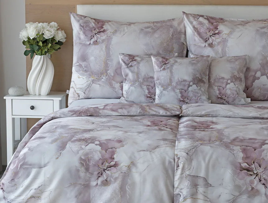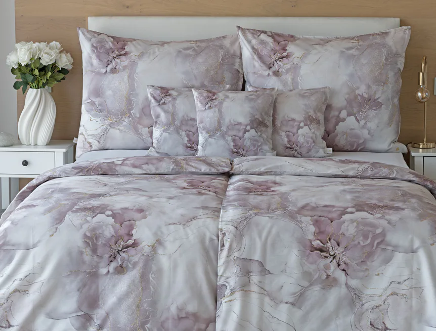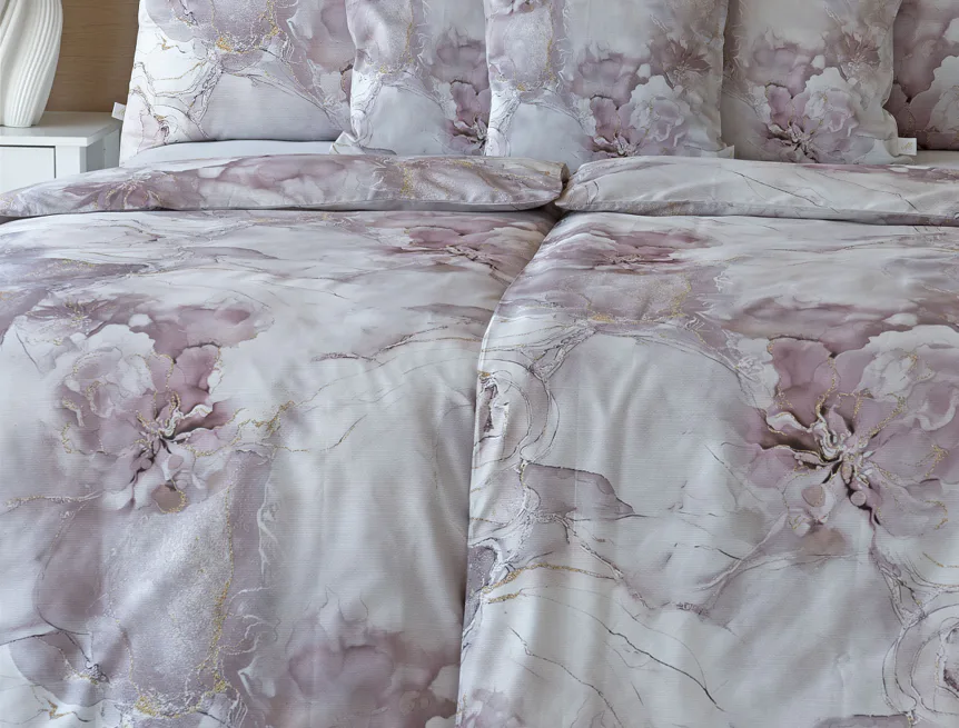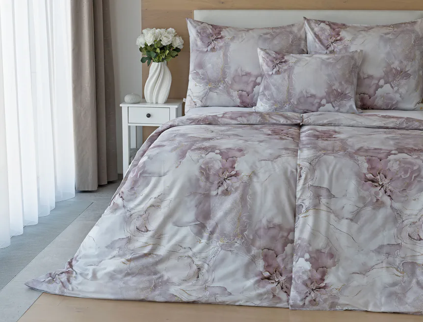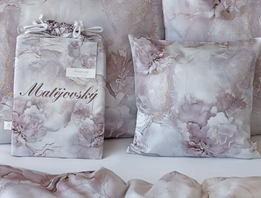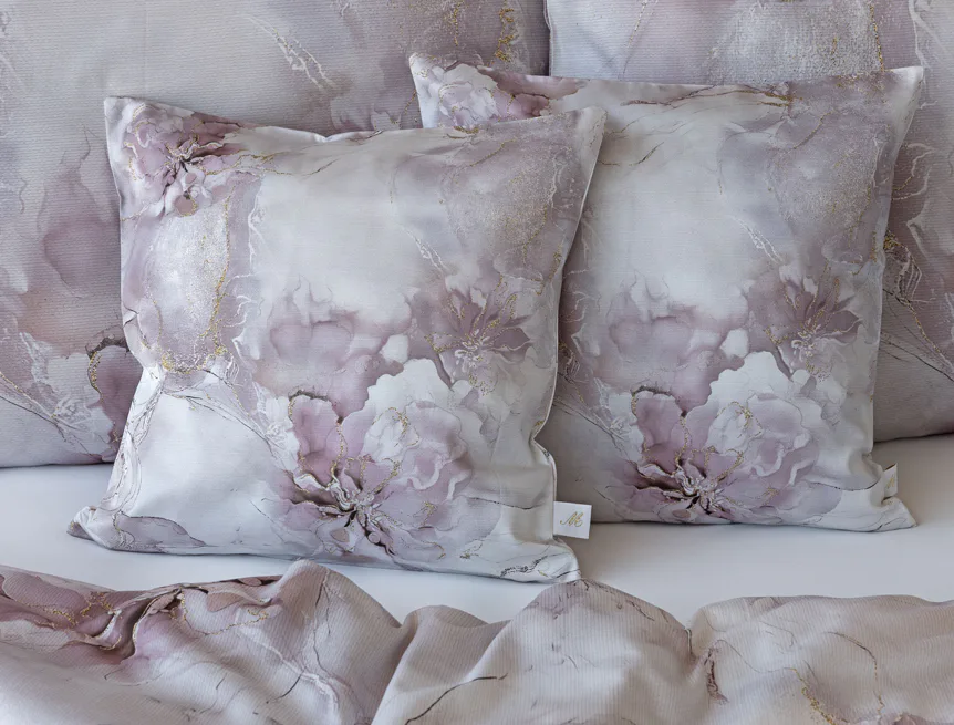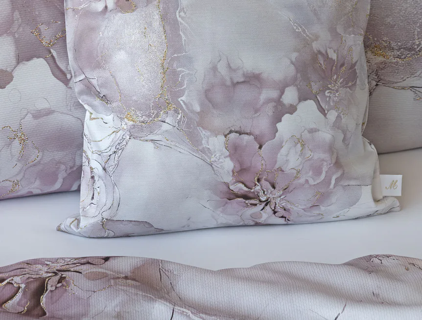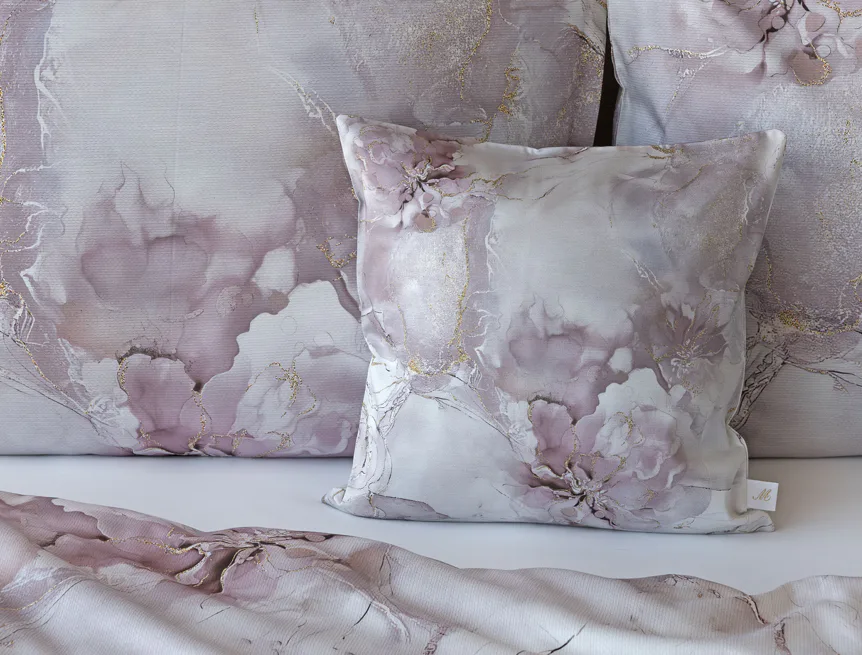 Tento elegantní vzor spojuje jemnou mramorovou kresbu s důmyslně zakomponovanými květinovými konturami. Lehké přechody v odstínech lila, starorůžové a smetanové barvy se prolínají s decentními zlatavými liniemi, které celému dezénu dodávají nádech luxusu. Povlak na polštář i na přikrývku je z obou stran stejný, vrchní stranu povlaku na polštář zdobí malé logo "M" v pravém dolním rohu. Povlečení je opatřeno komfortním zipovým uzávěrem.