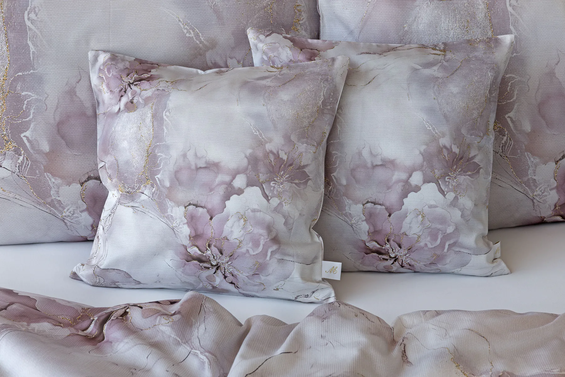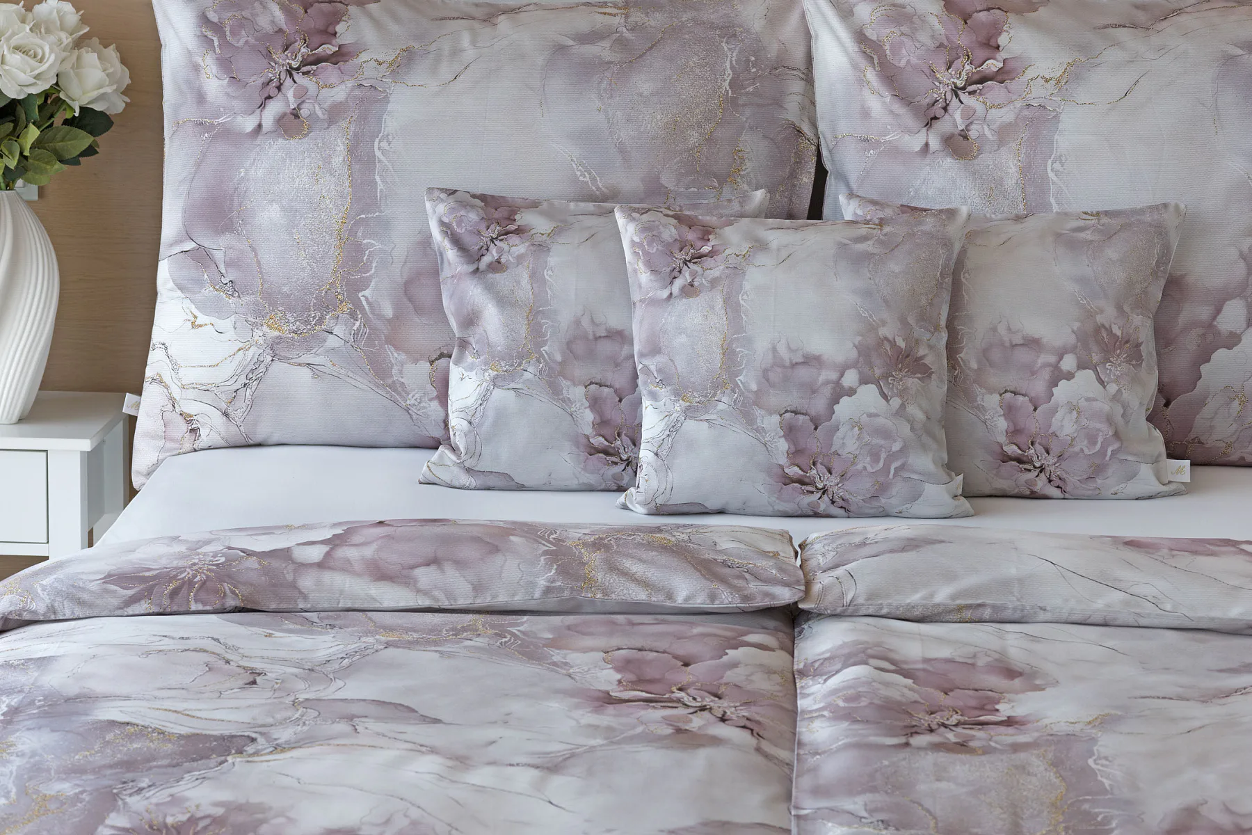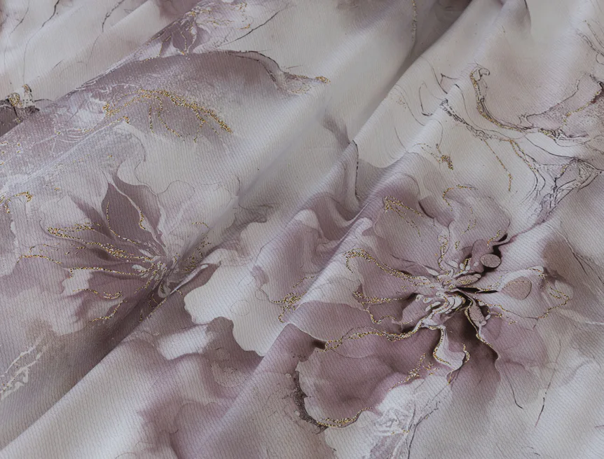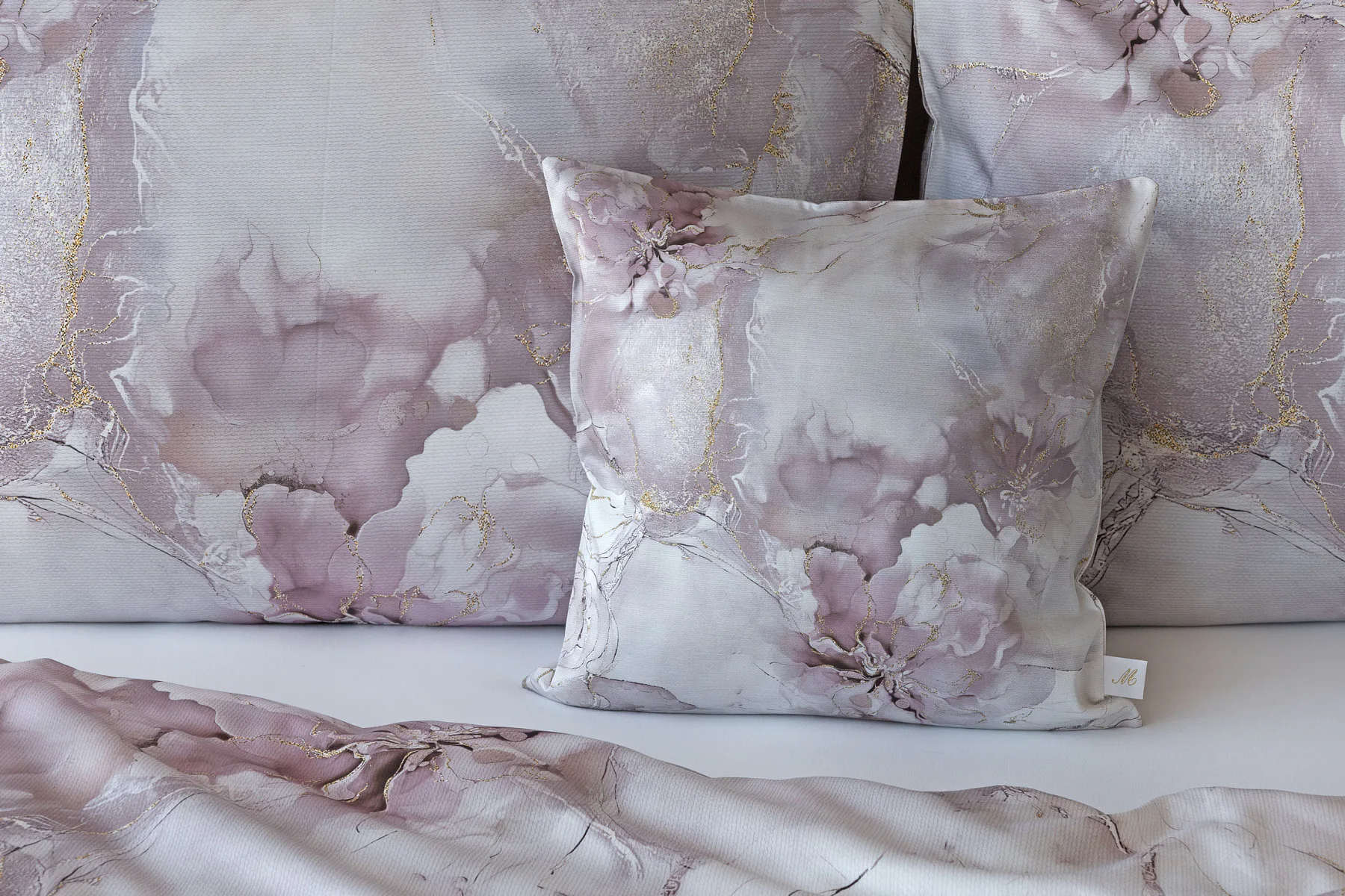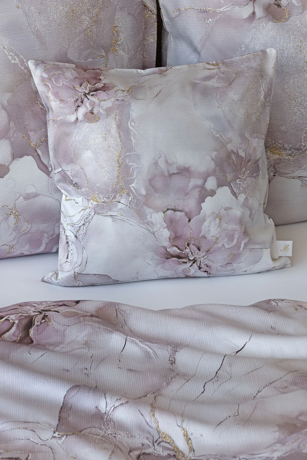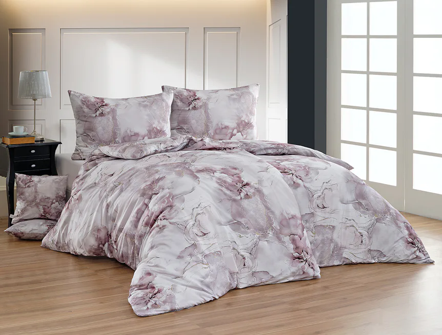 Tento elegantní vzor spojuje jemnou mramorovou kresbu s důmyslně zakomponovanými květinovými konturami. Lehké přechody v odstínech lila, starorůžové a smetanové barvy se prolínají s decentními zlatavými liniemi, které celému dezénu dodávají nádech luxusu. Povlak na polštář i na přikrývku je z obou stran stejný, vrchní stranu povlaku na polštář zdobí malé logo "M" v pravém dolním rohu. Povlečení je opatřeno komfortním zipovým uzávěrem.