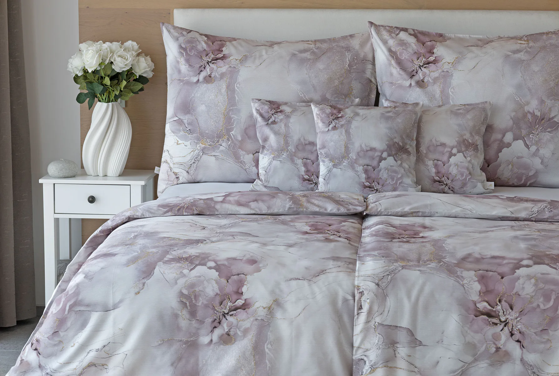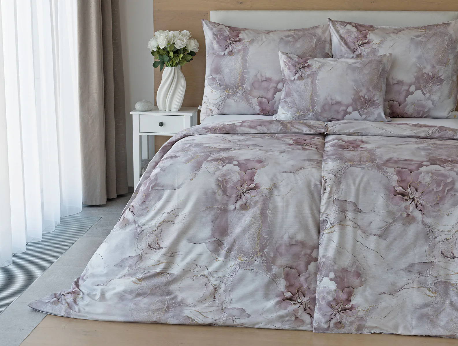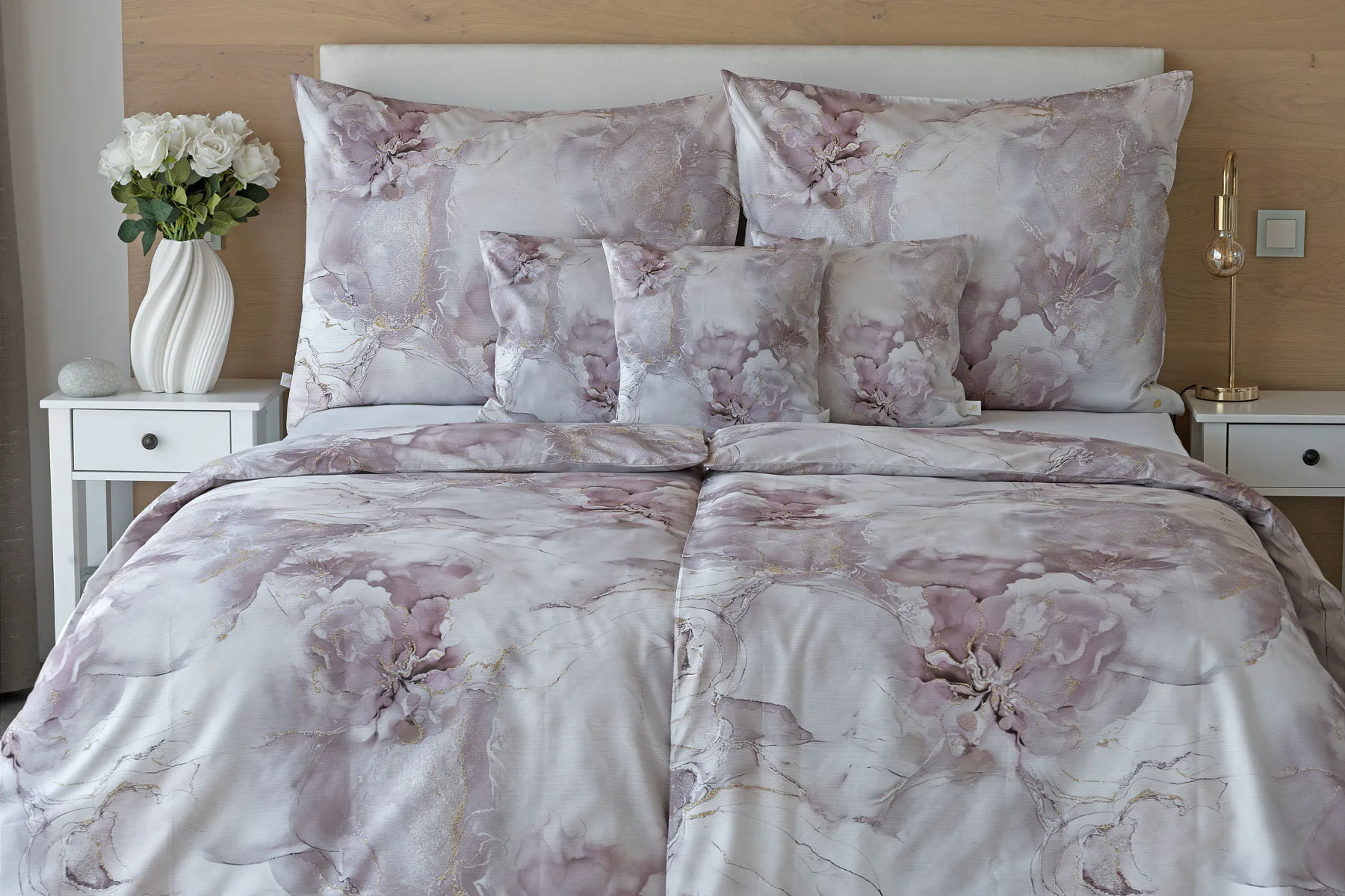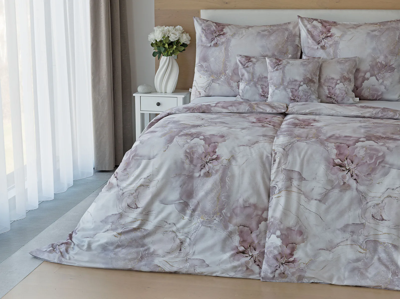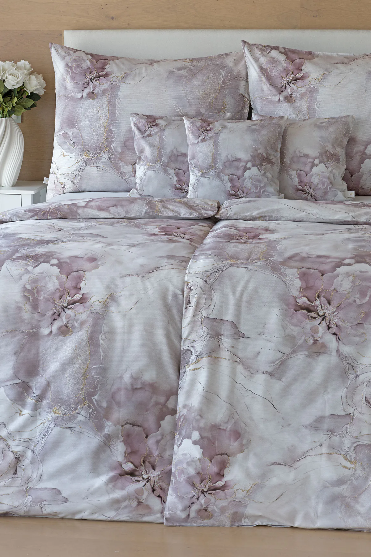Tento elegantní vzor spojuje jemnou mramorovou kresbu s důmyslně zakomponovanými květinovými konturami. Lehké přechody v odstínech lila, starorůžové a smetanové barvy se prolínají s decentními zlatavými liniemi, které celému dezénu dodávají nádech luxusu. Povlak na polštář i na přikrývku je z obou stran stejný, vrchní stranu povlaku na polštář zdobí malé logo "M" v pravém dolním rohu. Povlečení je opatřeno komfortním zipovým uzávěrem.