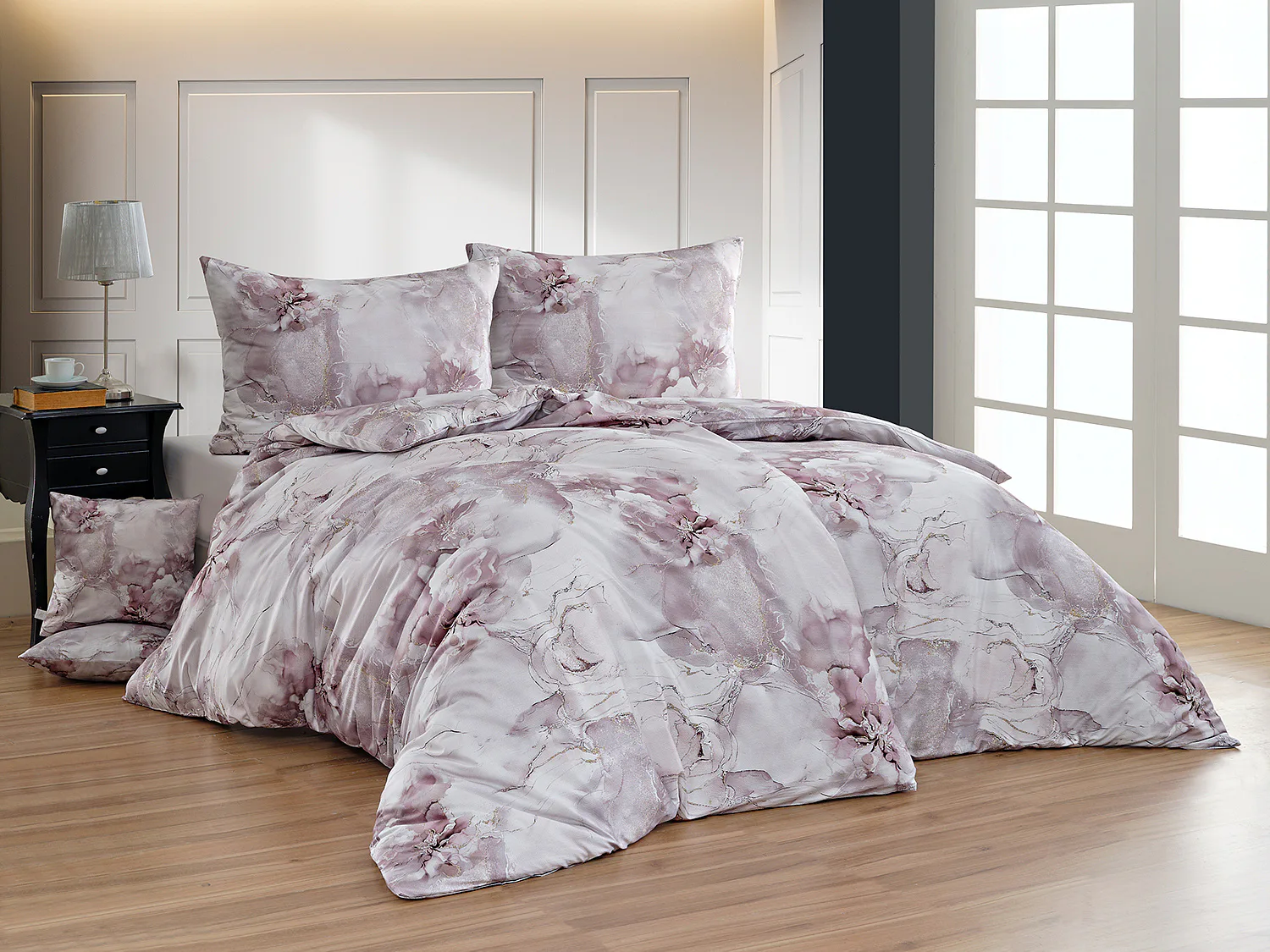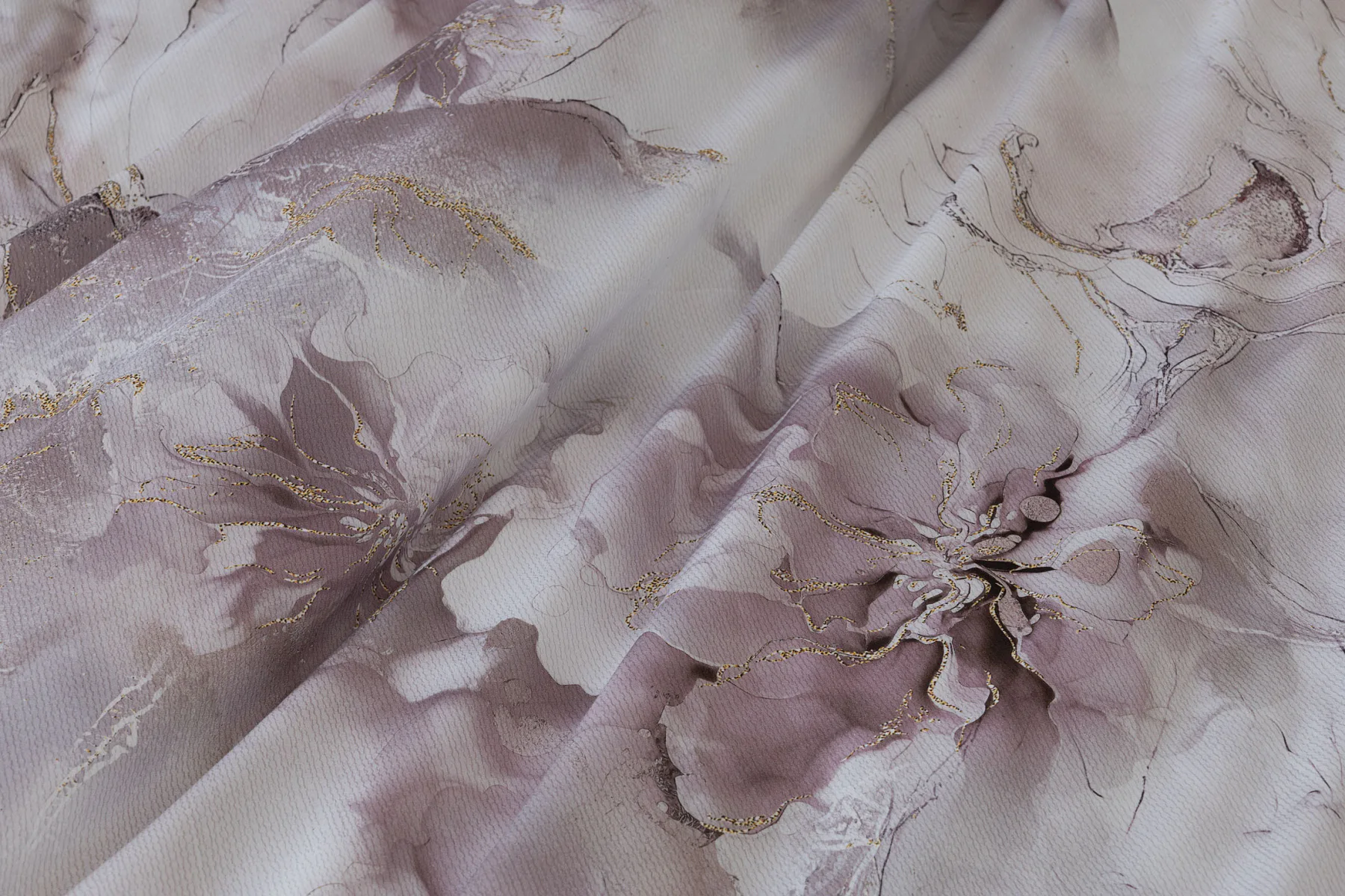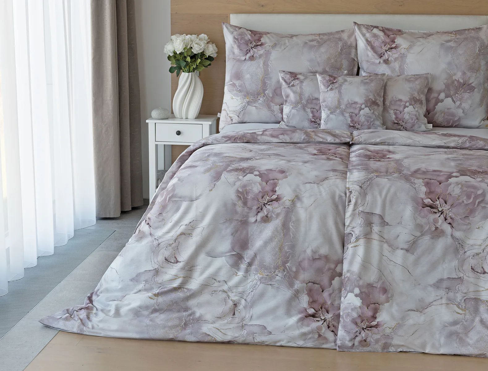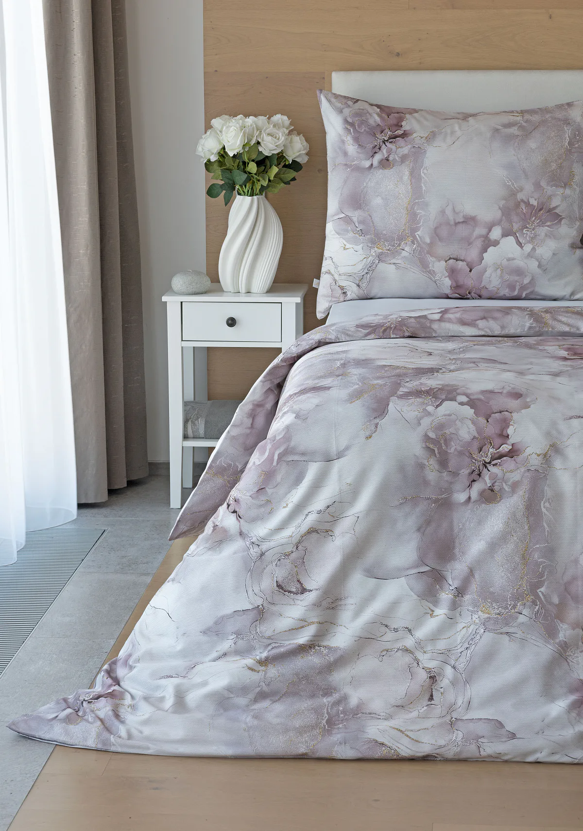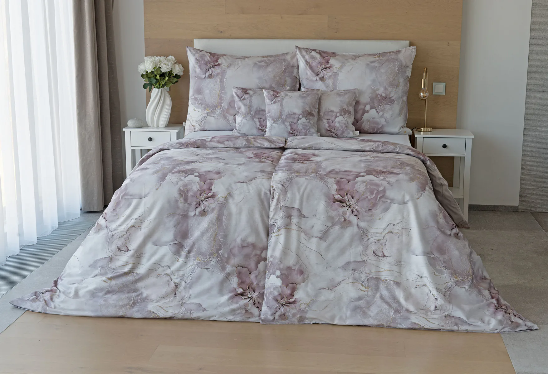 Tento elegantní vzor spojuje jemnou mramorovou kresbu s důmyslně zakomponovanými květinovými konturami. Lehké přechody v odstínech lila, starorůžové a smetanové barvy se prolínají s decentními zlatavými liniemi, které celému dezénu dodávají nádech luxusu. Povlak na polštář i na přikrývku je z obou stran stejný, vrchní stranu povlaku na polštář zdobí malé logo "M" v pravém dolním rohu. Povlečení je opatřeno komfortním zipovým uzávěrem.