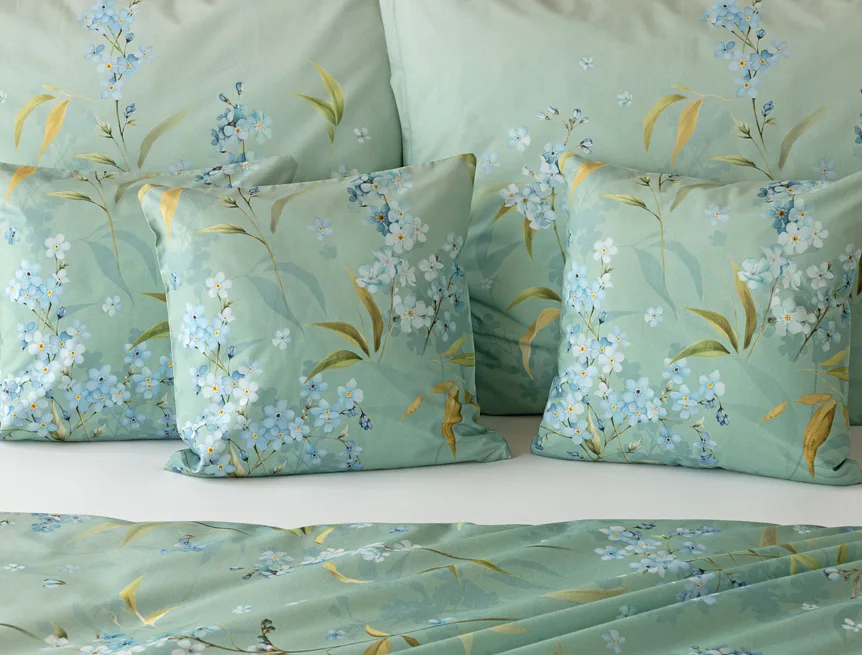 S bavlněným povlečením Libby získá vaše ložnice nádech svěžesti, romantiky a nostalgie. Něžný motiv pomněnek je v dokonalé harmonii se zelenomodrým podkladem, který je navíc ozvláštněn ombré efektem. Tento něžný květinový skvost si zamilujete.