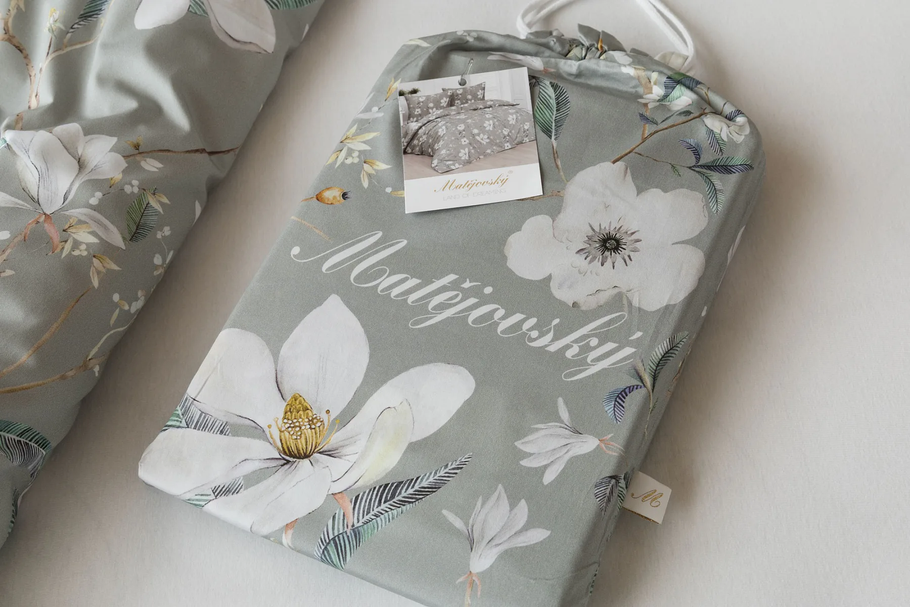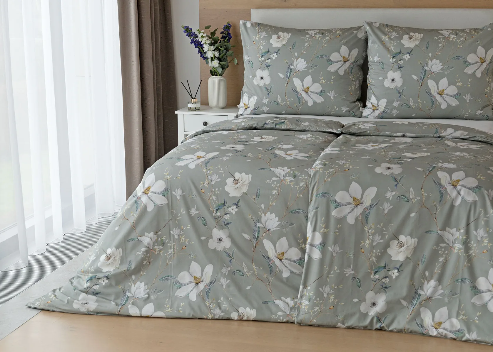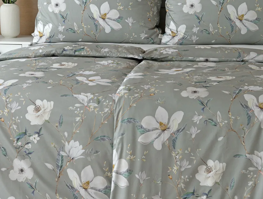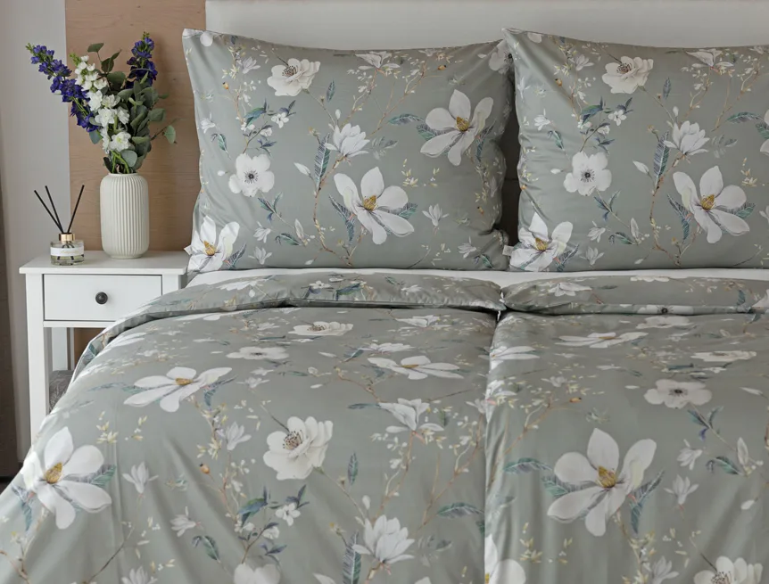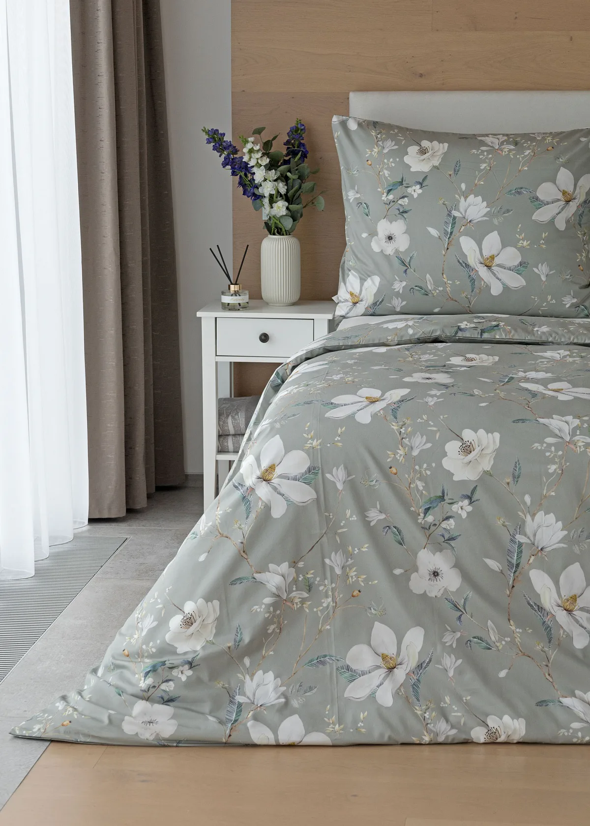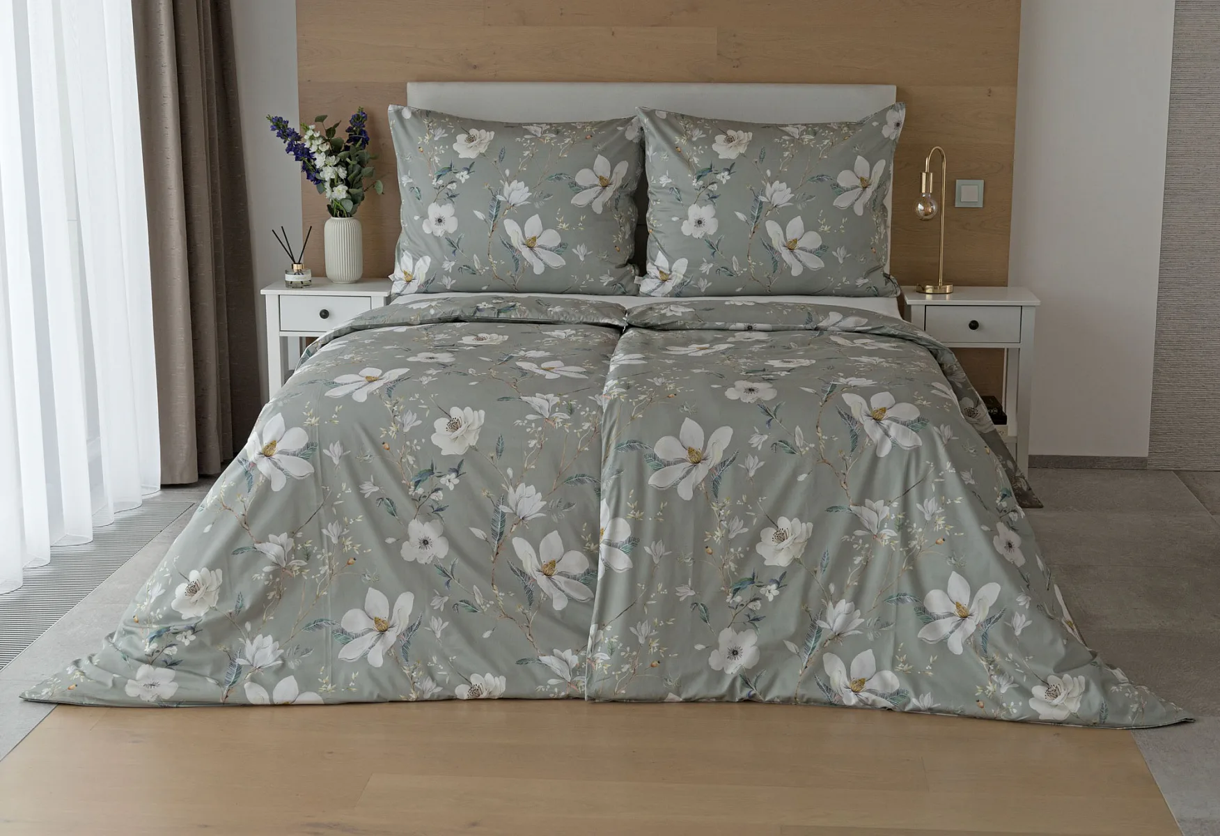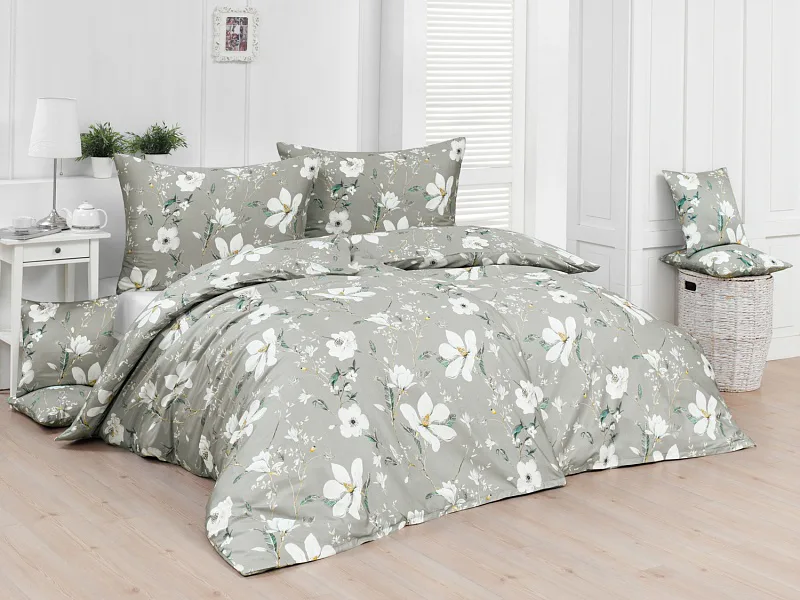Elegantní květinový vzor ložního povlečení Lilian promění vaši ložnici v okouzlující místo a postará se o váš pohodlný spánek díky prvotřídnímu bavlněnému mako saténu. Větší a menší květy v bílé barvě vynikají na šedém podkladu s jemným zeleným podtónem.