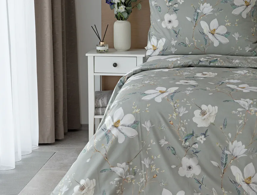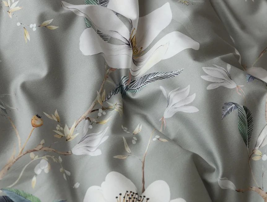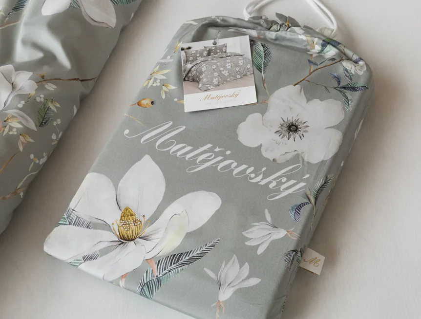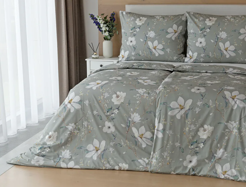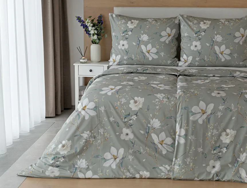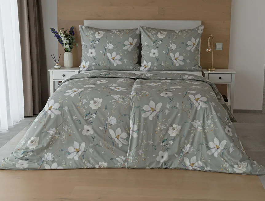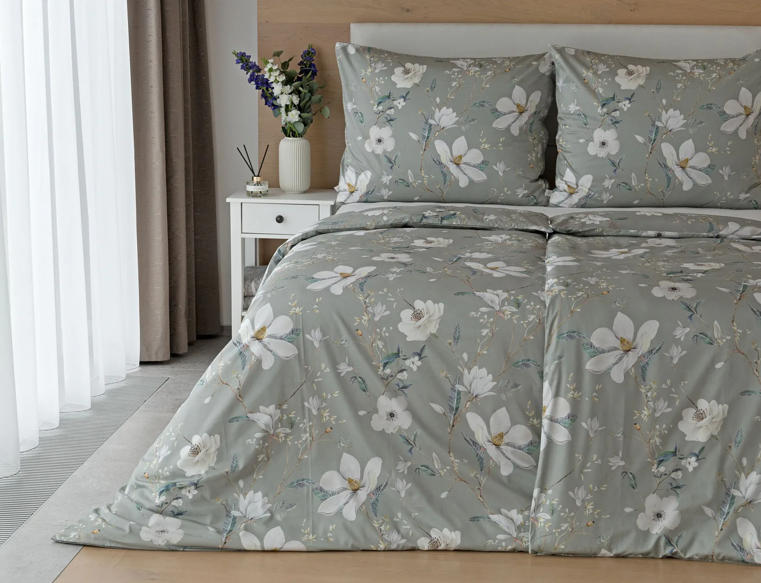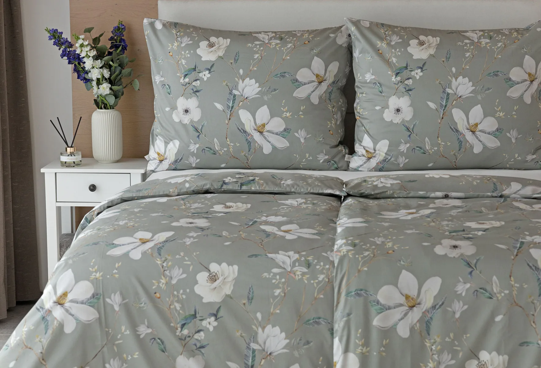 Elegantní květinový vzor ložního povlečení Lilian promění vaši ložnici v okouzlující místo a postará se o váš pohodlný spánek díky prvotřídnímu bavlněnému mako saténu. Větší a menší květy v bílé barvě vynikají na šedém podkladu s jemným zeleným podtónem.