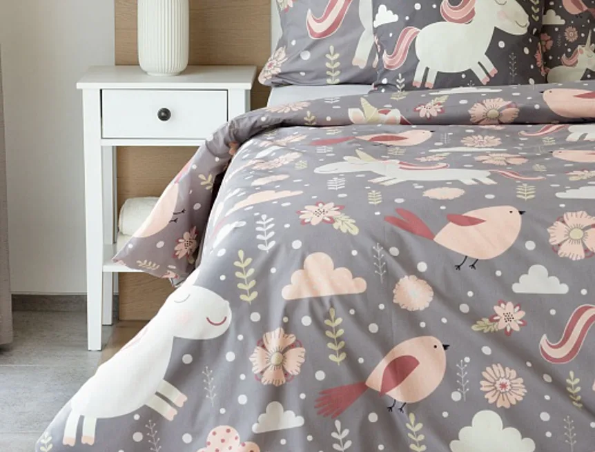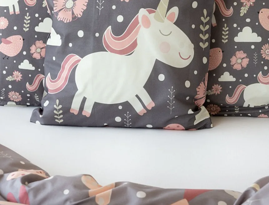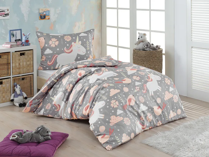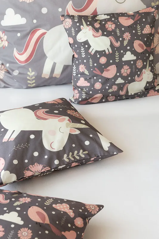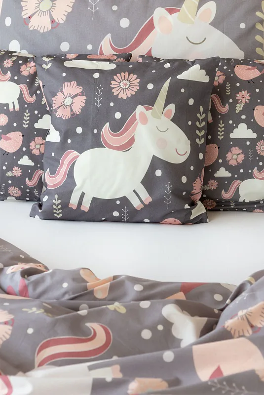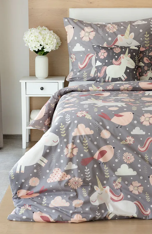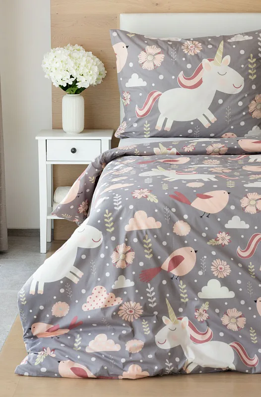 Něžné povlečení Lily se postará o pohádkové snění všech malých princezen. Jemným pastelovým barvám vévodí odstíny světle růžové, tmavě malinové, krémově šedé a bílé barvy, které vynikají na mimořádně příjemném materiálu v provedení 100% bavlny deluxe. Oblíbený motiv bájných jednorožců doplňují ilustrace obláčků, kytiček a roztomilých ptáčků.