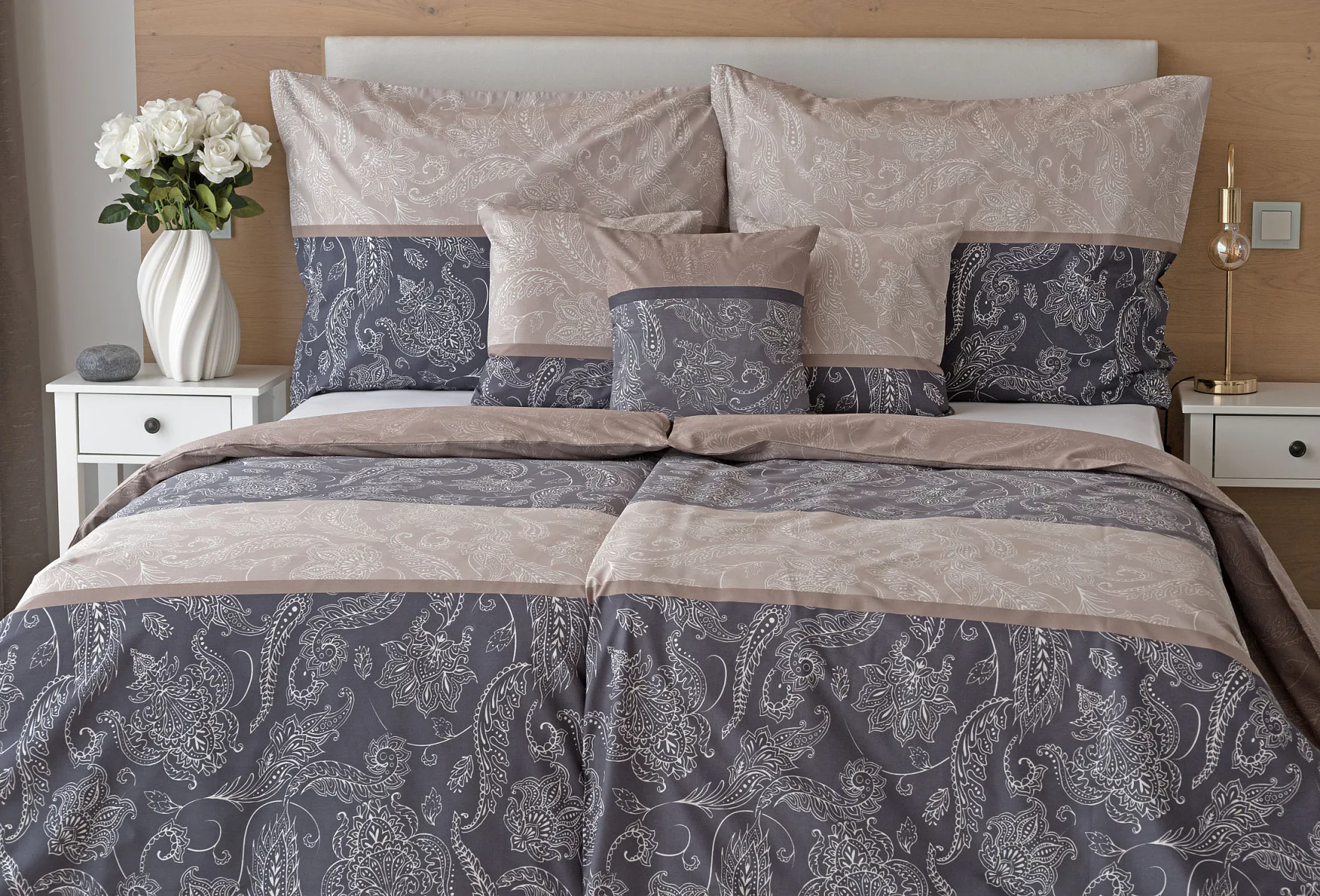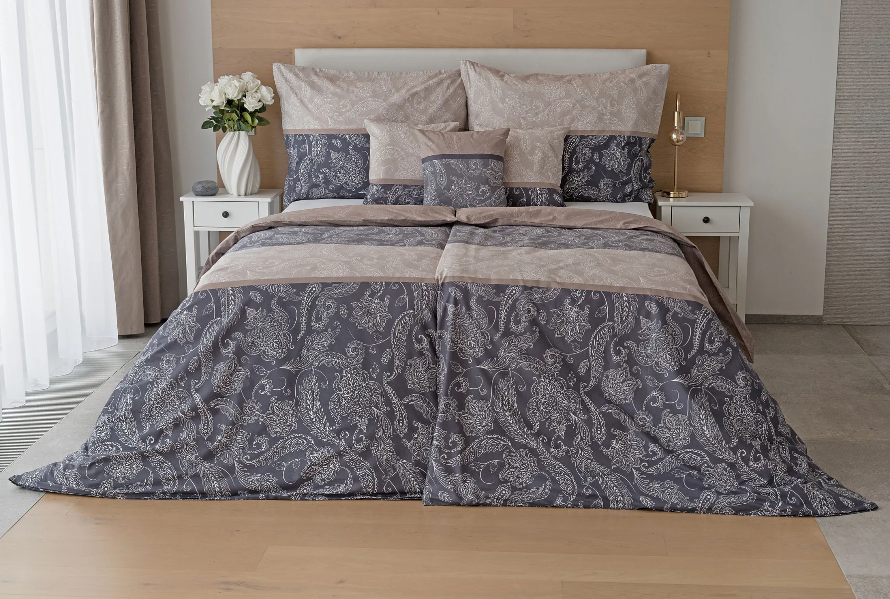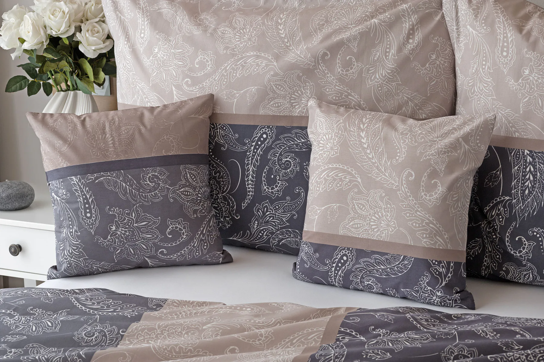 Vneste do své ložnice harmonii, eleganci a nadčasový půvab s bavlněným ložním povlečením Lior, zdobeným klasickým paisley motivem. Ornamentální vzor vyniká svou jemnou kresbou a dokonale ladí jak s moderním, tak s tradičním interiérem. Podklad povlečení tvoří oblíbené hřejivé tóny přírodní béžové a šedé barvy.