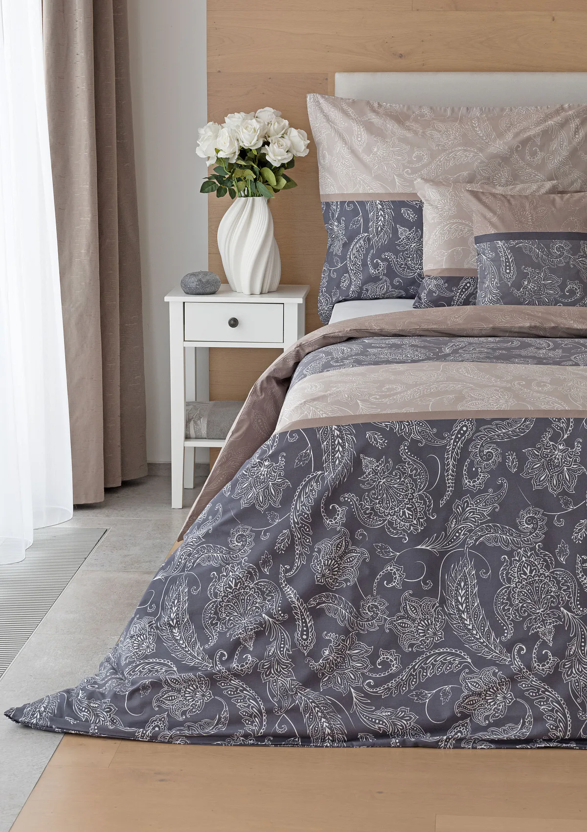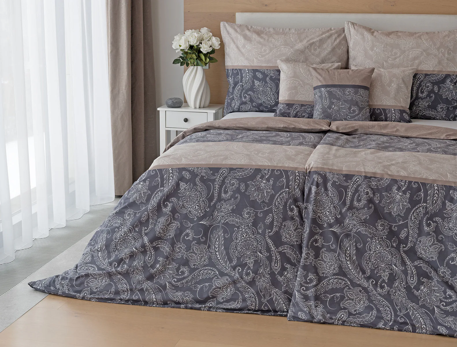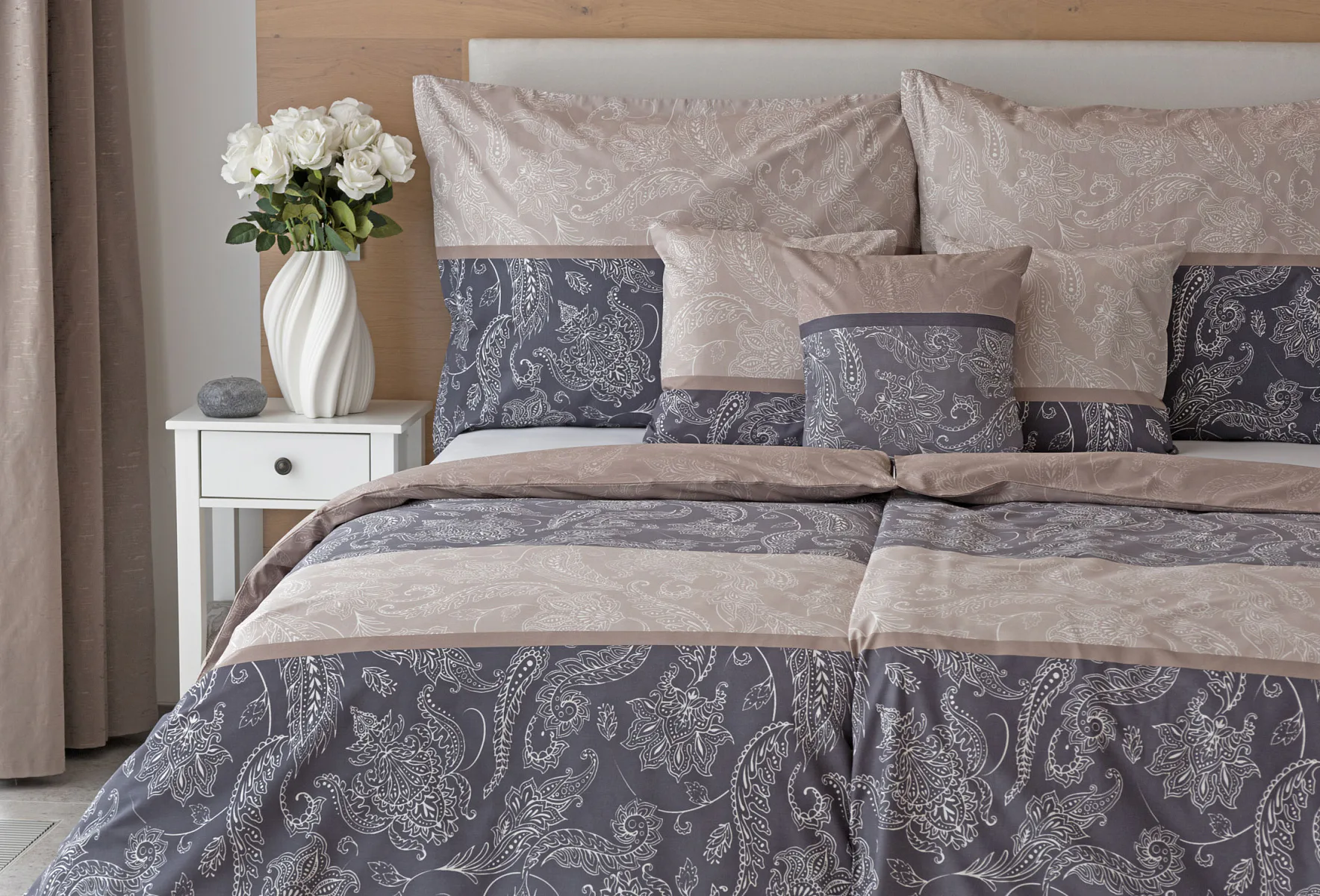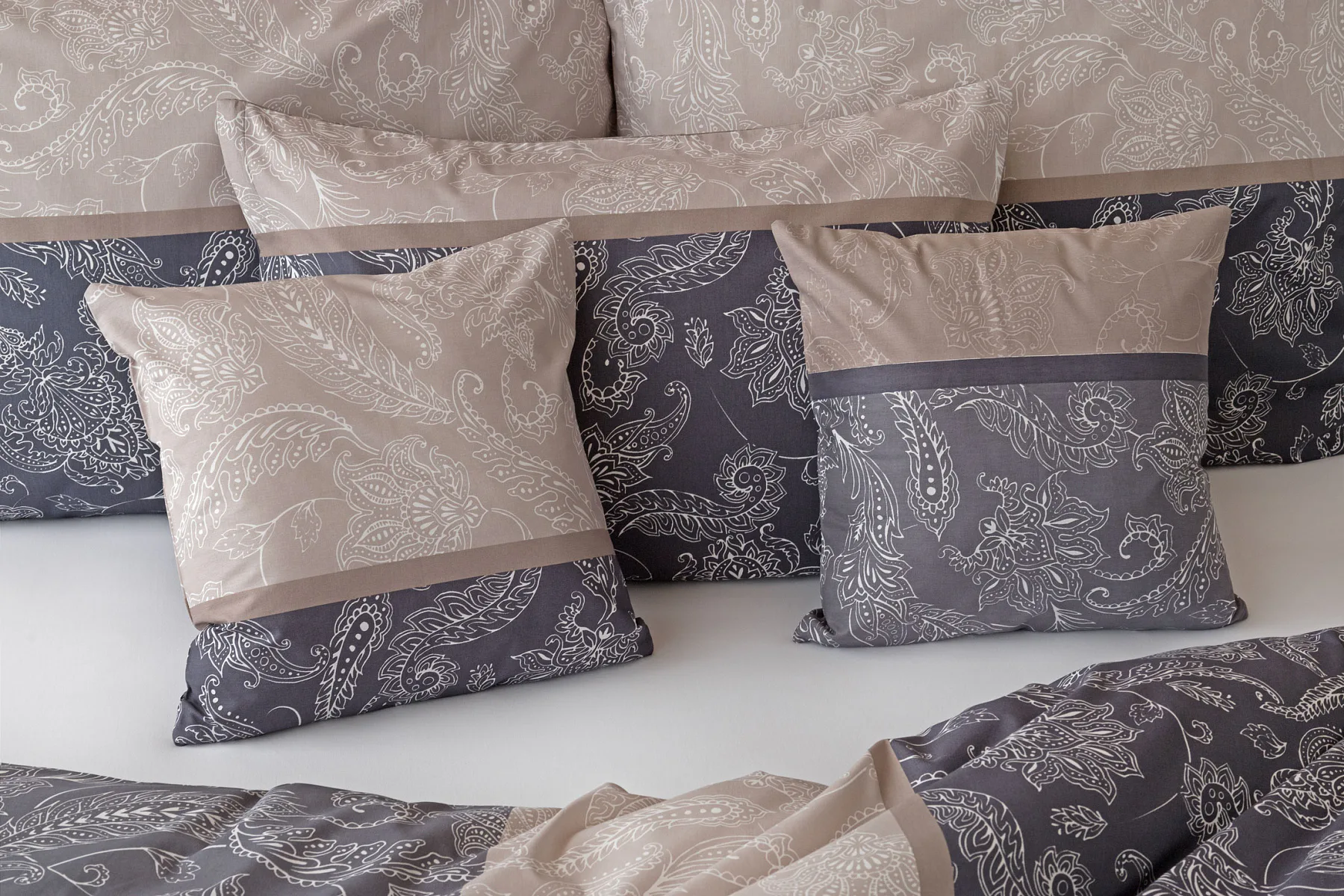 Vneste do své ložnice harmonii, eleganci a nadčasový půvab s bavlněným ložním povlečením Lior, zdobeným klasickým paisley motivem. Ornamentální vzor vyniká svou jemnou kresbou a dokonale ladí jak s moderním, tak s tradičním interiérem. Podklad povlečení tvoří oblíbené hřejivé tóny přírodní béžové a šedé barvy.