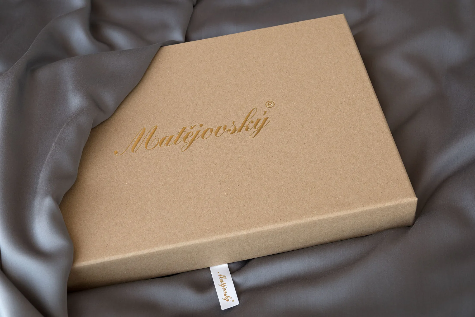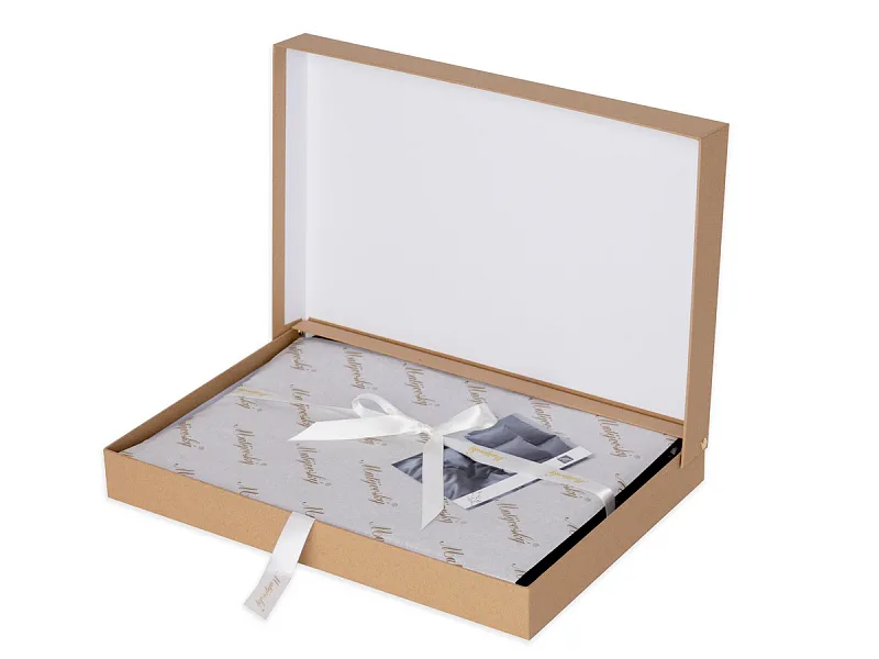 Povlečení je dodáváno v luxusní dárkové krabici (v případě dvou stejných setů baleno v jedné krabici jako sada povlečení na manželské lůžko). Obal z přírodních surovin podtrhuje jedinečnost tohoto 100% přírodního produktu.
