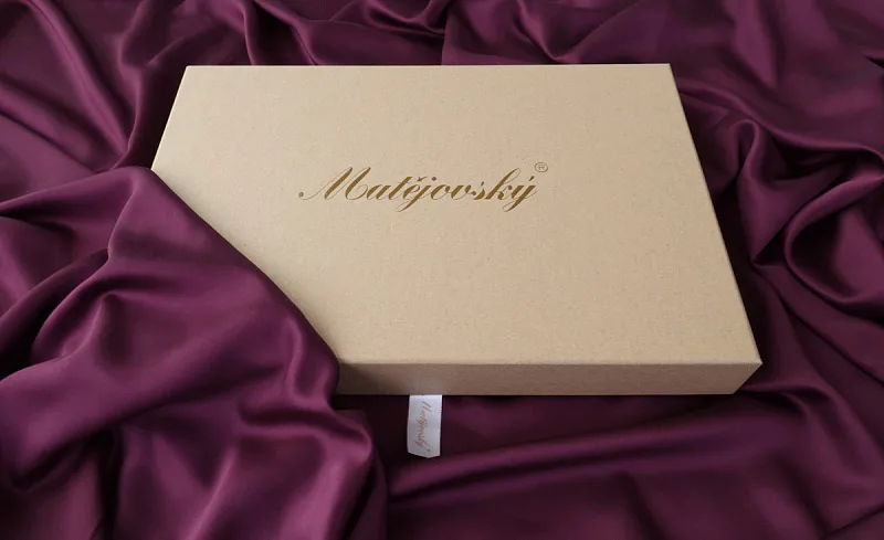 Povlečení je dodáváno v luxusní dárkové krabici (v případě dvou stejných setů baleno v jedné krabici jako sada povlečení na manželské lůžko). Obal z přírodních surovin podtrhuje jedinečnost tohoto 100% přírodního produktu.