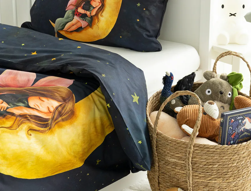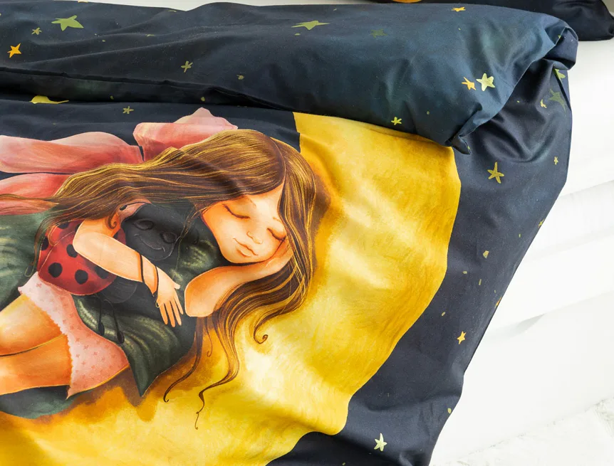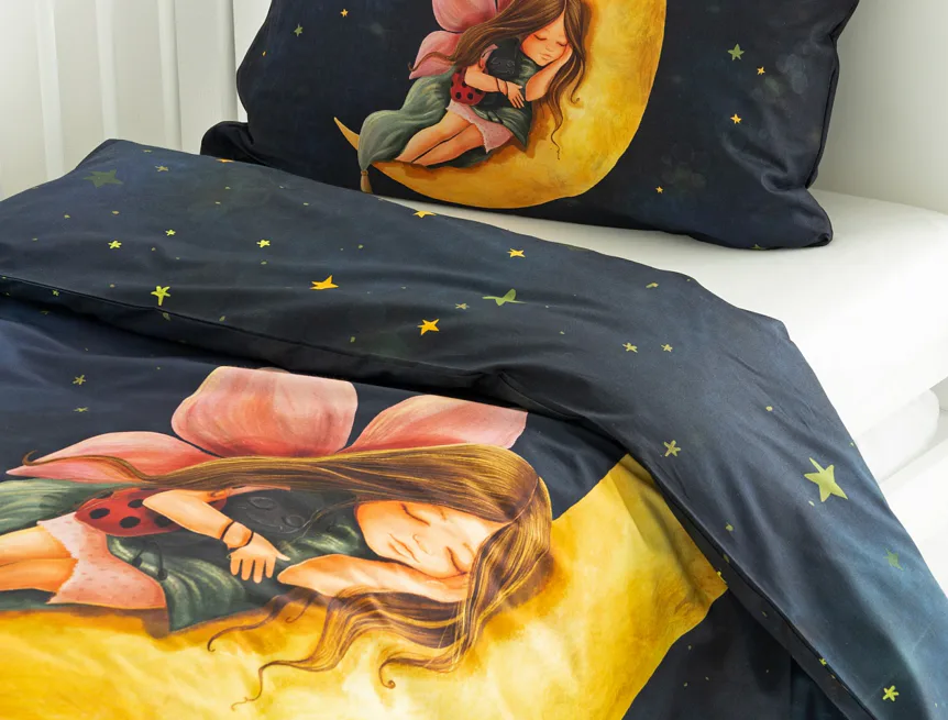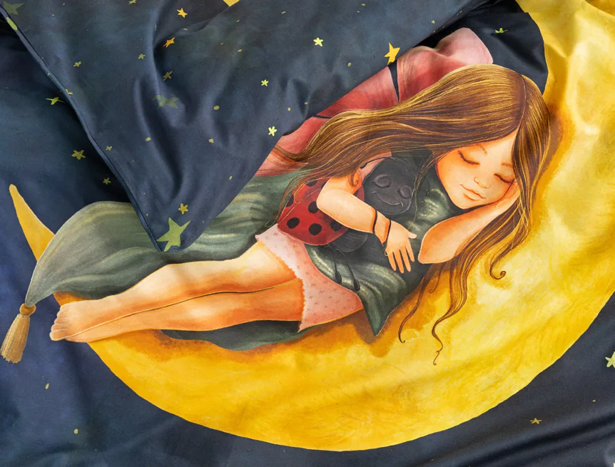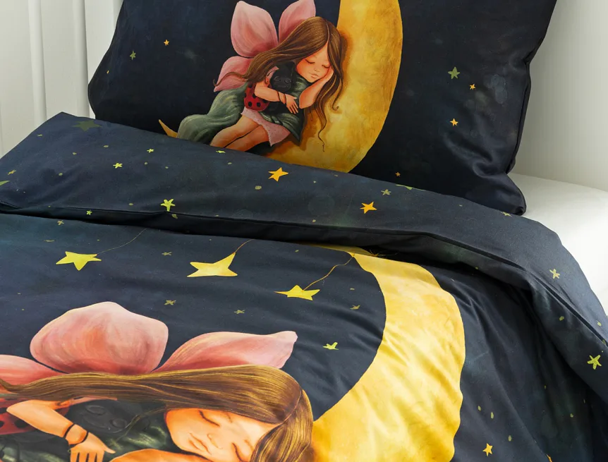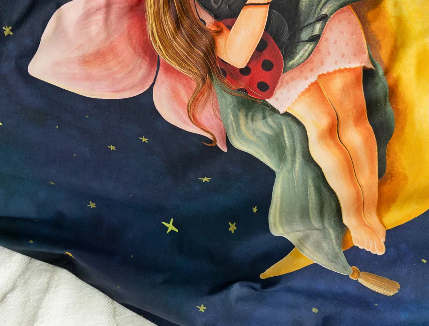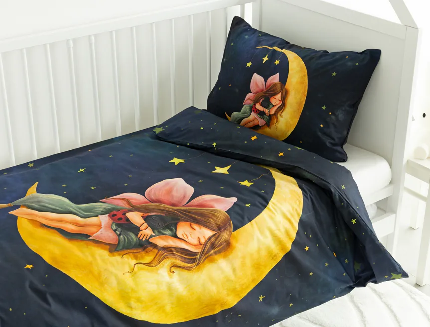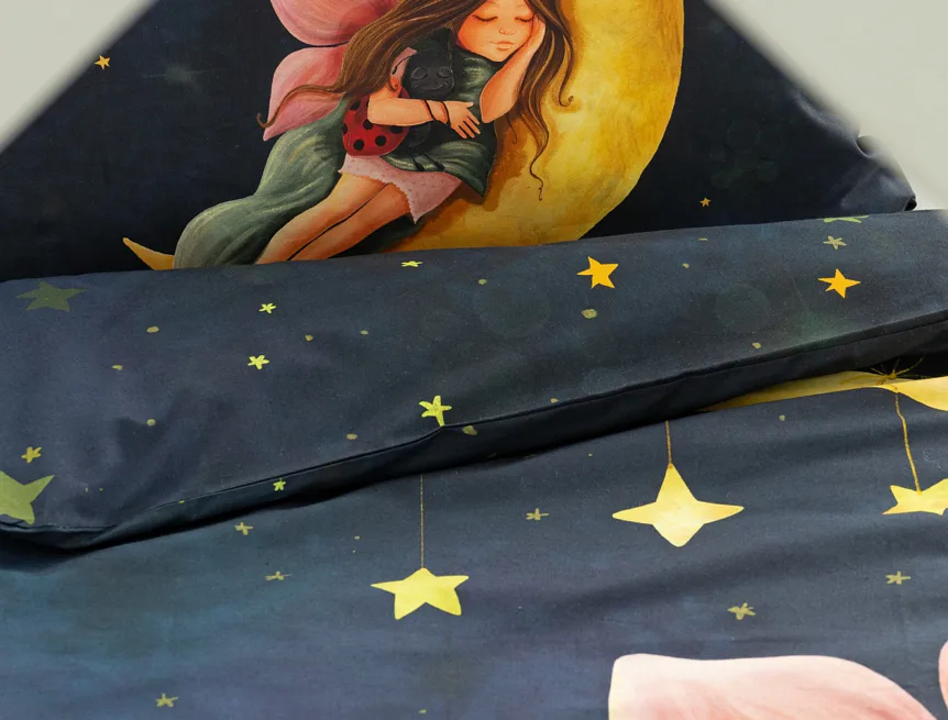 Proměňte dětský pokojíček v kouzelnou říši s bavlněným povlečením Malá víla. Motiv víly spící na měsíci, obklopené hvězdnou oblohou, vnese do dětského pokoje magickou atmosféru. Povlečení je vyrobeno ze 100% prémiové bavlny v úpravě DELUXE, která je jemná na dotek a prodyšná.