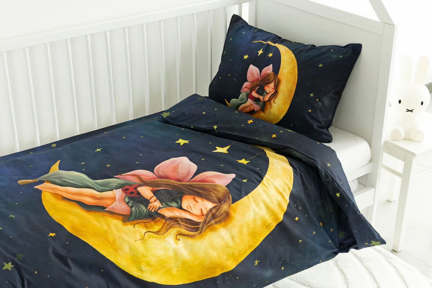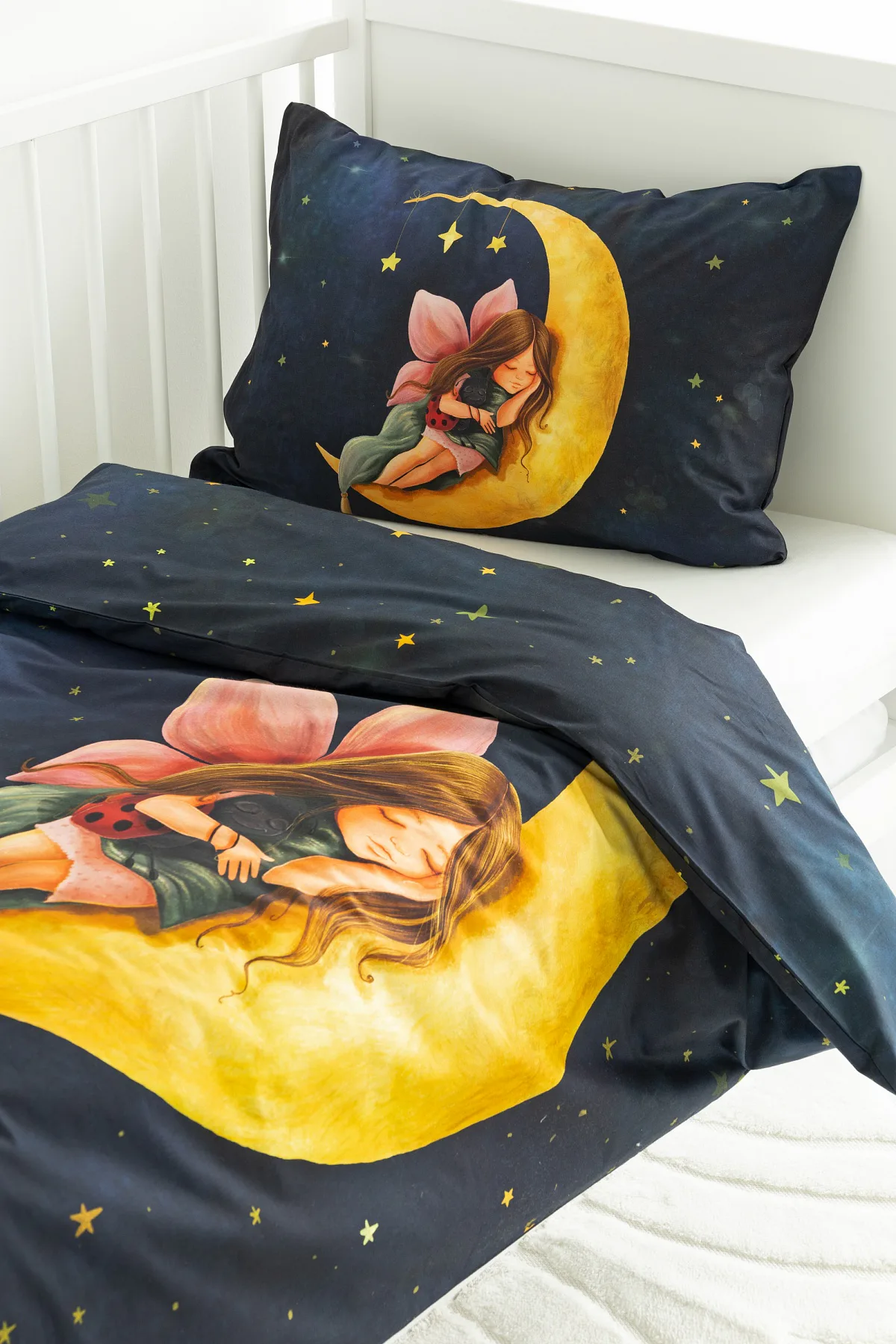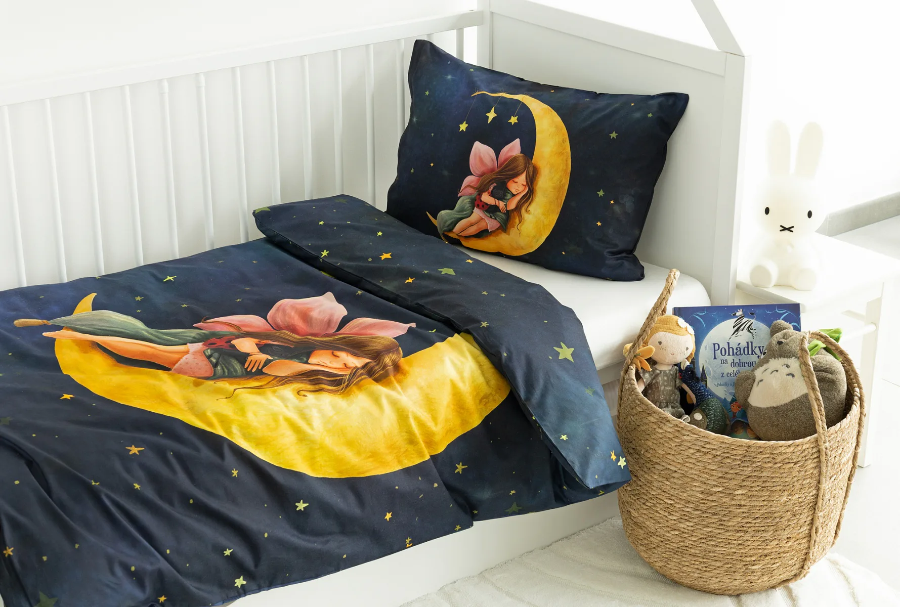 Proměňte dětský pokojíček v kouzelnou říši s bavlněným povlečením Malá víla. Motiv víly spící na měsíci, obklopené hvězdnou oblohou, vnese do dětského pokoje magickou atmosféru. Povlečení je vyrobeno ze 100% prémiové bavlny v úpravě DELUXE, která je jemná na dotek a prodyšná.
