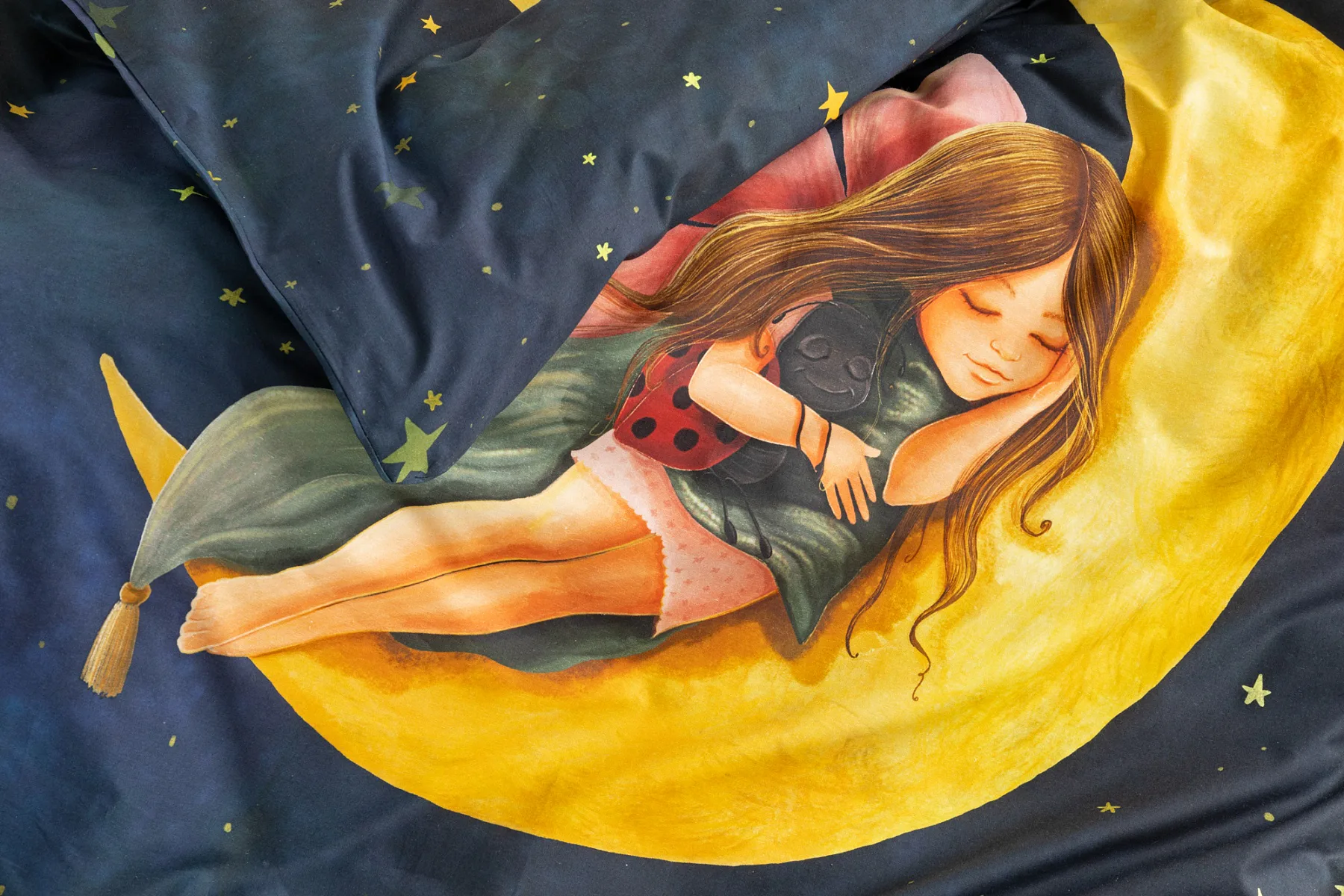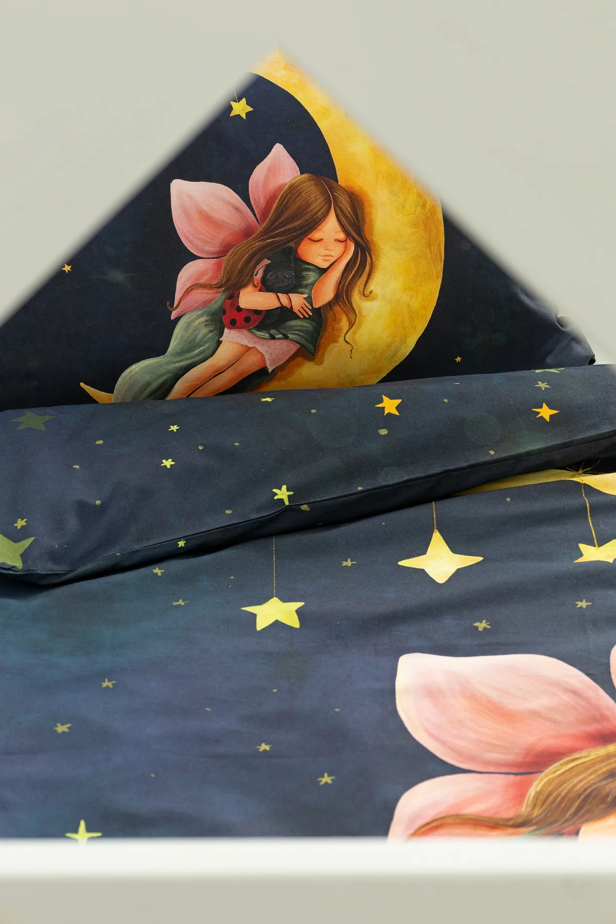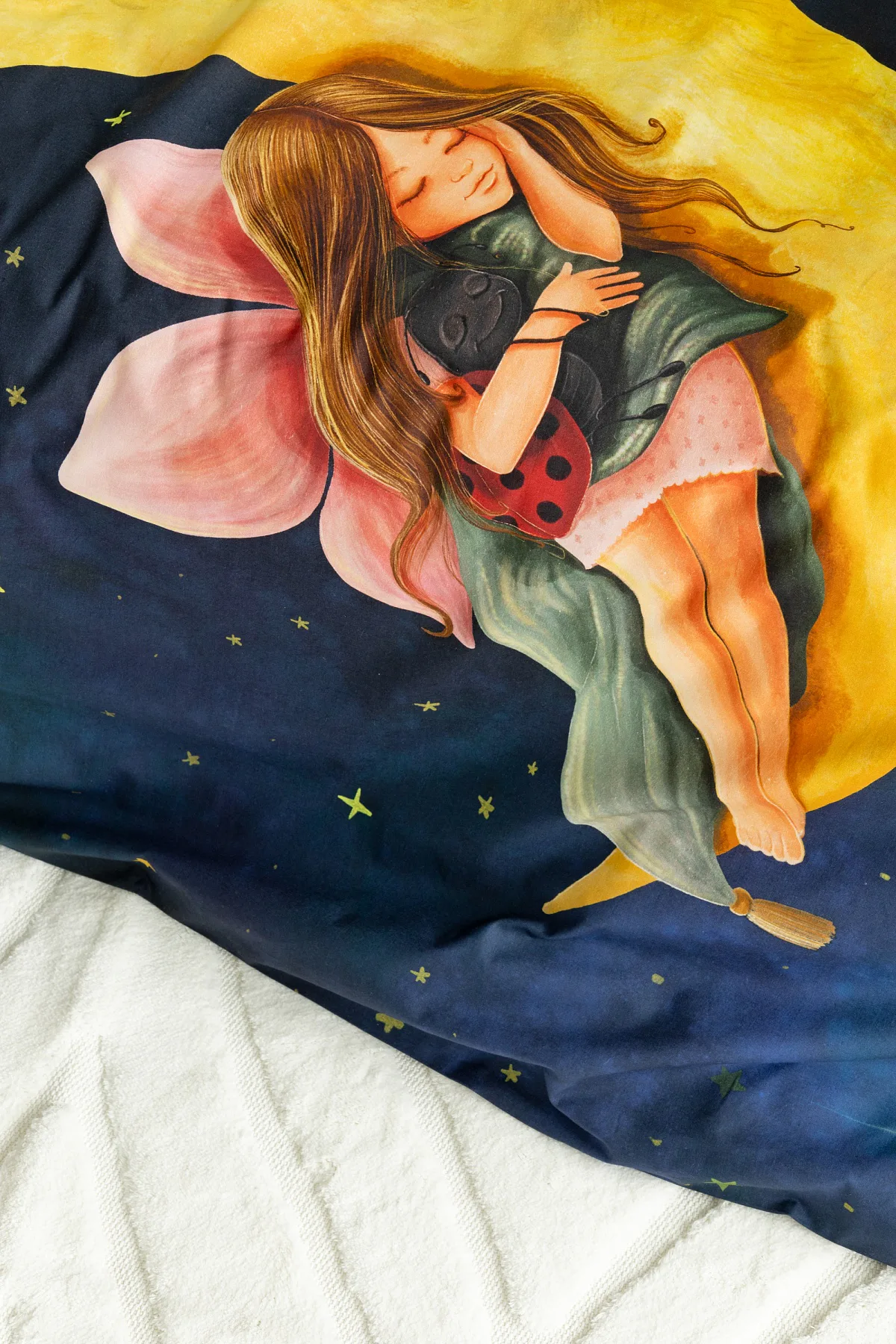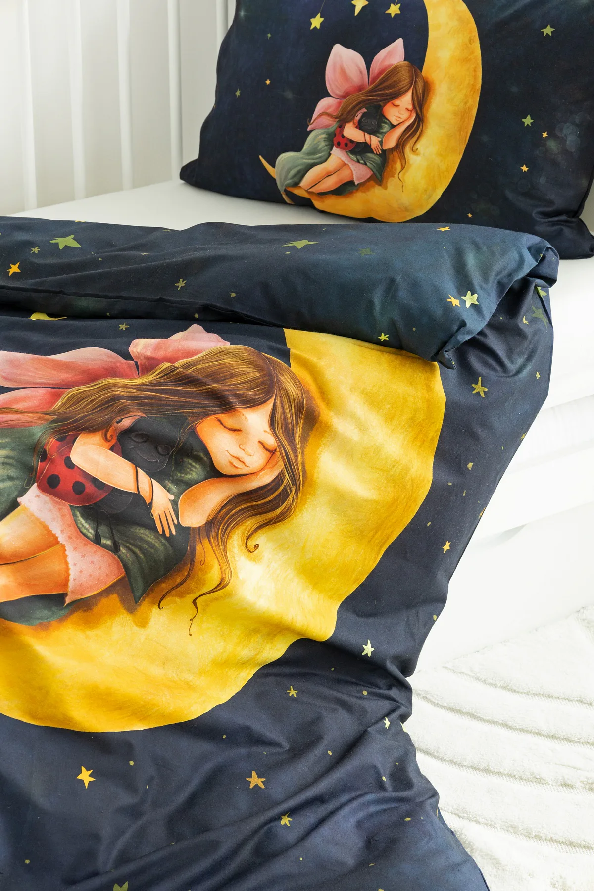 Proměňte dětský pokojíček v kouzelnou říši s bavlněným povlečením Malá víla. Motiv víly spící na měsíci, obklopené hvězdnou oblohou, vnese do dětského pokoje magickou atmosféru. Povlečení je vyrobeno ze 100% prémiové bavlny v úpravě DELUXE, která je jemná na dotek a prodyšná.