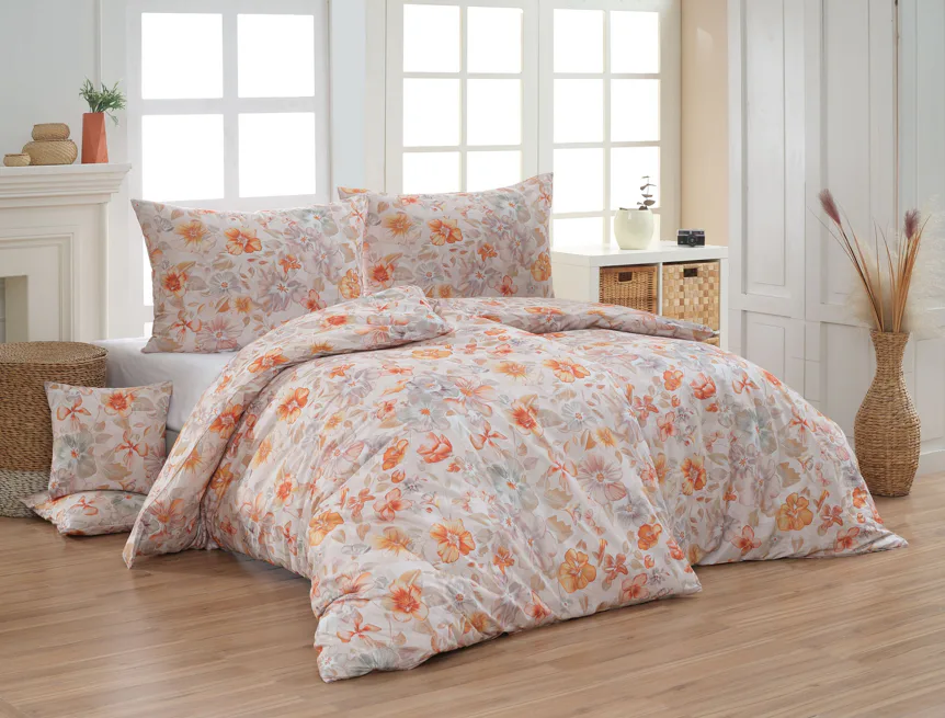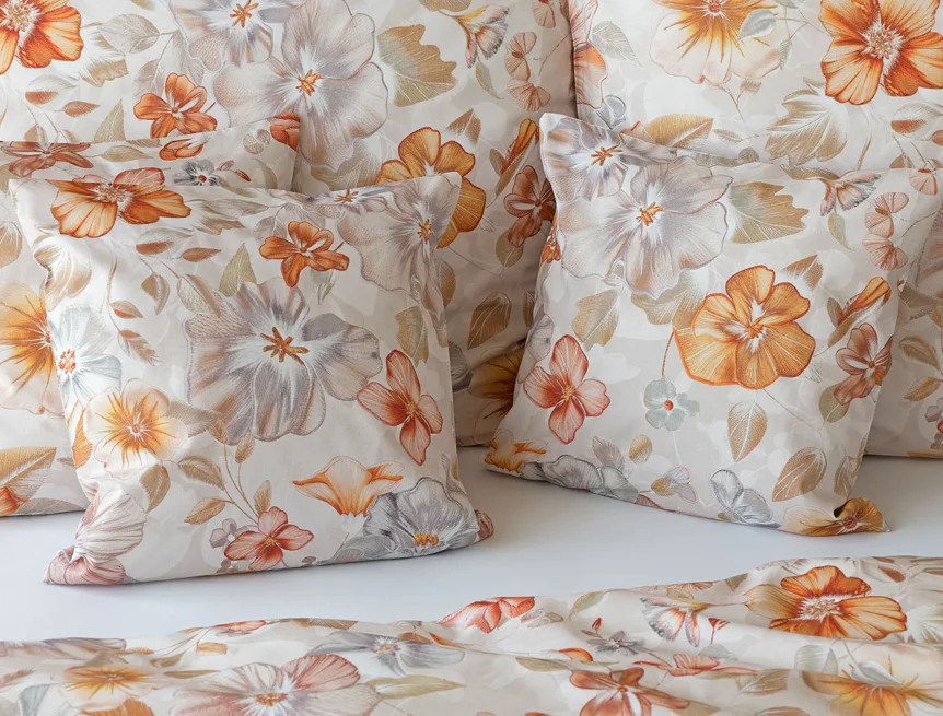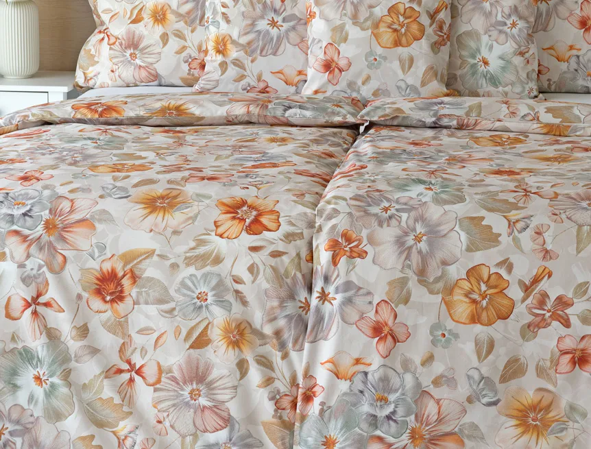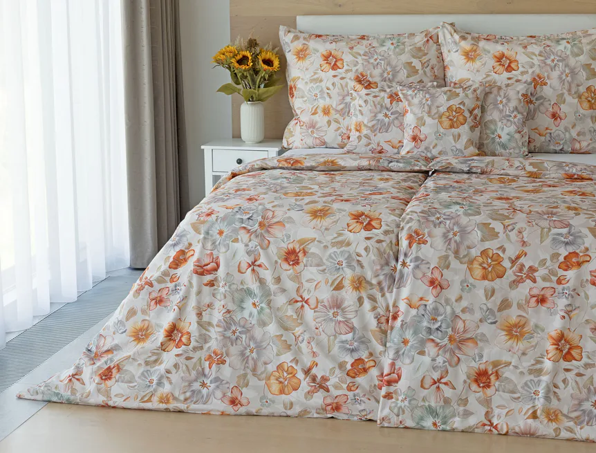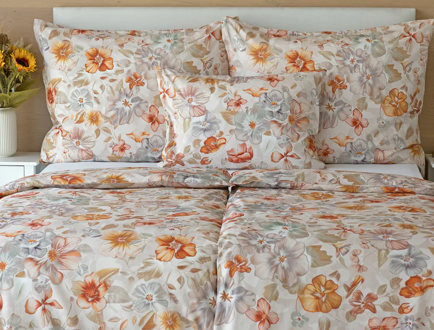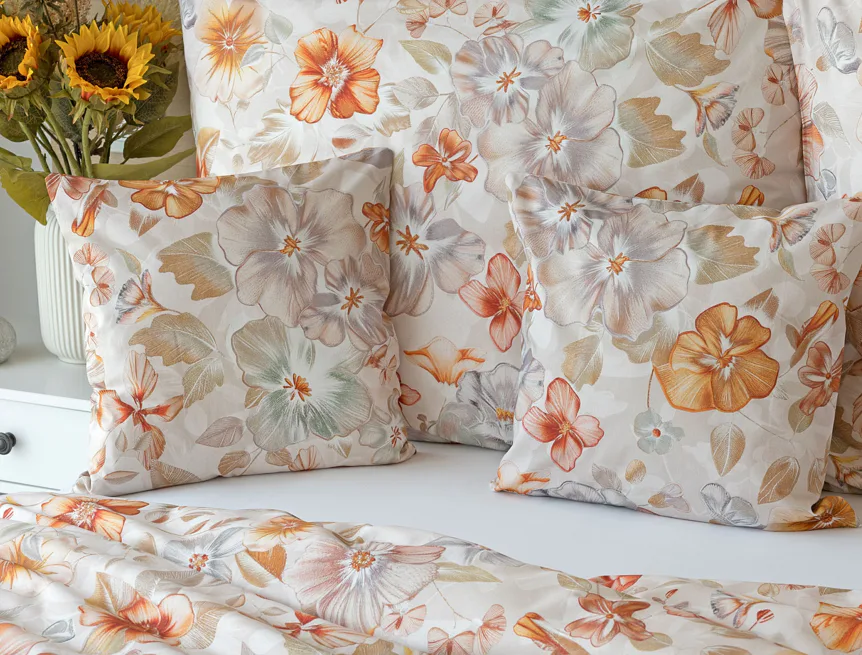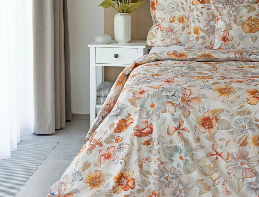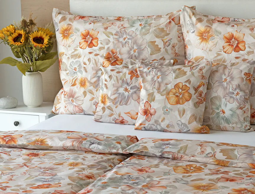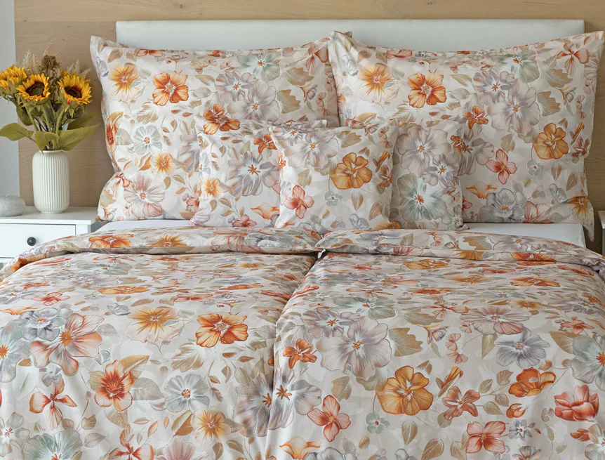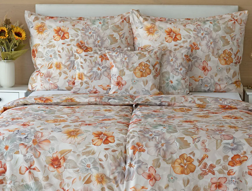 Bavlněné povlečení Manon v podzimních tónech vnese do vaší ložnice hřejivou atmosféru klidu a pohody. Jemný květinový vzor v paletě měděných a béžových tónů navodí pocit útulného domova. Díky nejmodernějšímu digitálnímu tisku je florální motiv zachycen v precizním detailu.