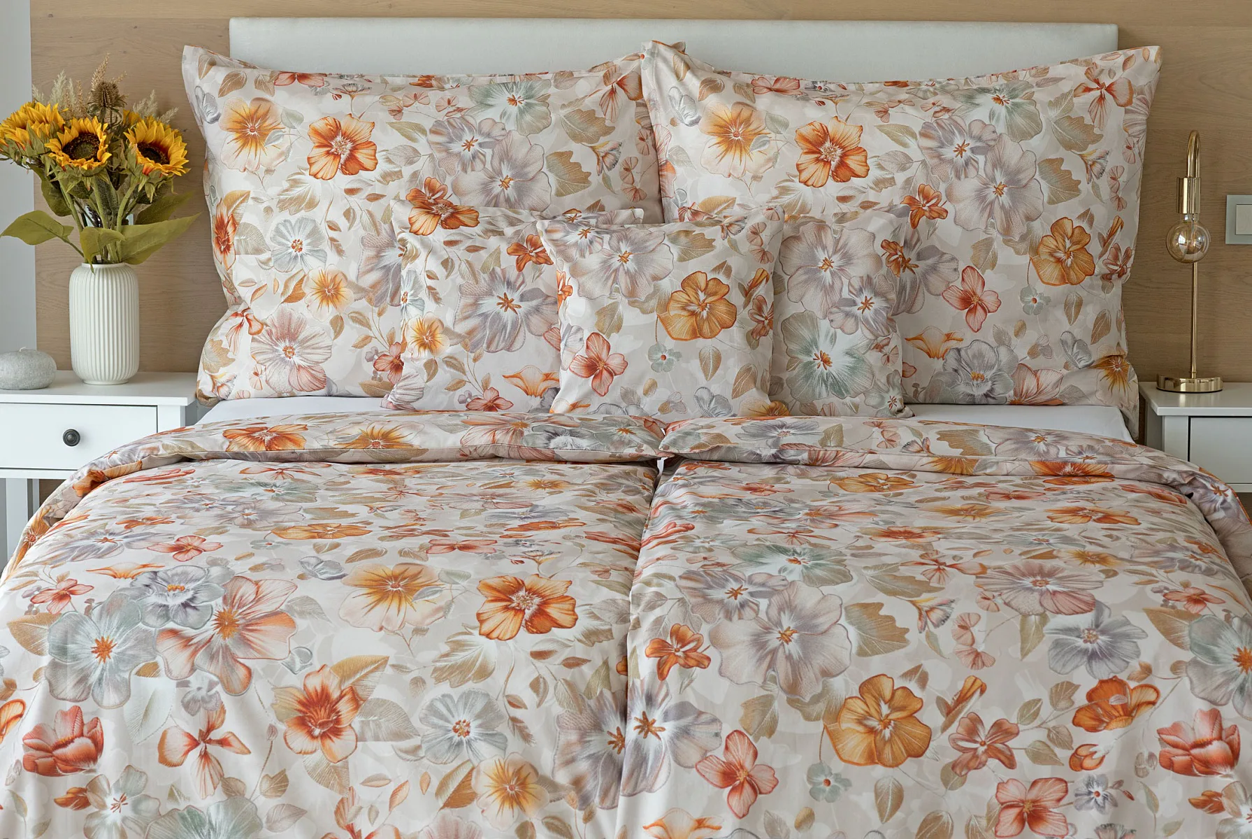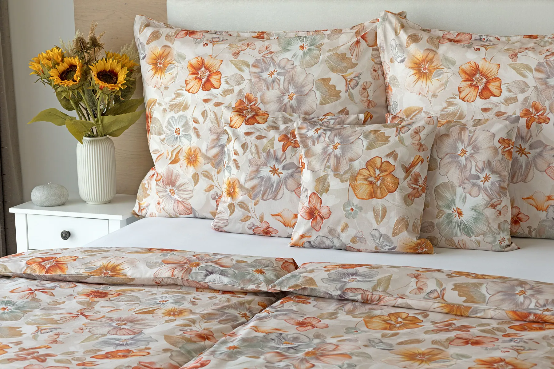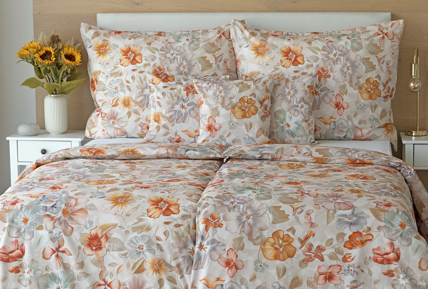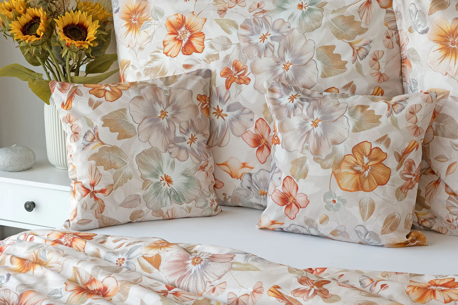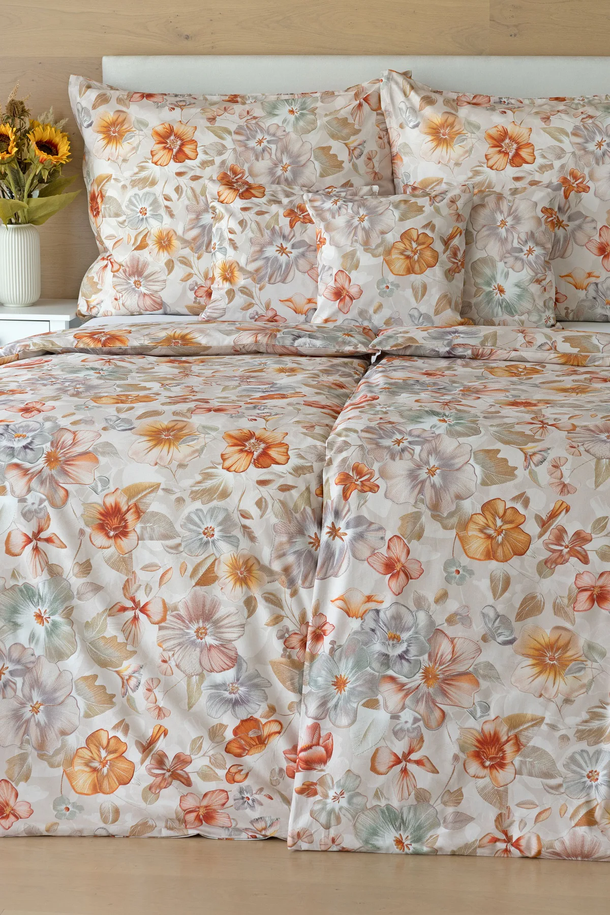 Bavlněné povlečení Manon v podzimních tónech vnese do vaší ložnice hřejivou atmosféru klidu a pohody. Jemný květinový vzor v paletě měděných a béžových tónů navodí pocit útulného domova. Díky nejmodernějšímu digitálnímu tisku je florální motiv zachycen v precizním detailu.