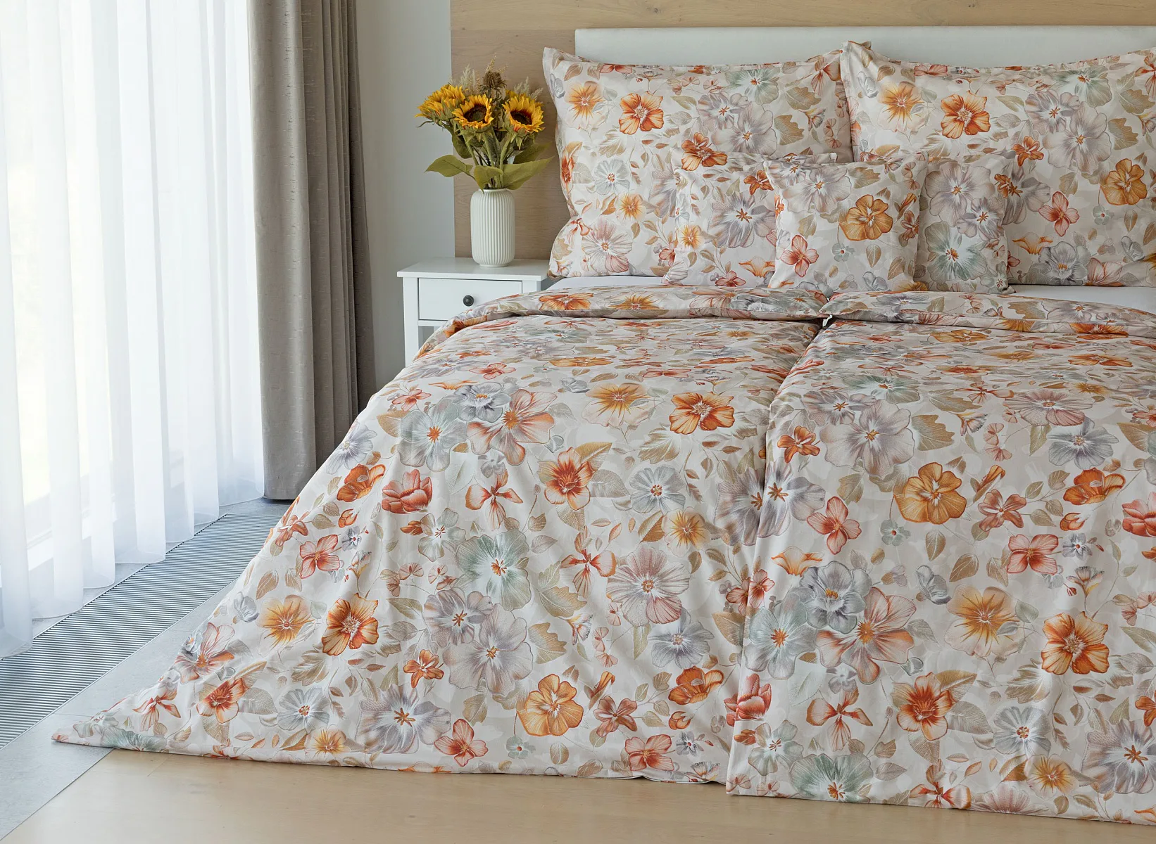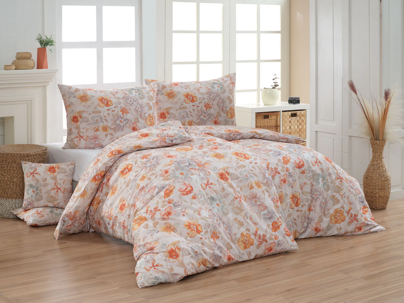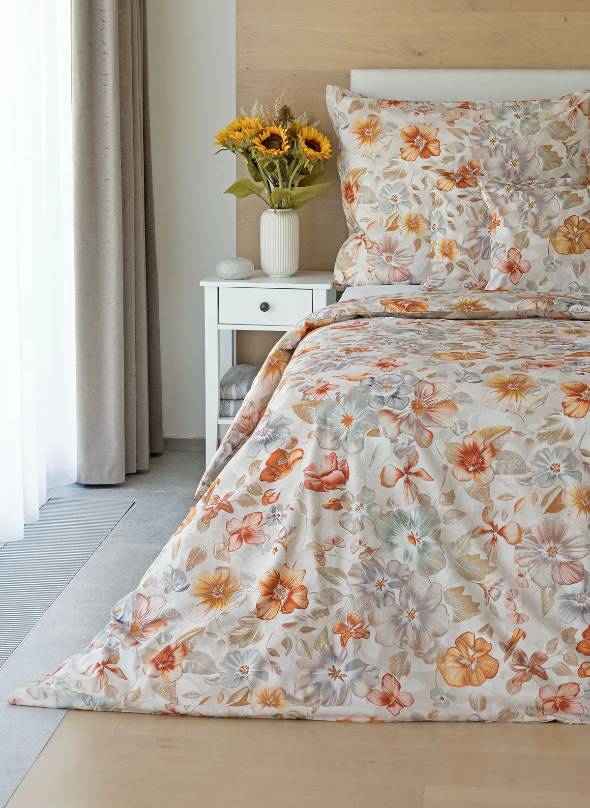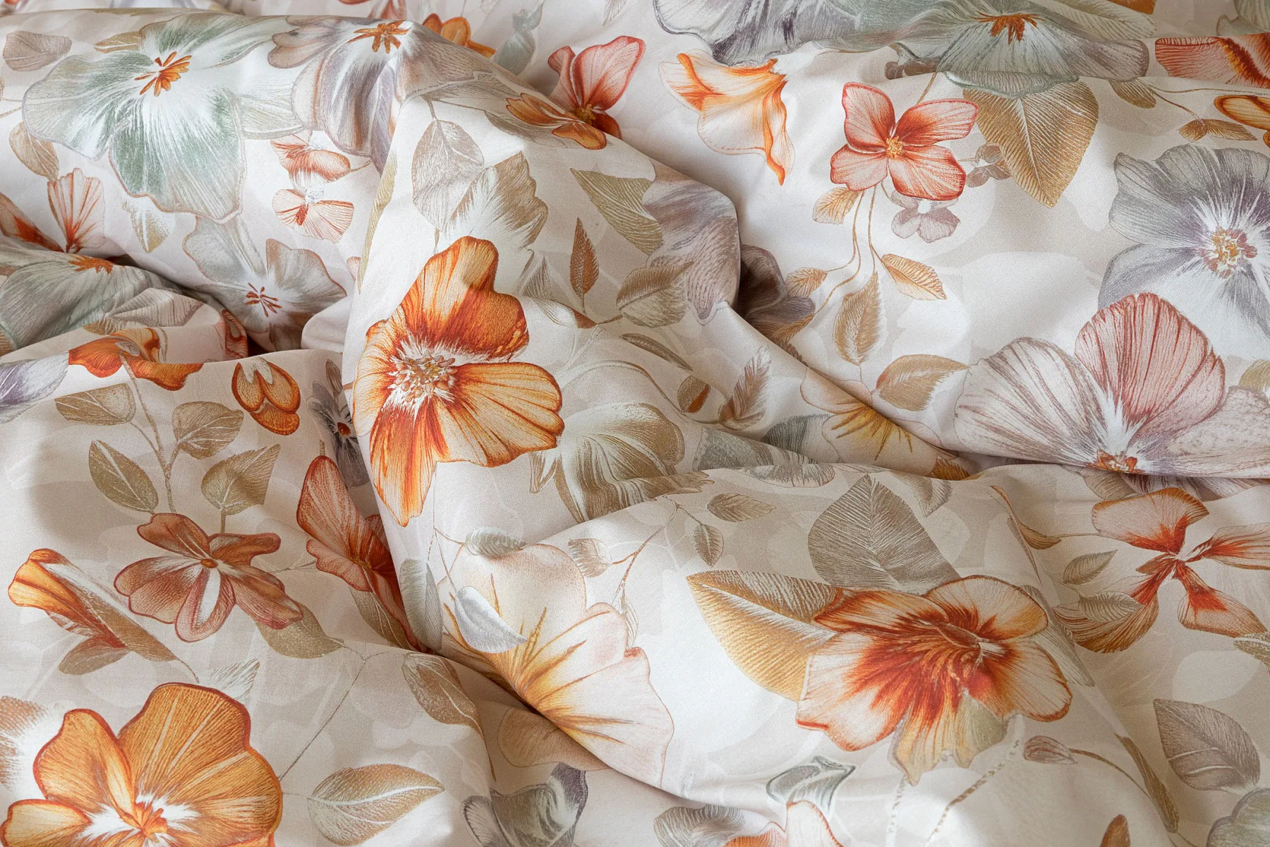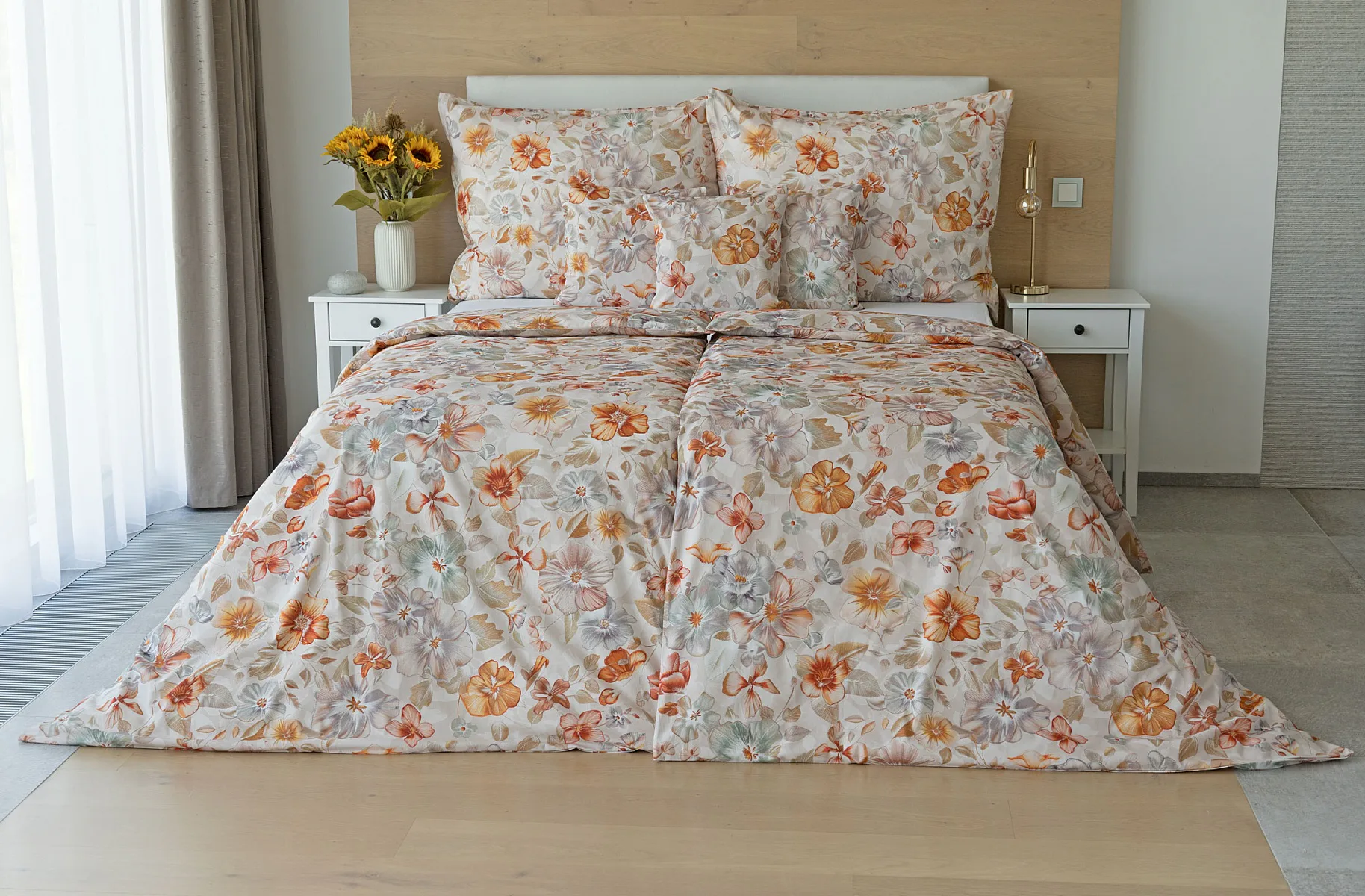 Bavlněné povlečení Manon v podzimních tónech vnese do vaší ložnice hřejivou atmosféru klidu a pohody. Jemný květinový vzor v paletě měděných a béžových tónů navodí pocit útulného domova. Díky nejmodernějšímu digitálnímu tisku je florální motiv zachycen v precizním detailu.