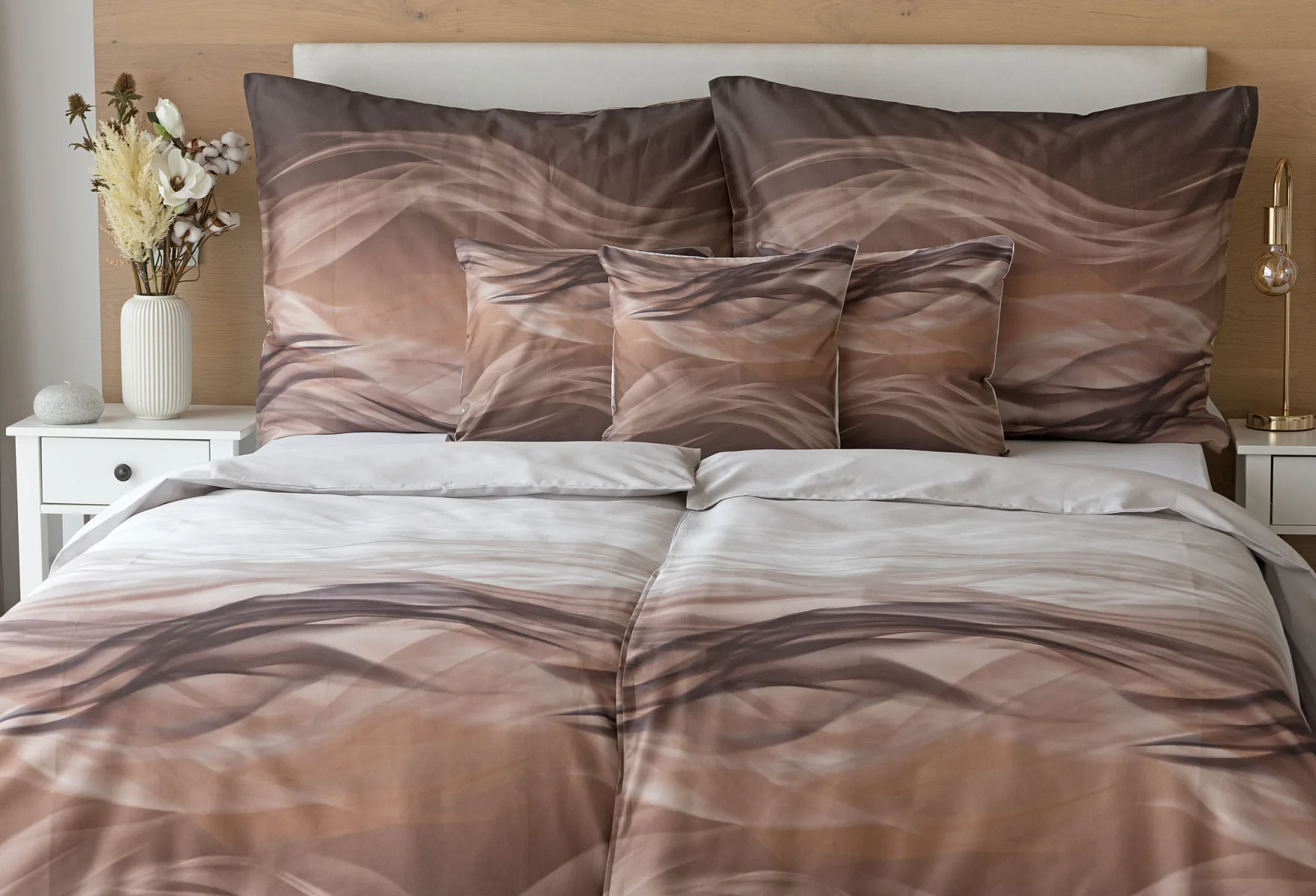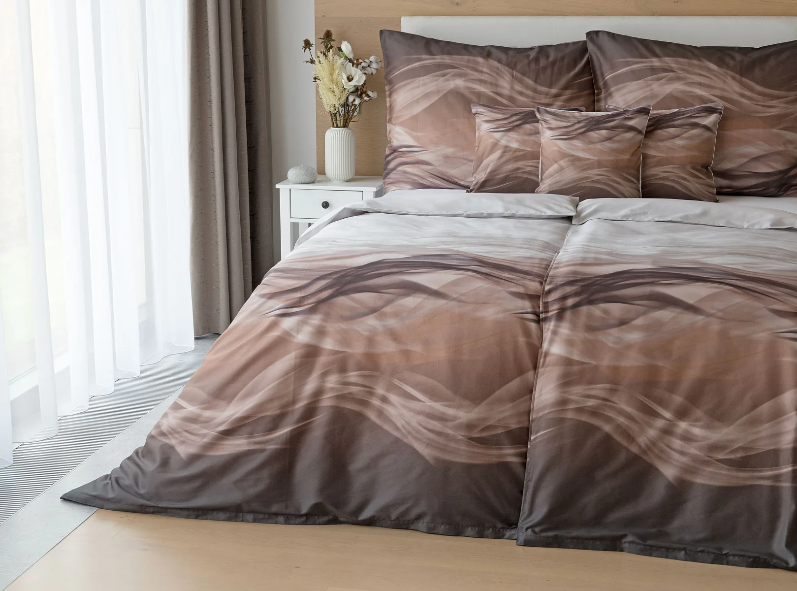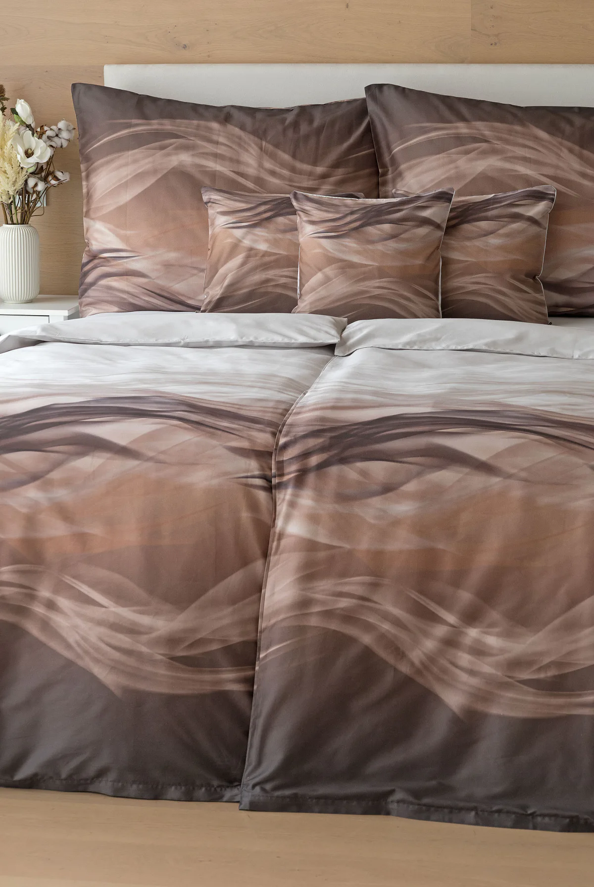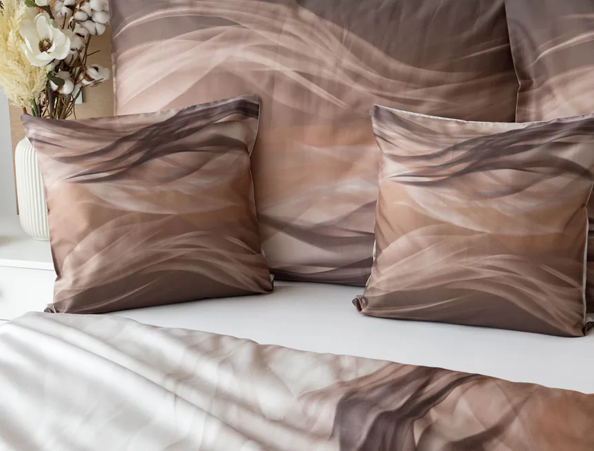 Nechte se unášet na vlnách hřejivé harmonie s ložním povlečením Marni Brown. Abstraktní motiv kombinuje oblíbenou paletu přírodních béžových a hnědých tónů, které navodí v ložnici útulnou atmosféru. Eleganci podtrhuje jemný lesk bavlněného saténu, který je pro tento vzor jako stvořený.