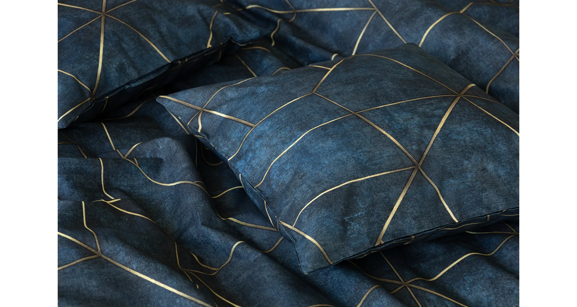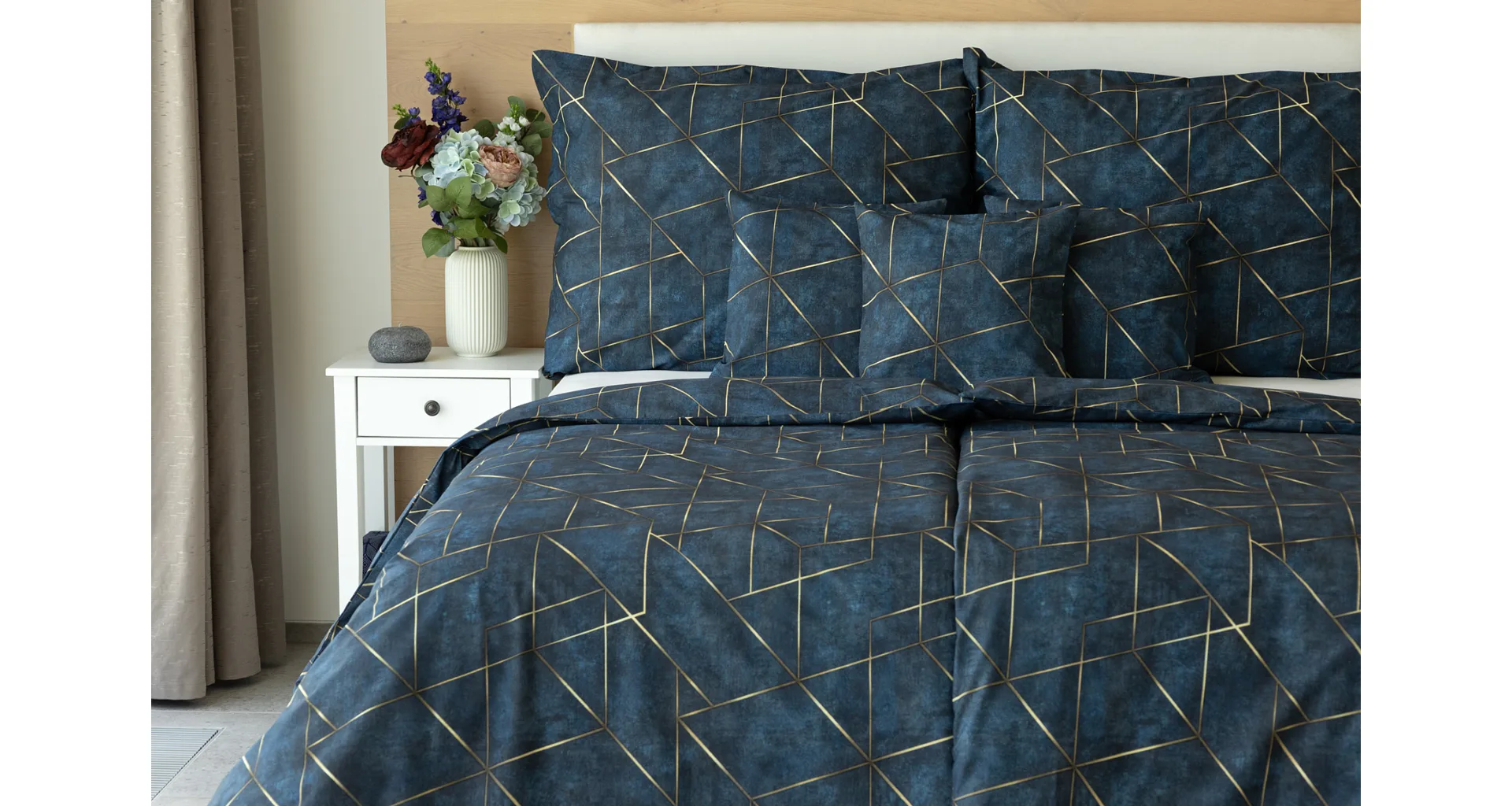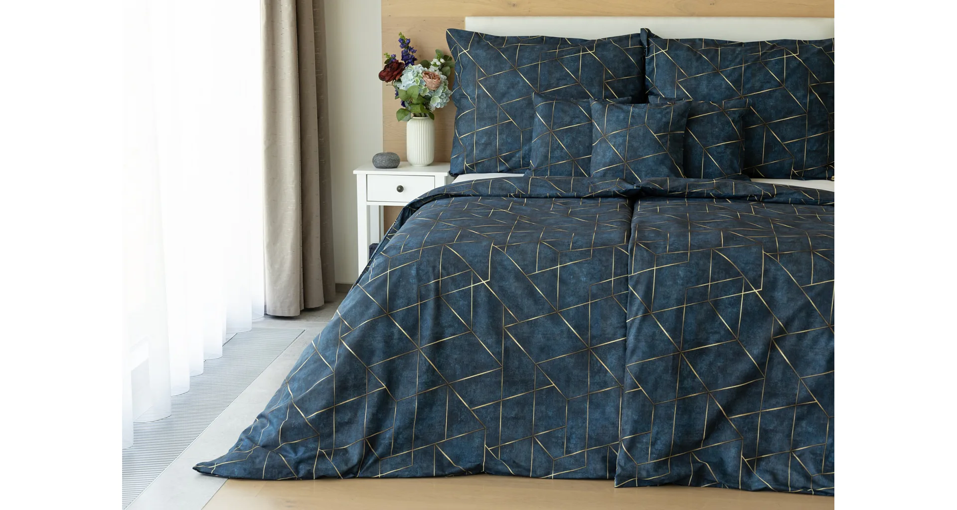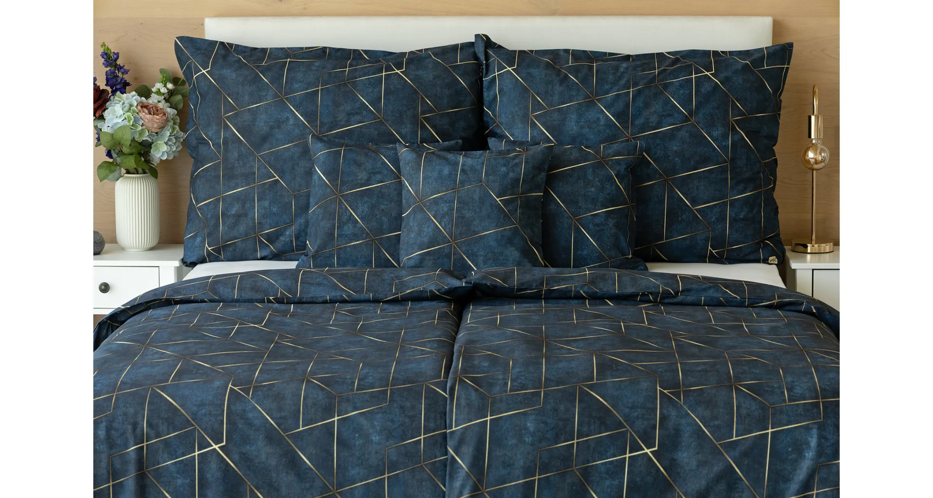 Dopřejte své ložnici dokonale elegantní vzhled s bavlněným ložním povlečením Matis. Vzor, který je jako stvořený do světlého minimalistického interiéru, si jednoduše zamilujete. Podklad v barvě noční oblohy zdobí po celé ploše pískově zlatavý geometrický vzor. Barevné přechody v podkladu i v geometrické linii podtrhují plastický vzhled vzoru. Díky nejmodernějšímu digitálnímu tisku vyniká motiv v precizním detailu.