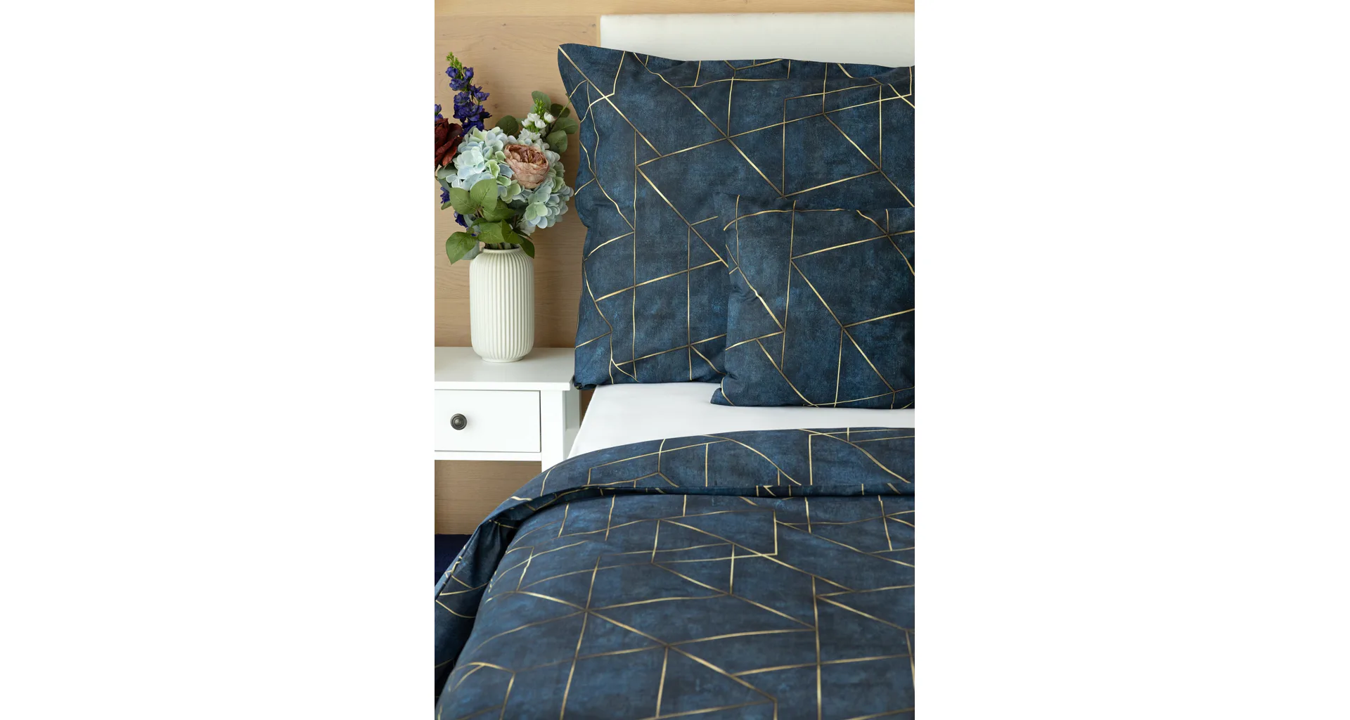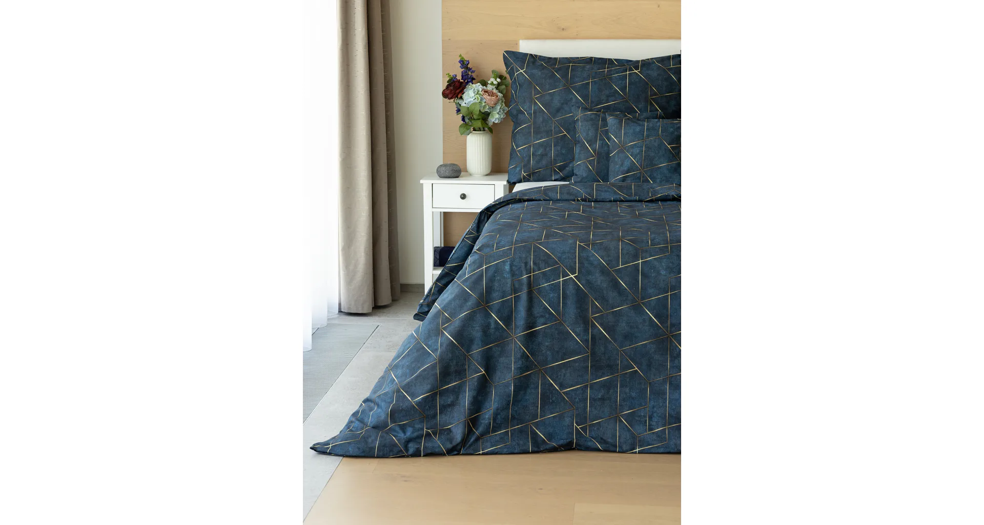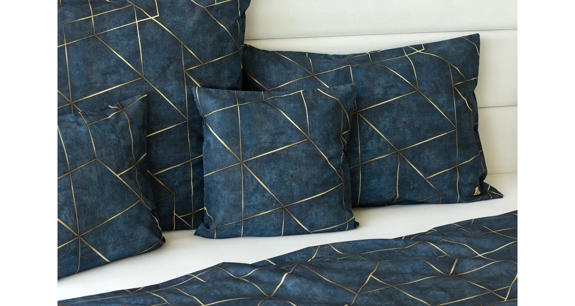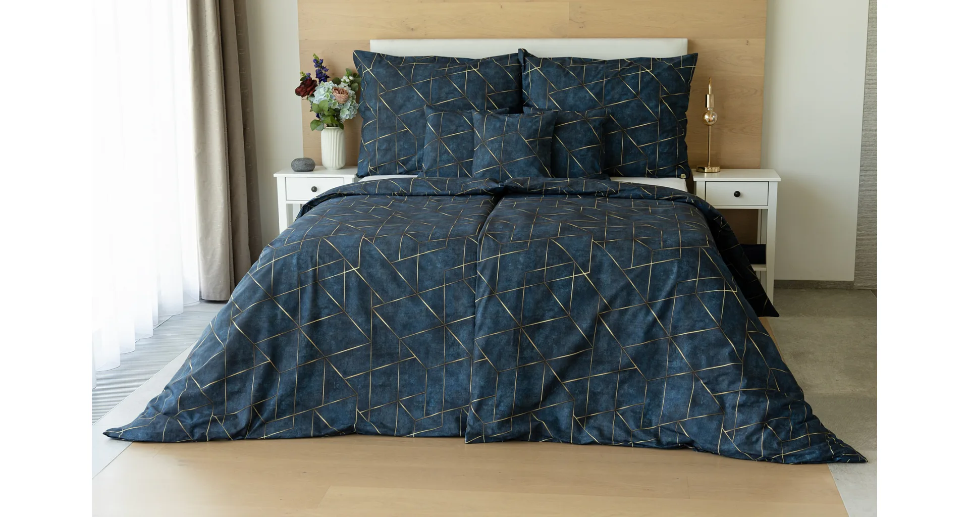 Dopřejte své ložnici dokonale elegantní vzhled s bavlněným ložním povlečením Matis. Vzor, který je jako stvořený do světlého minimalistického interiéru, si jednoduše zamilujete. Podklad v barvě noční oblohy zdobí po celé ploše pískově zlatavý geometrický vzor. Barevné přechody v podkladu i v geometrické linii podtrhují plastický vzhled vzoru. Díky nejmodernějšímu digitálnímu tisku vyniká motiv v precizním detailu.