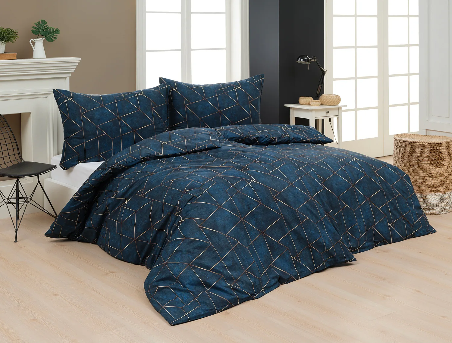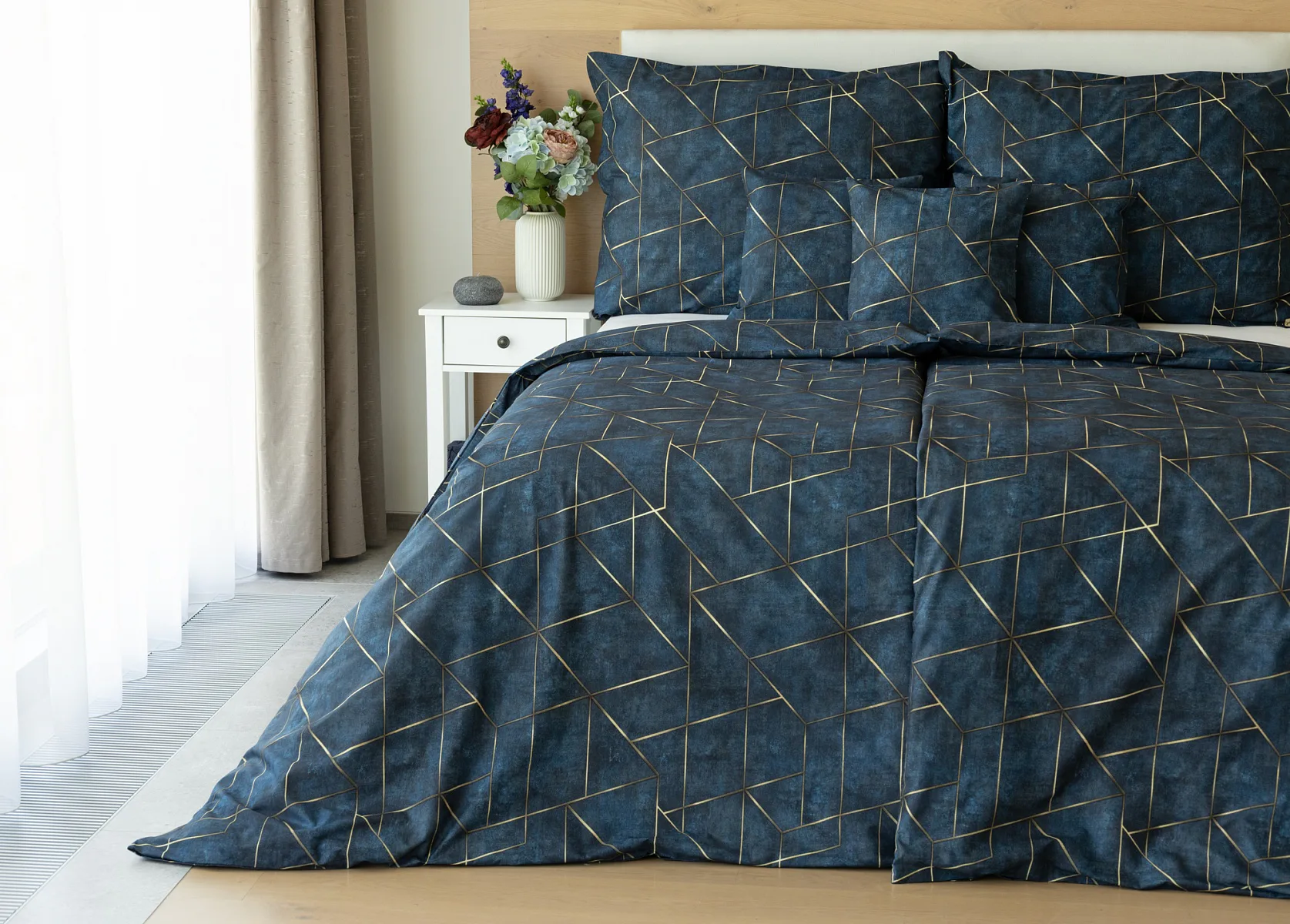 Dopřejte své ložnici dokonale elegantní vzhled s bavlněným ložním povlečením Matis. Vzor, který je jako stvořený do světlého minimalistického interiéru, si jednoduše zamilujete. Podklad v barvě noční oblohy zdobí po celé ploše pískově zlatavý geometrický vzor. Barevné přechody v podkladu i v geometrické linii podtrhují plastický vzhled vzoru. Díky nejmodernějšímu digitálnímu tisku vyniká motiv v precizním detailu.