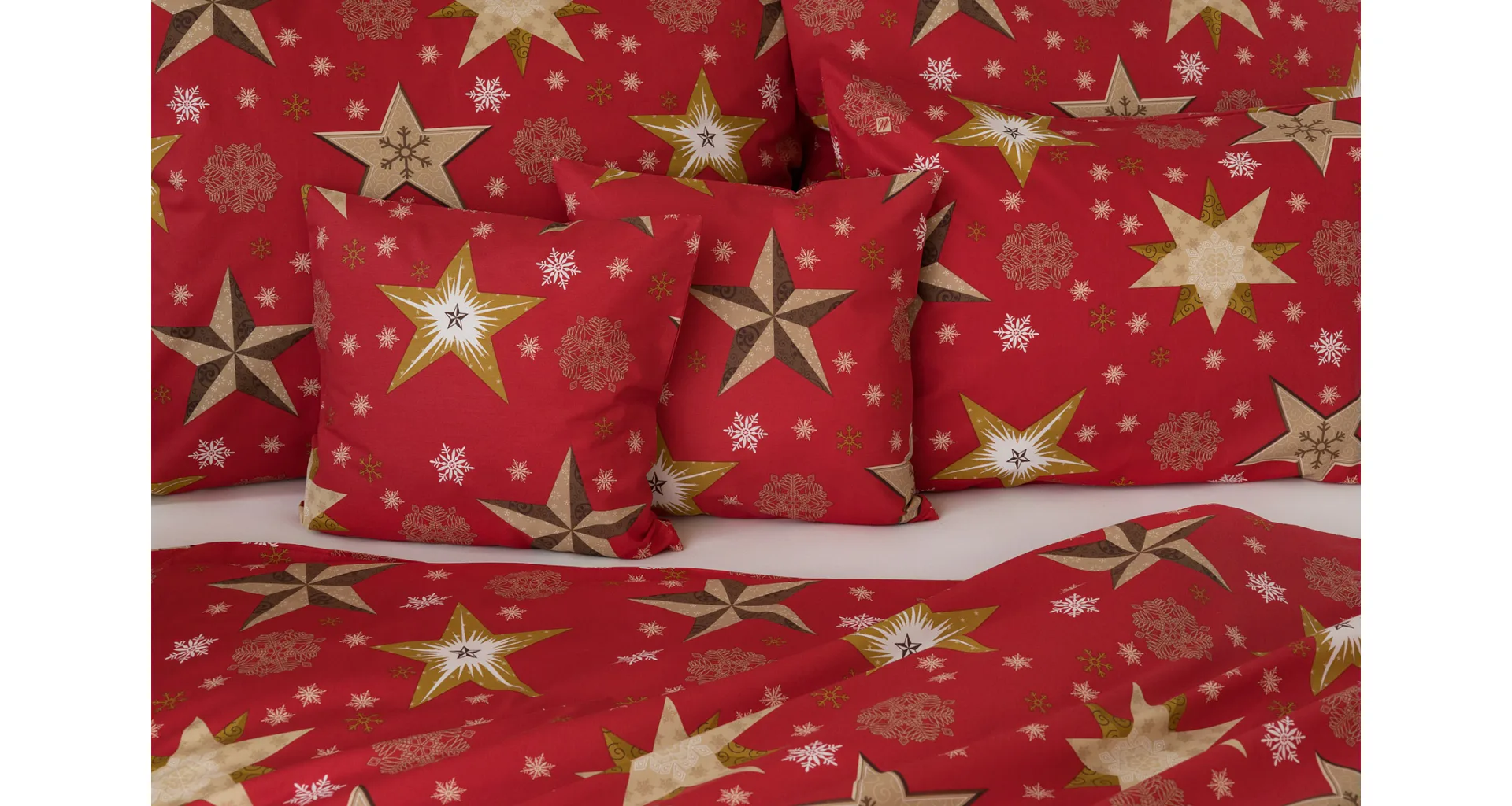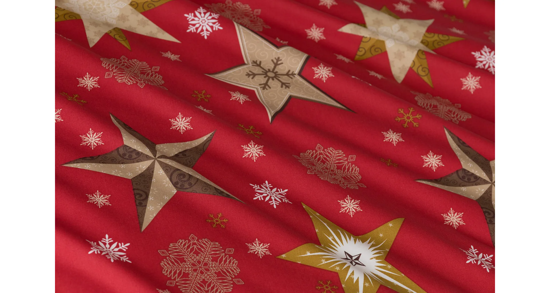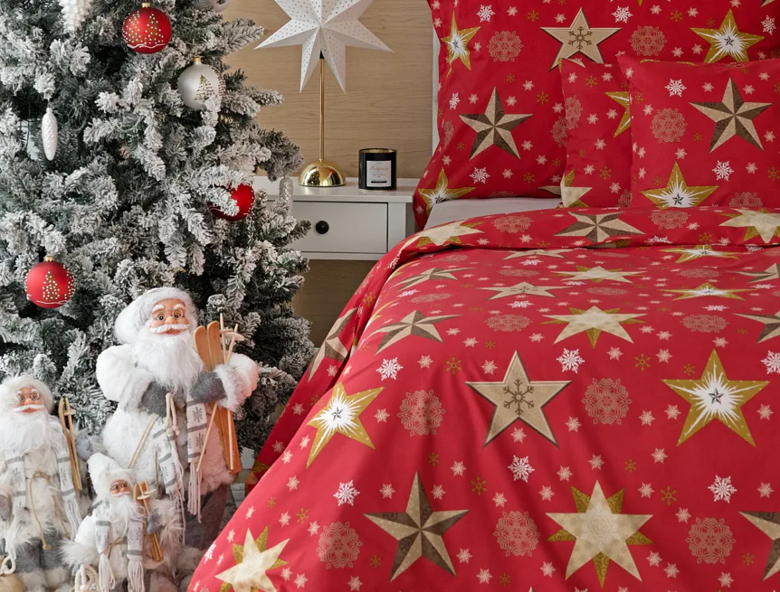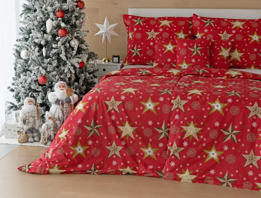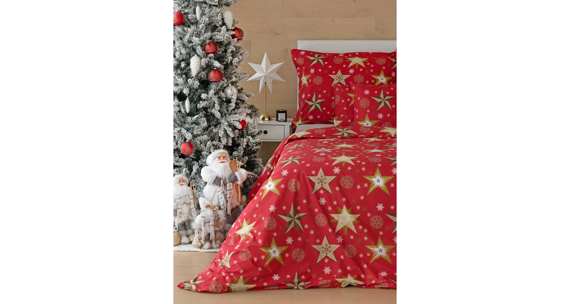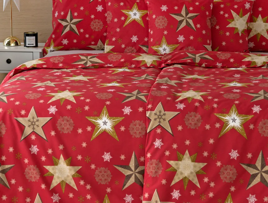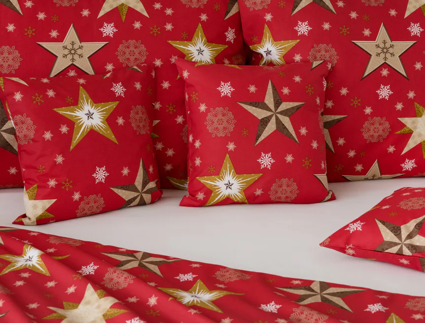 Nalaďte se na hřejivou vánoční atmosféru s bavlněným povlečením Merci. Sváteční motiv zlatých hvězd a sněhových vloček vyniká na podkladu v tradiční červené barvě.