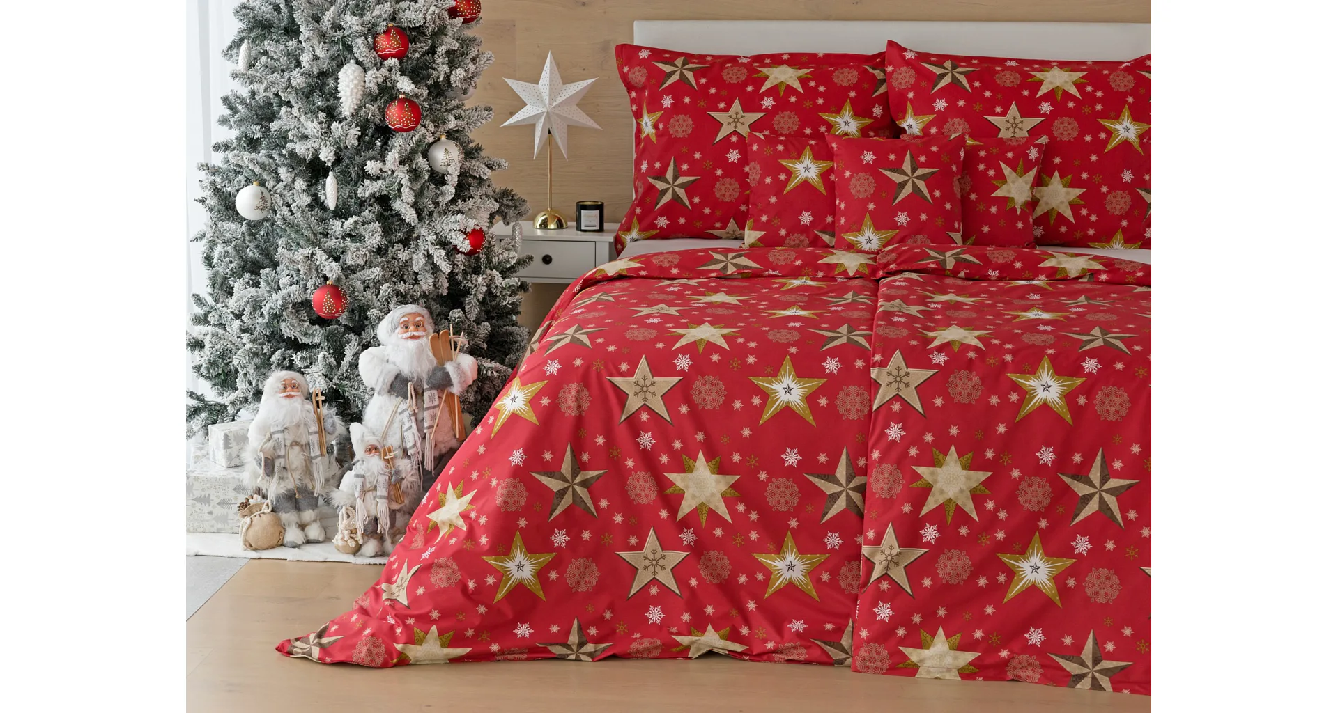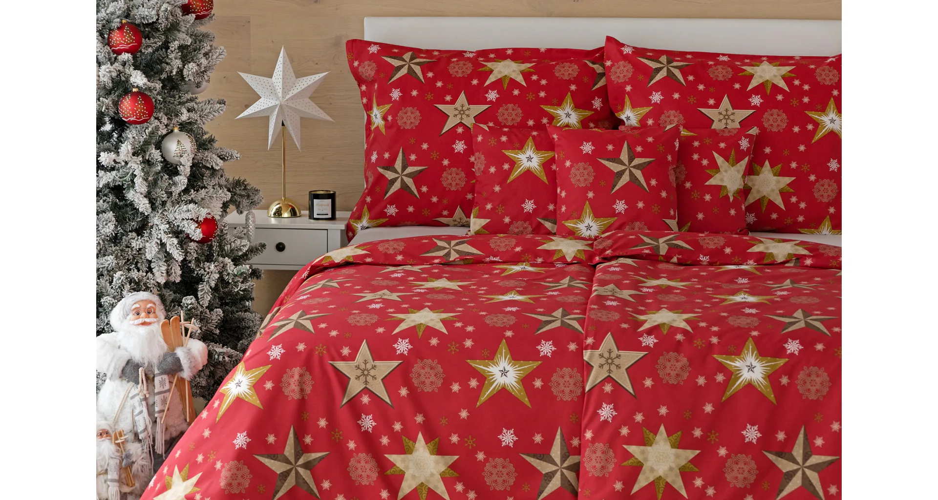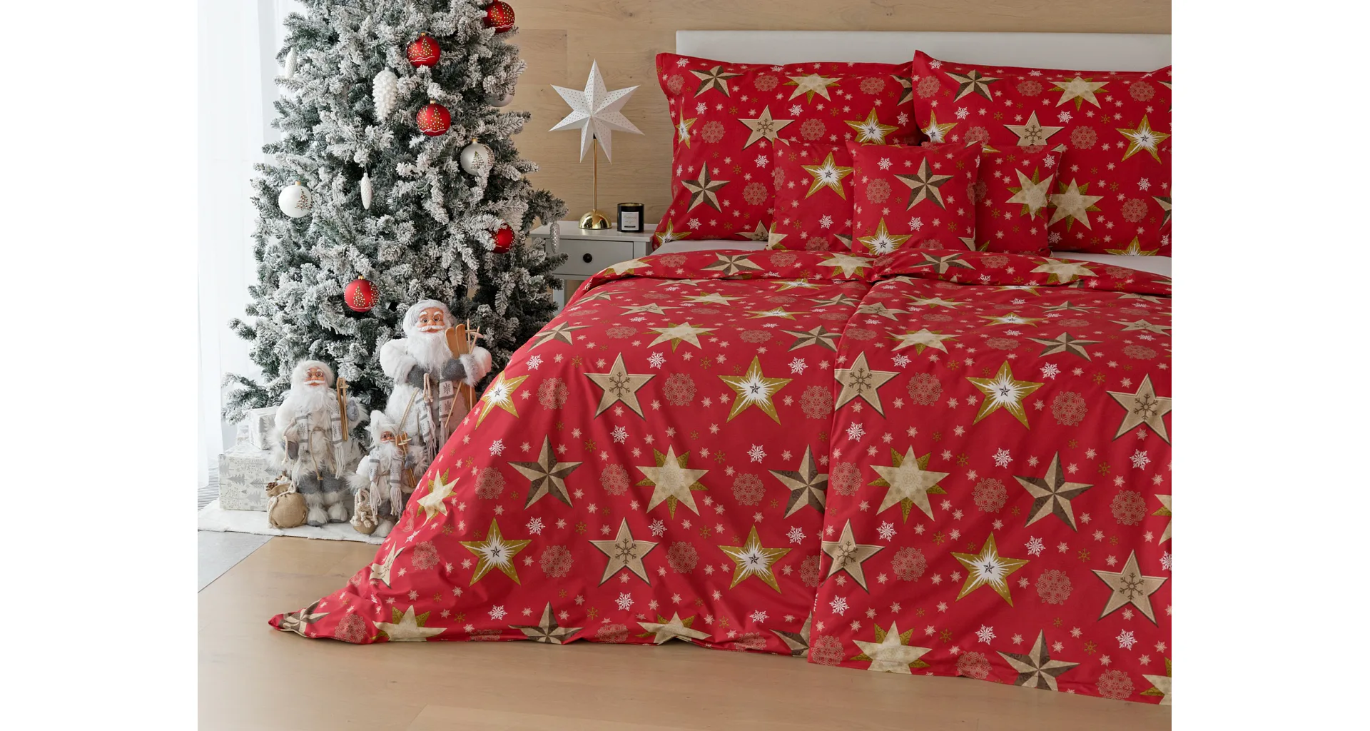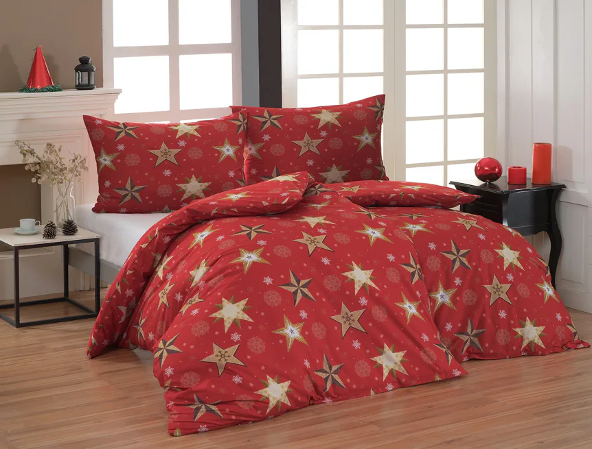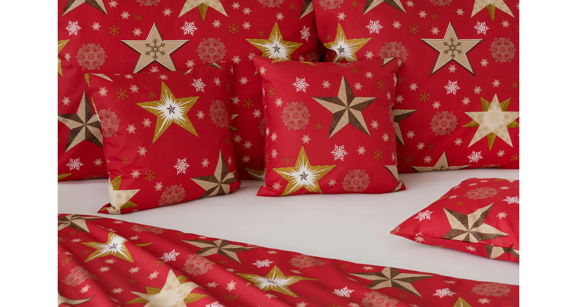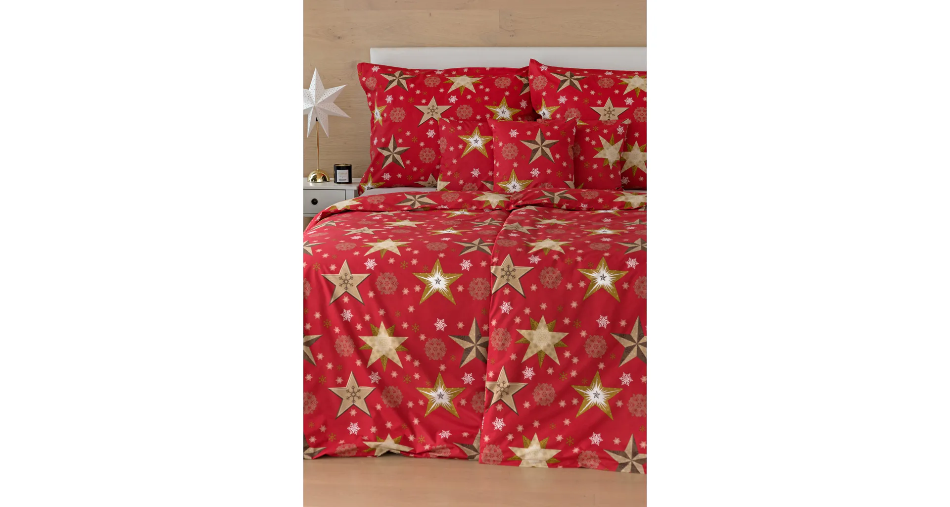 Nalaďte se na hřejivou vánoční atmosféru s bavlněným povlečením Merci. Sváteční motiv zlatých hvězd a sněhových vloček vyniká na podkladu v tradiční červené barvě.