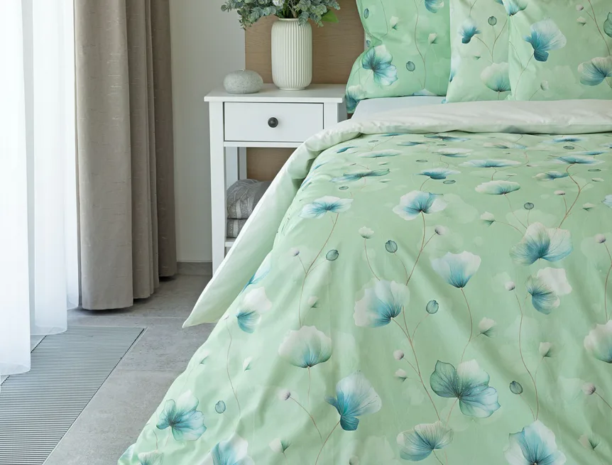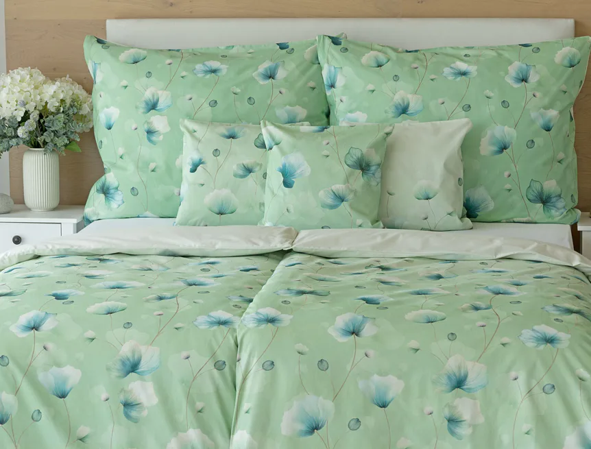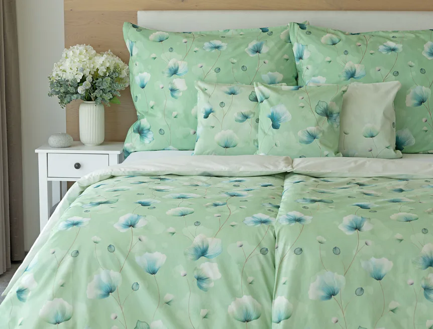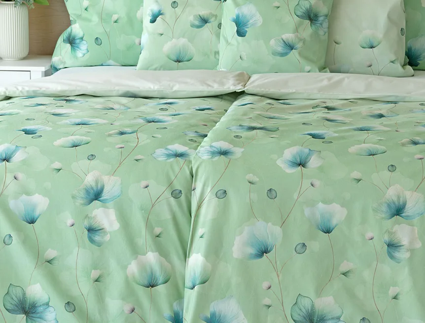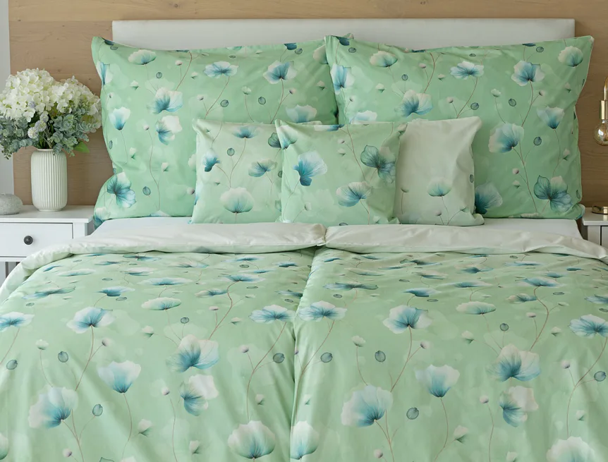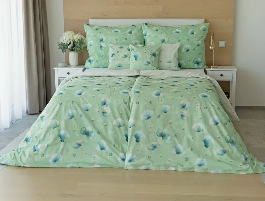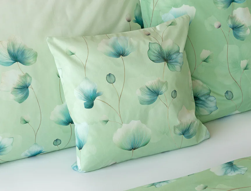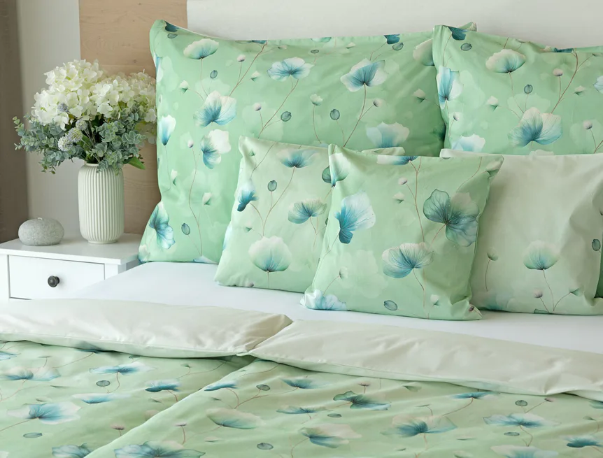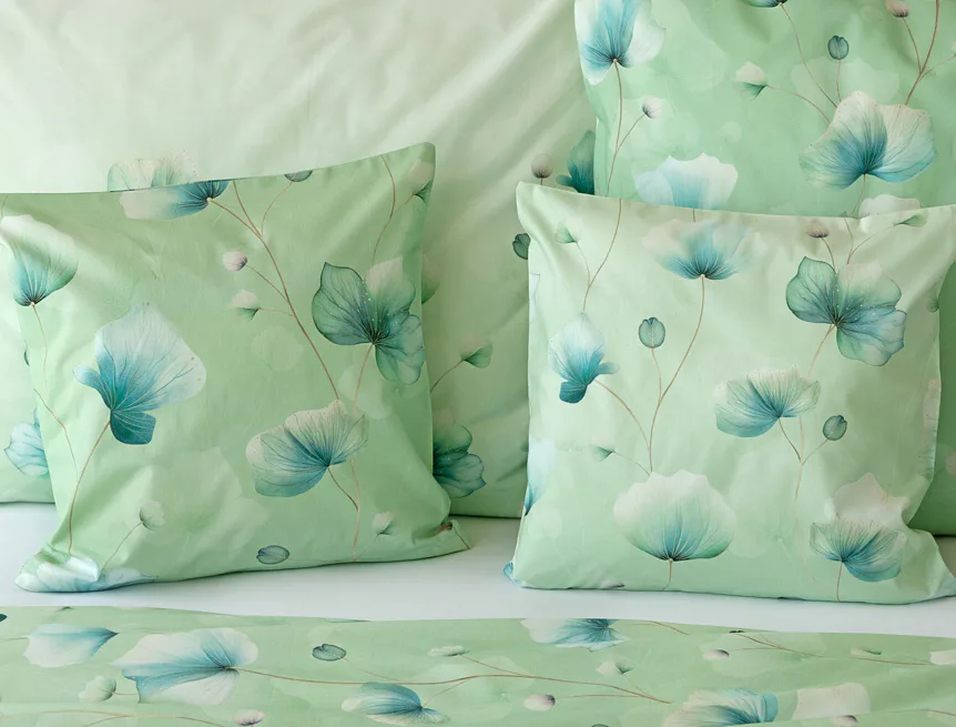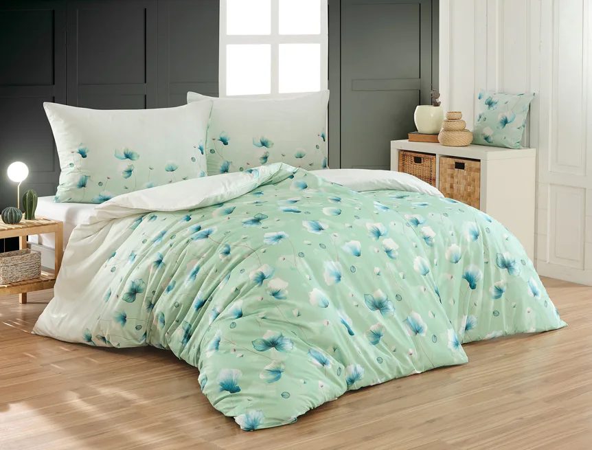 Bavlněné ložní povlečení Nelly vnese do vaší ložnice nádech svěžesti a vlnu pozitivní energie. Podklad v atraktivní zelené barvě zdobí velice jednoduchý florální motiv v paletě modrých a petrolejových tónů. Eleganci vzoru podtrhuje ombré efekt, který přechází v horní části povlaků k tlumenému, jemně zelenkavému odstínu.