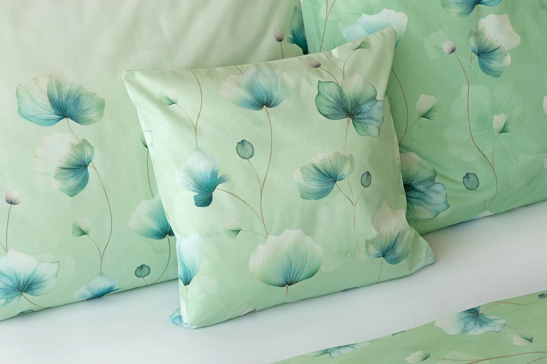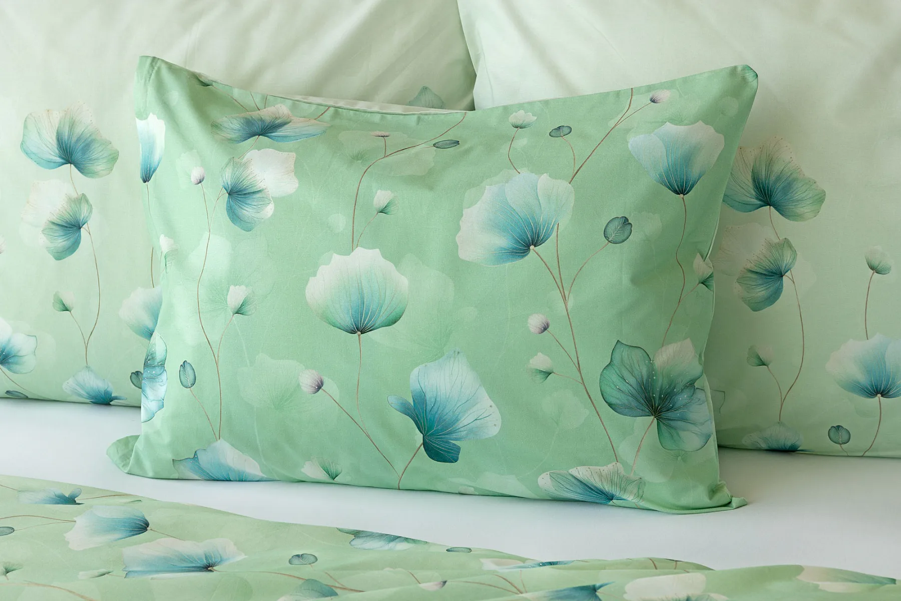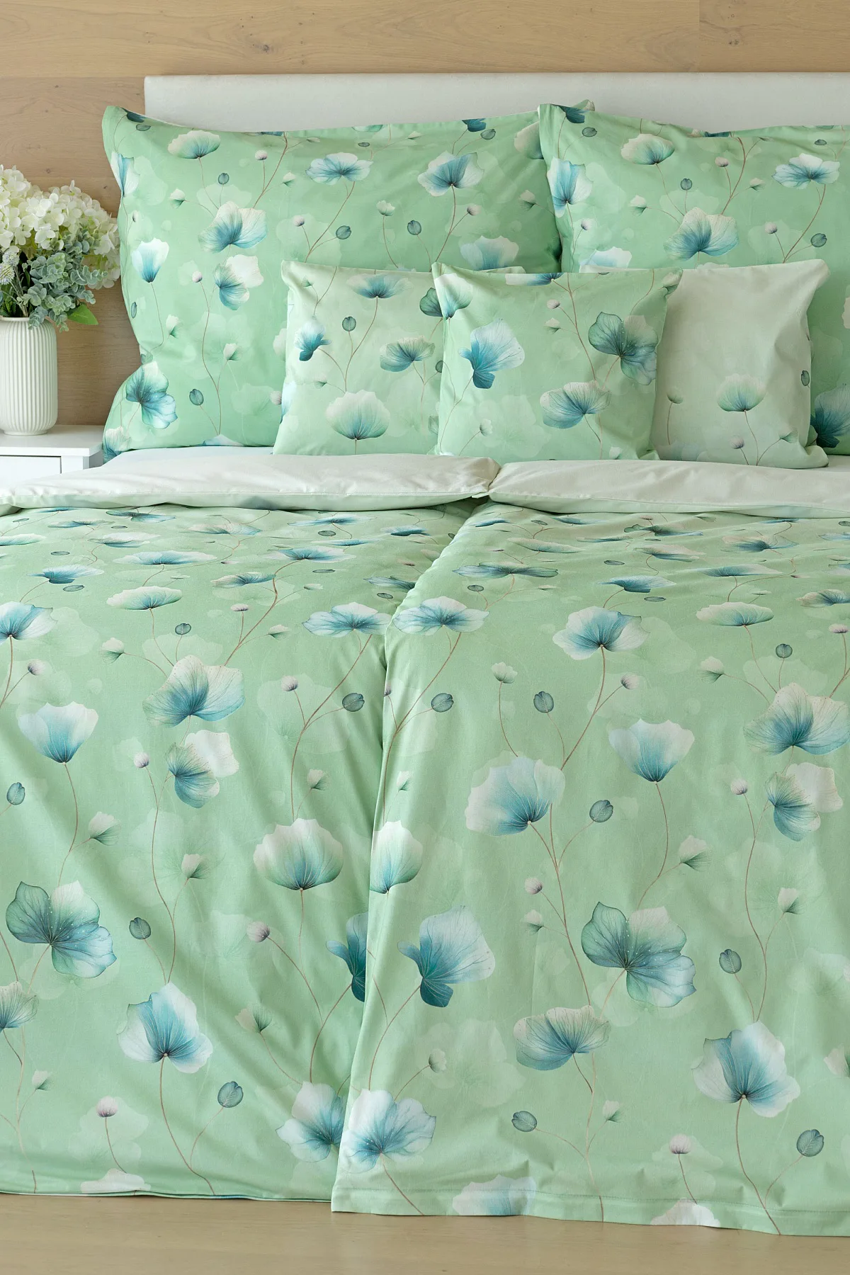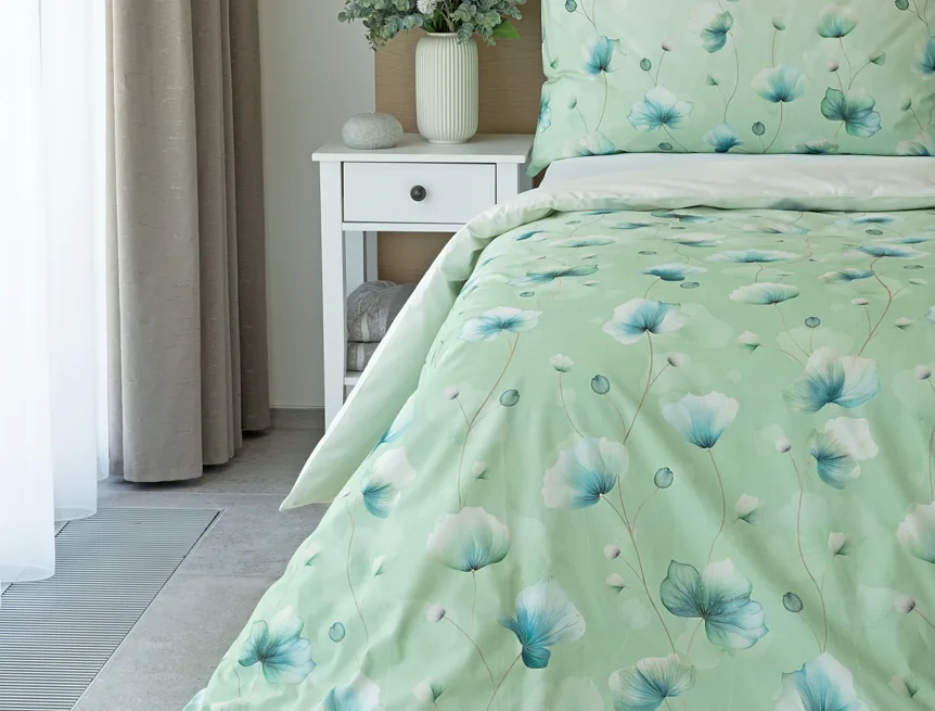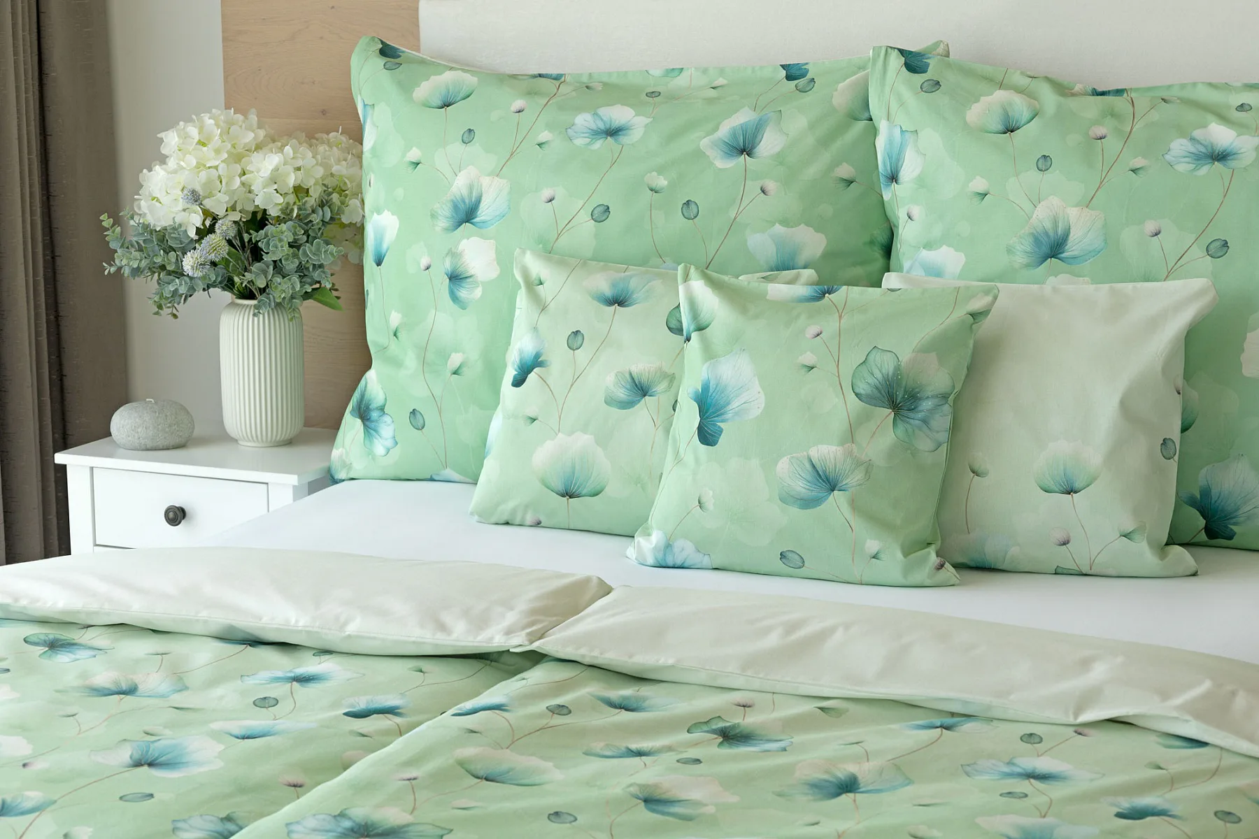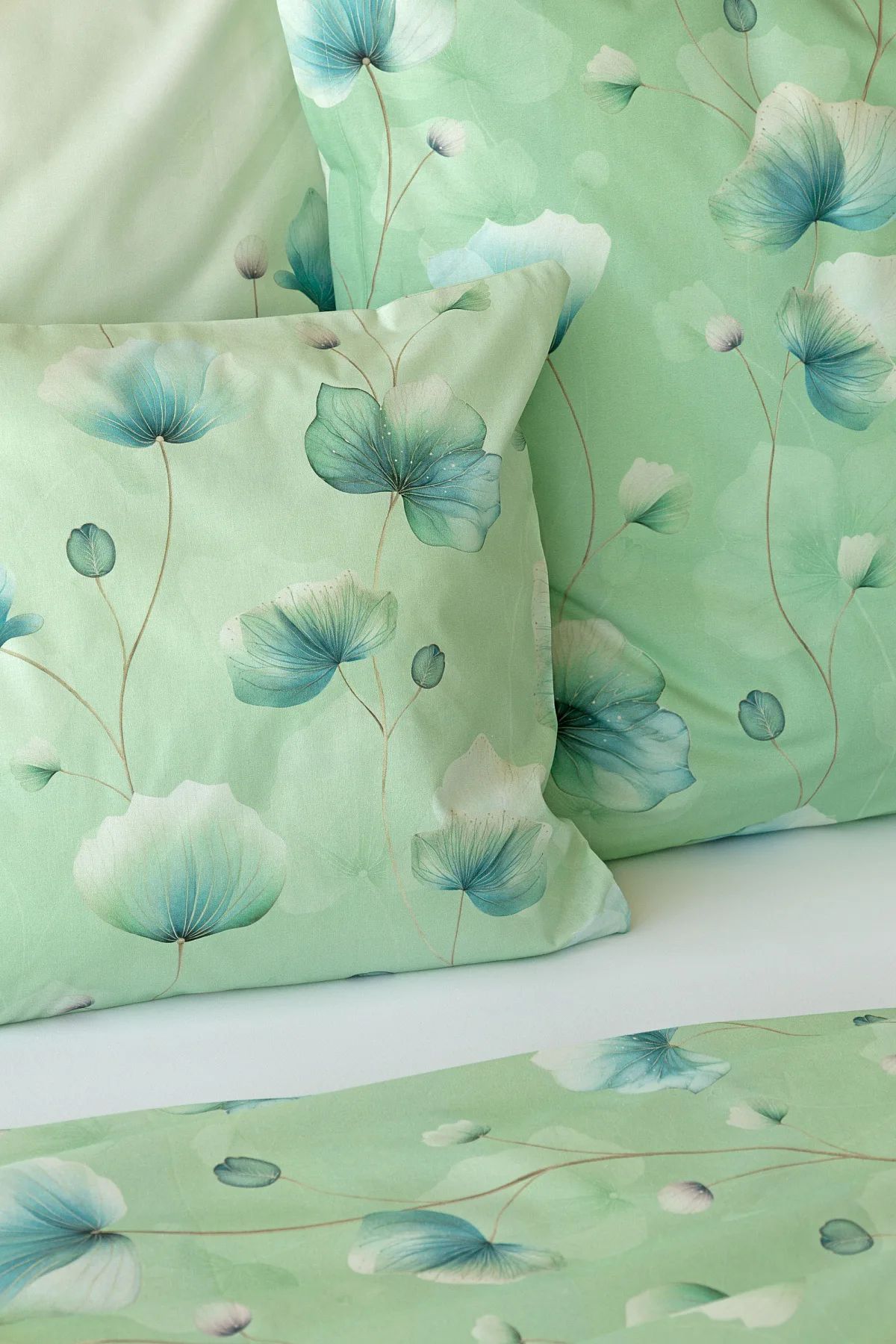 Bavlněné ložní povlečení Nelly vnese do vaší ložnice nádech svěžesti a vlnu pozitivní energie. Podklad v atraktivní zelené barvě zdobí velice jednoduchý florální motiv v paletě modrých a petrolejových tónů. Eleganci vzoru podtrhuje ombré efekt, který přechází v horní části povlaků k tlumenému, jemně zelenkavému odstínu.