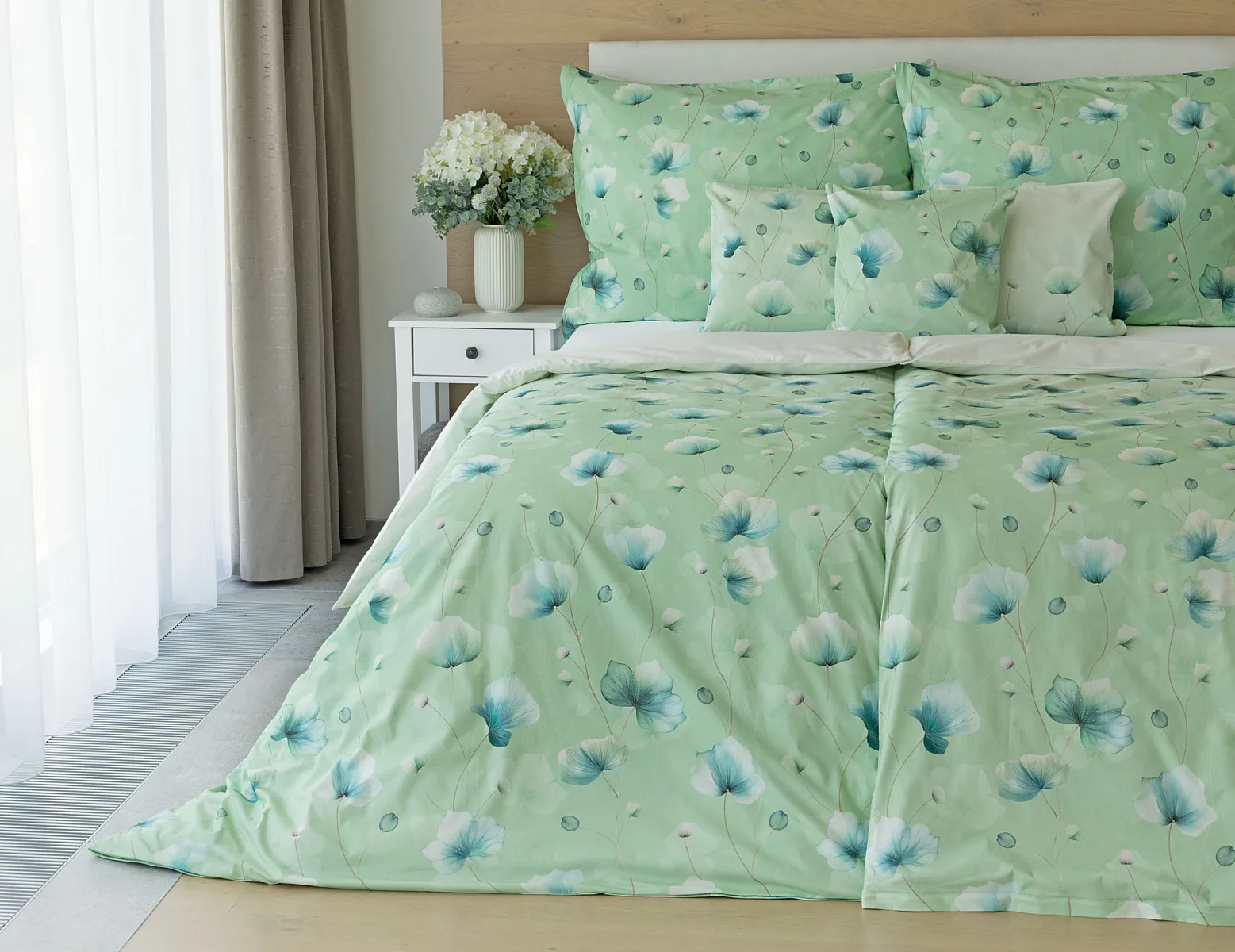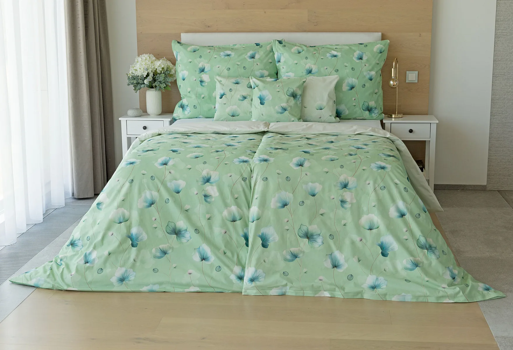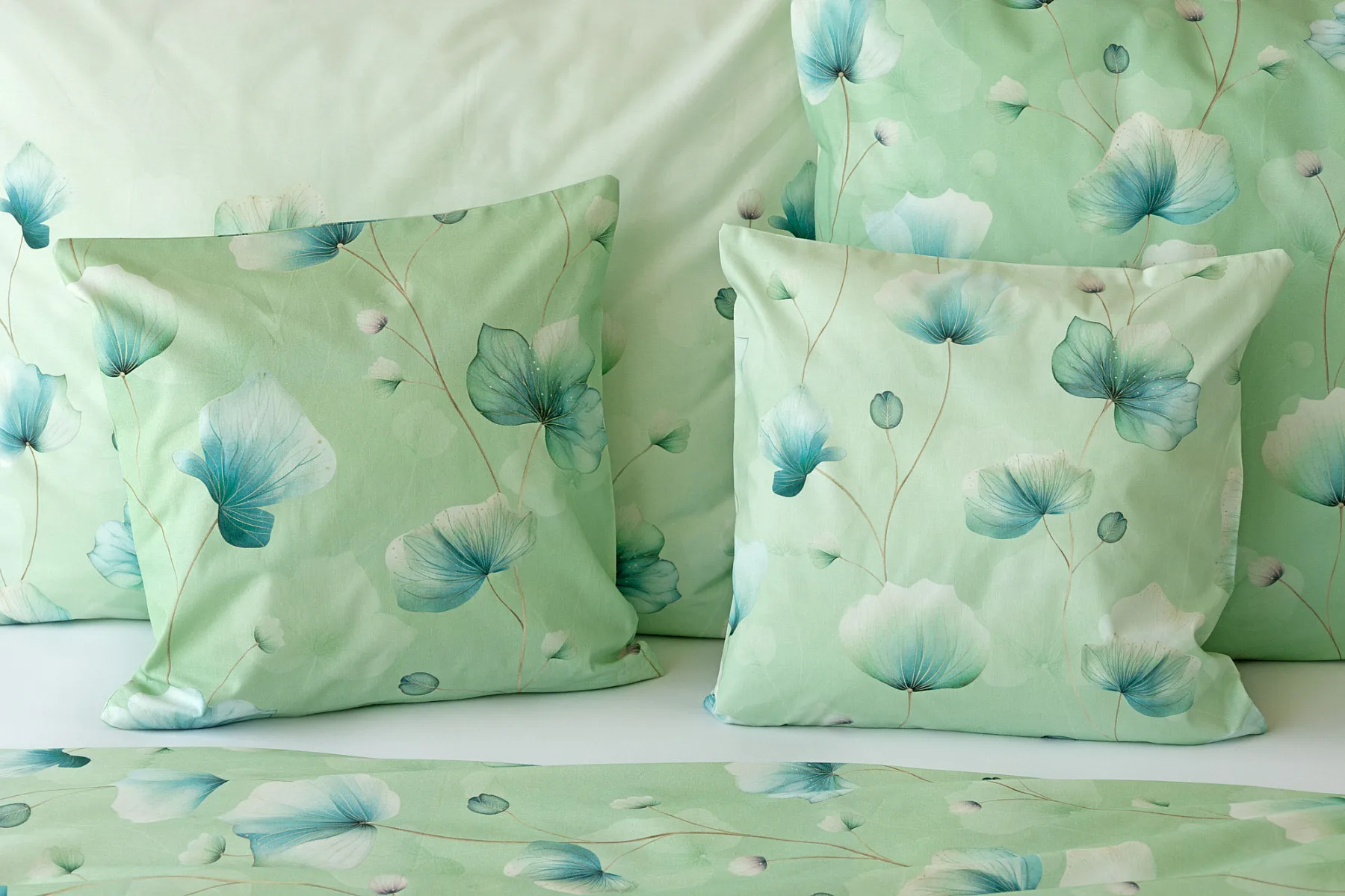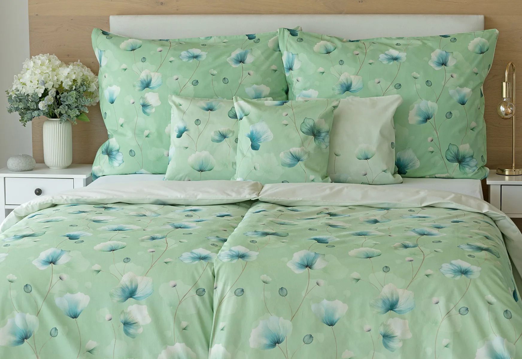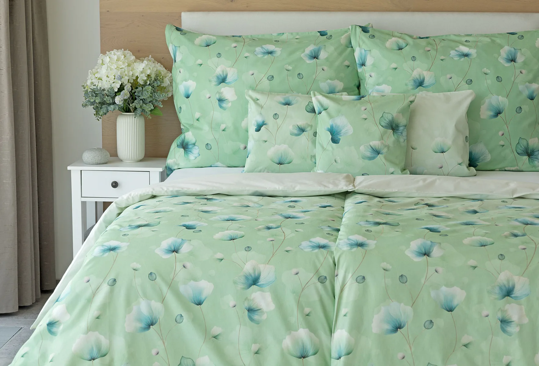 Bavlněné ložní povlečení Nelly vnese do vaší ložnice nádech svěžesti a vlnu pozitivní energie. Podklad v atraktivní zelené barvě zdobí velice jednoduchý florální motiv v paletě modrých a petrolejových tónů. Eleganci vzoru podtrhuje ombré efekt, který přechází v horní části povlaků k tlumenému, jemně zelenkavému odstínu.