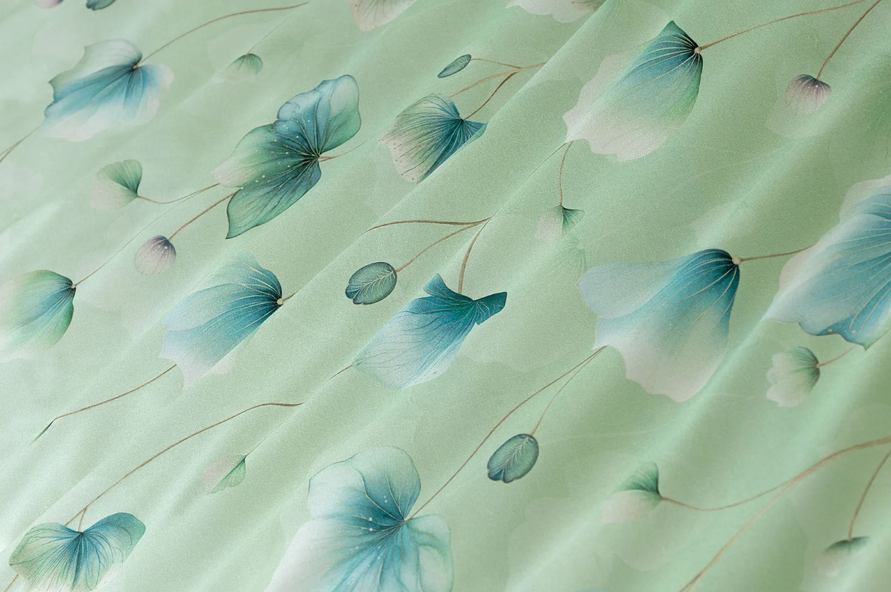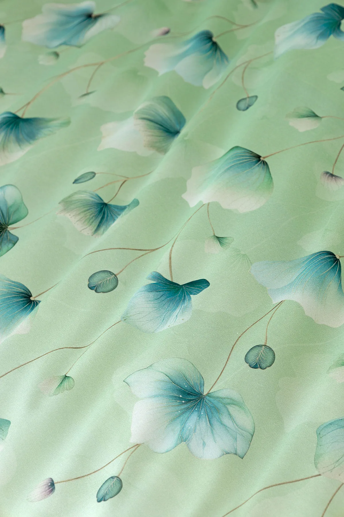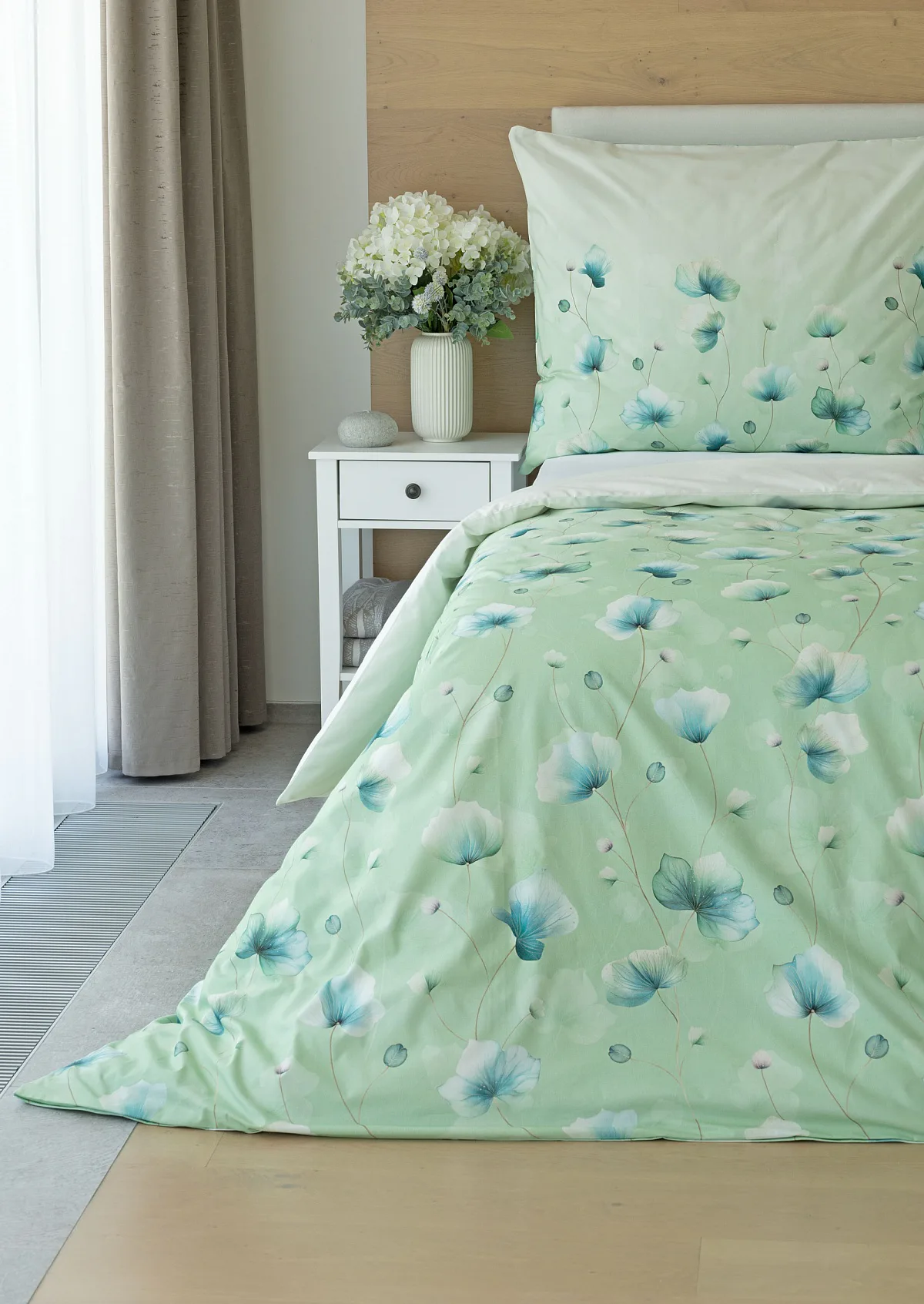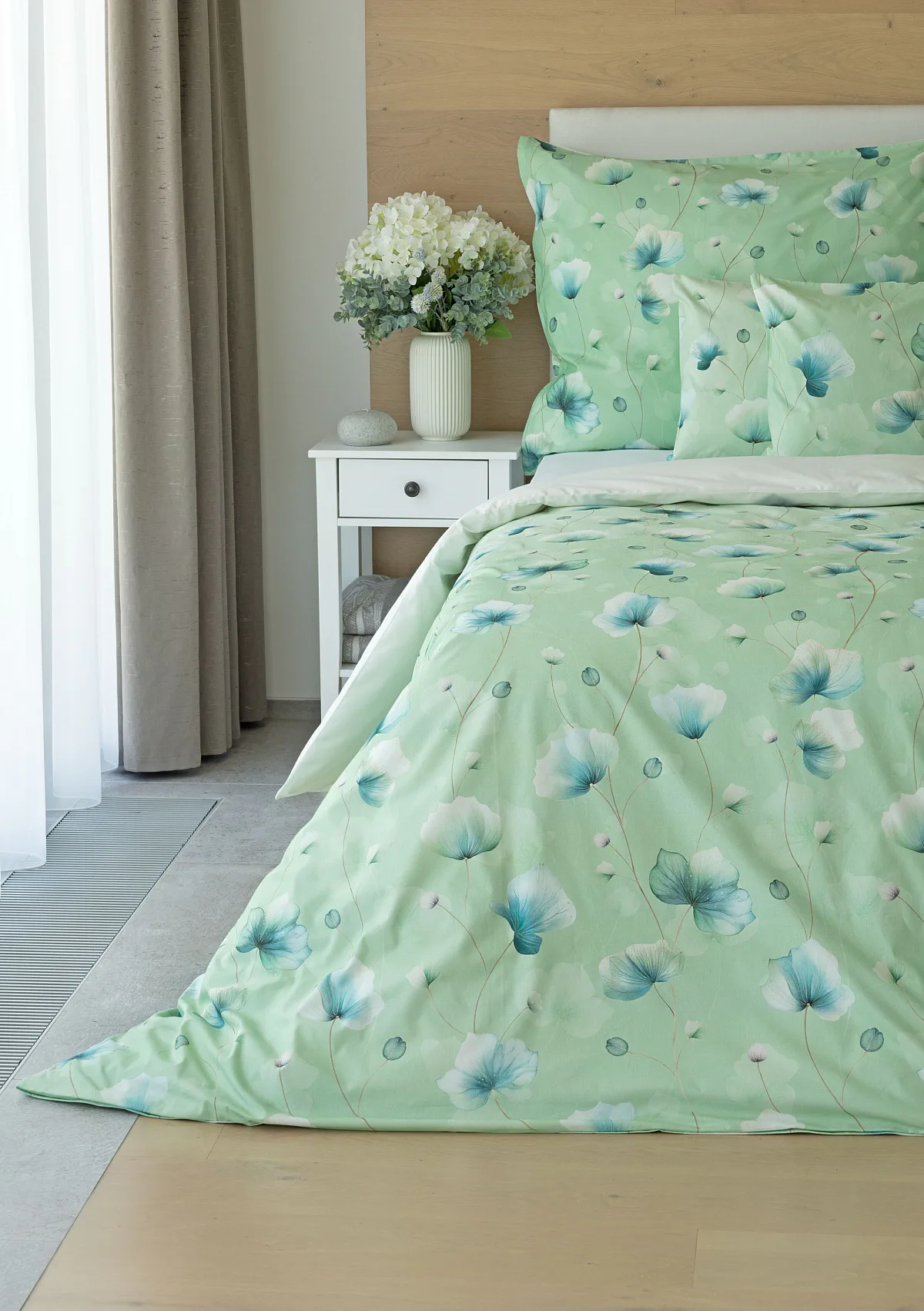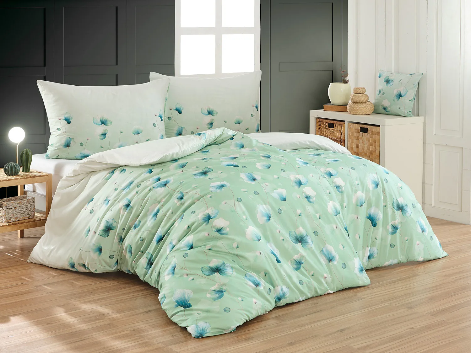 Bavlněné ložní povlečení Nelly vnese do vaší ložnice nádech svěžesti a vlnu pozitivní energie. Podklad v atraktivní zelené barvě zdobí velice jednoduchý florální motiv v paletě modrých a petrolejových tónů. Eleganci vzoru podtrhuje ombré efekt, který přechází v horní části povlaků k tlumenému, jemně zelenkavému odstínu.