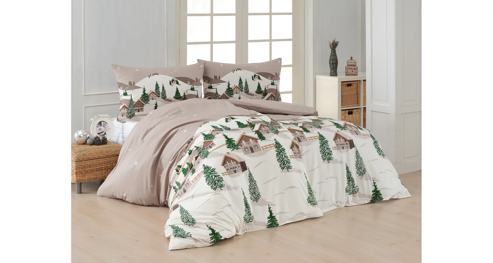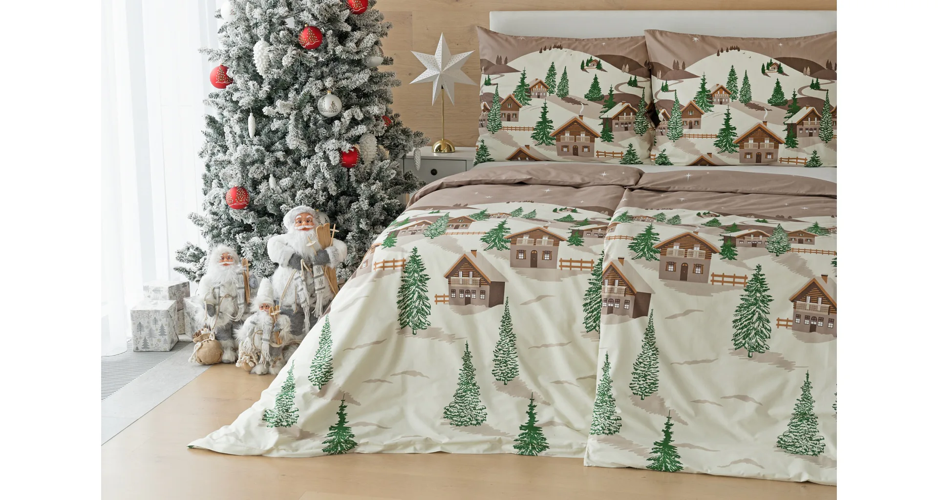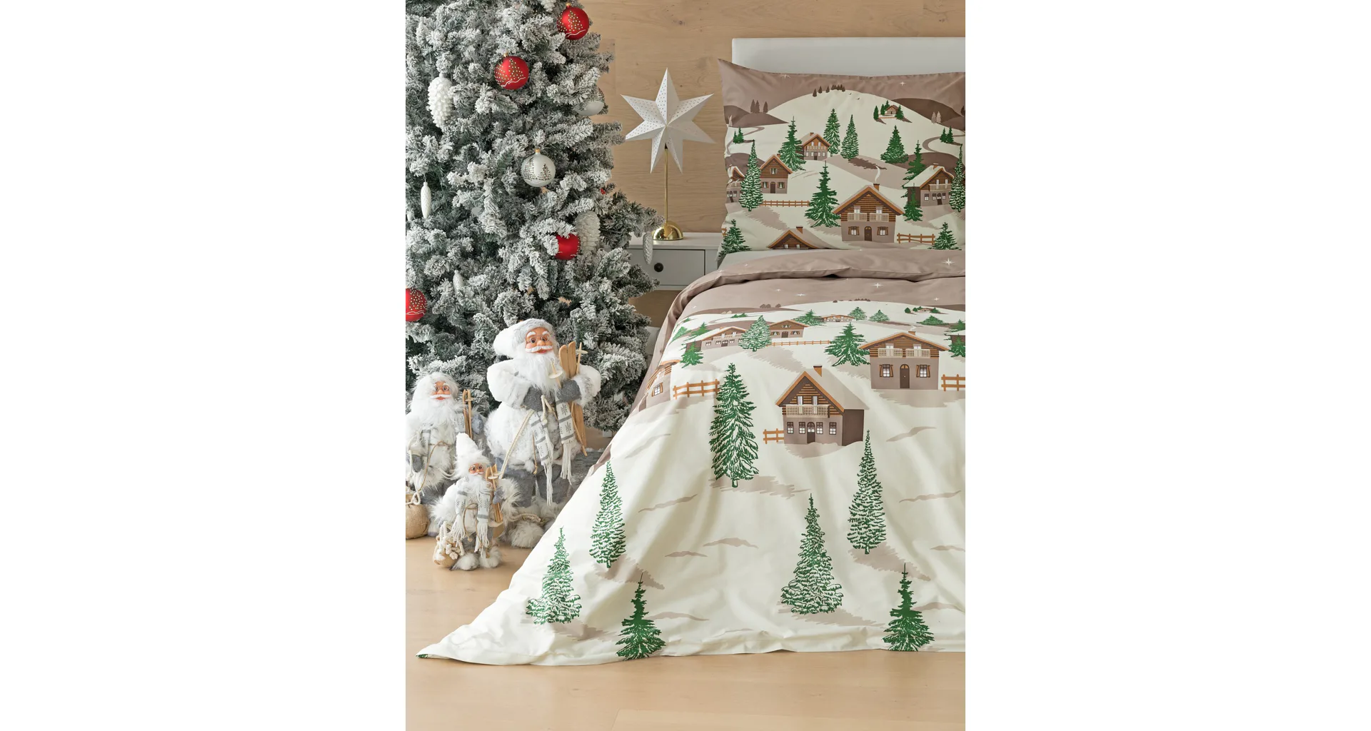 Bavlněné povlečení Niels s motivem zasněžené horské vesničky vnese do vaší ložnice poklidnou zimní atmosféru. Hřejivé odstíny krémové a hnědé oživí motiv zelených stromečků. Na podkladu v přírodní hnědé barvě září sem tam malá bílá hvězdička. Nechte se hýčkat a zachumlejte se do jemné bavlny deluxe.