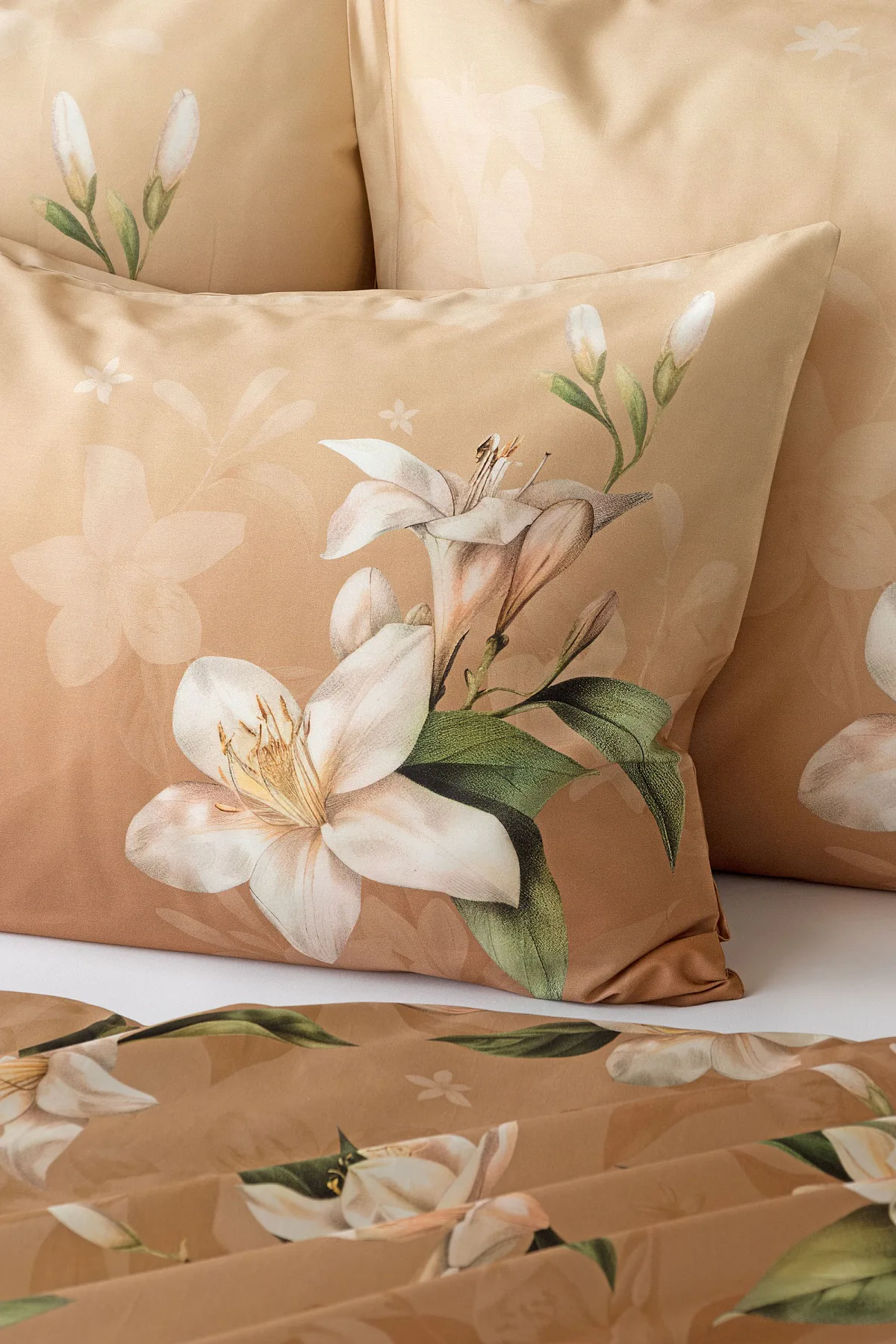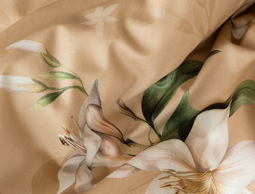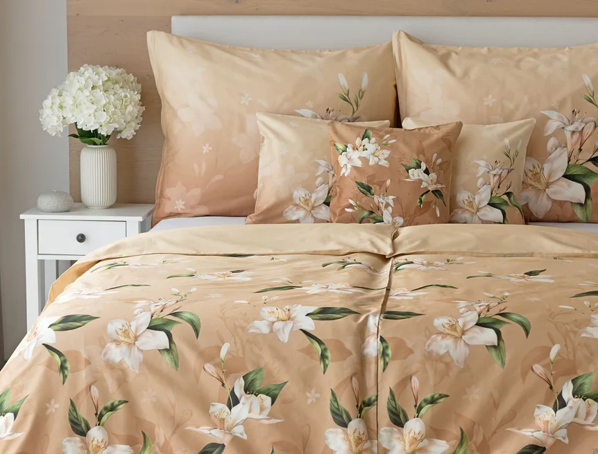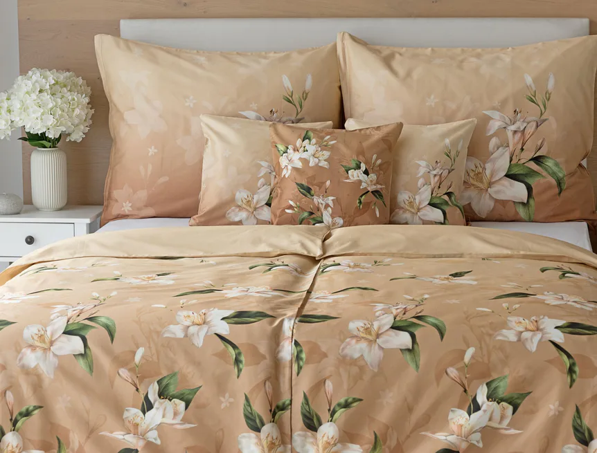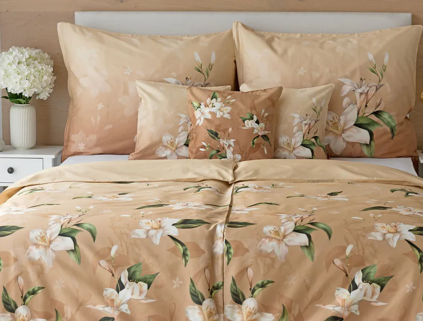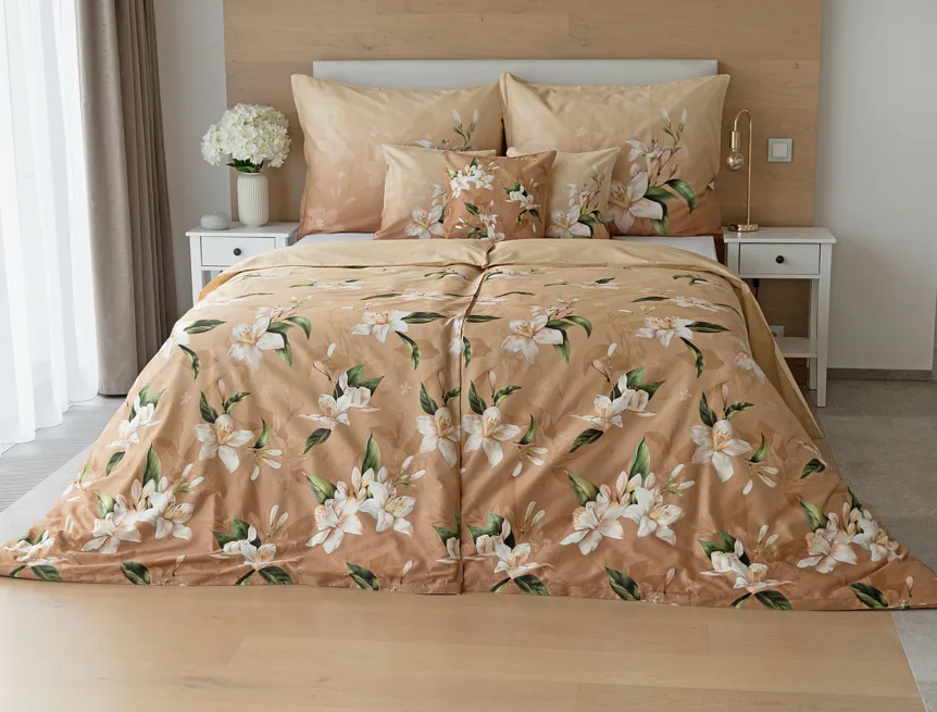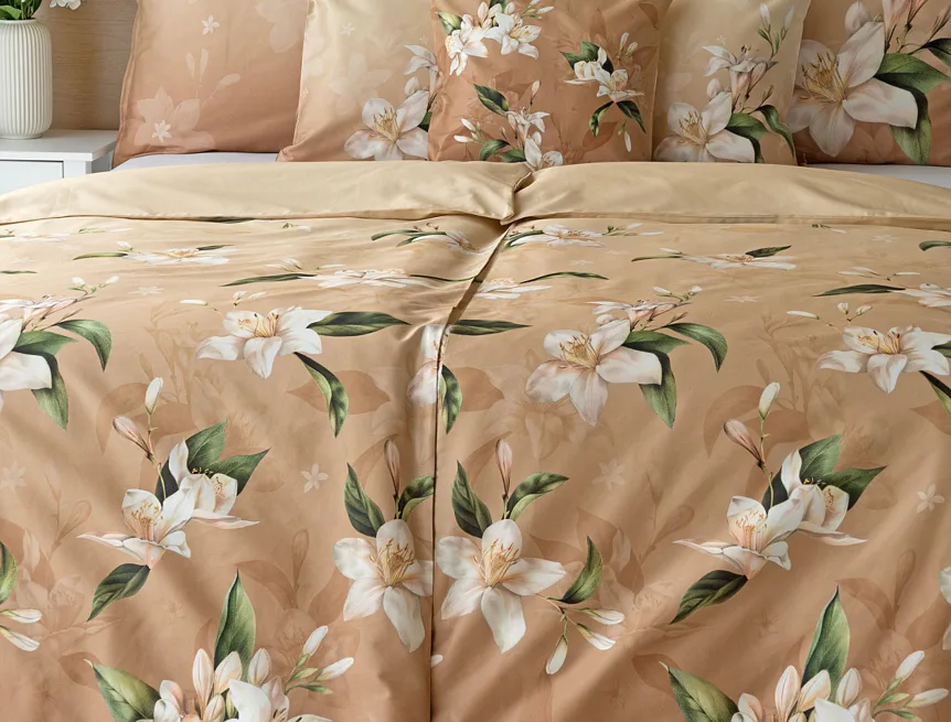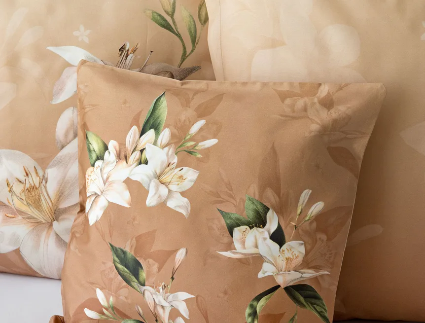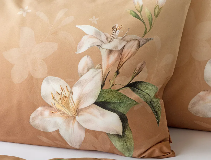 Saténové povlečení Nova s okouzlujícím motivem bílých lilií se stane elegantní ozdobou každého interiéru. Hřejivý oříškově hnědý podklad přechází postupně do béžového odstínu a dává vyniknout precizním detailům digitálního potisku.