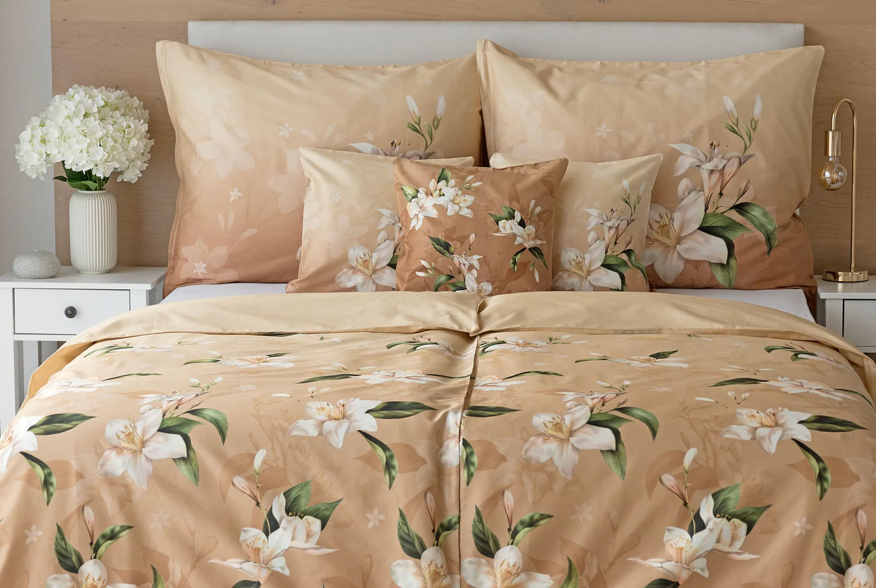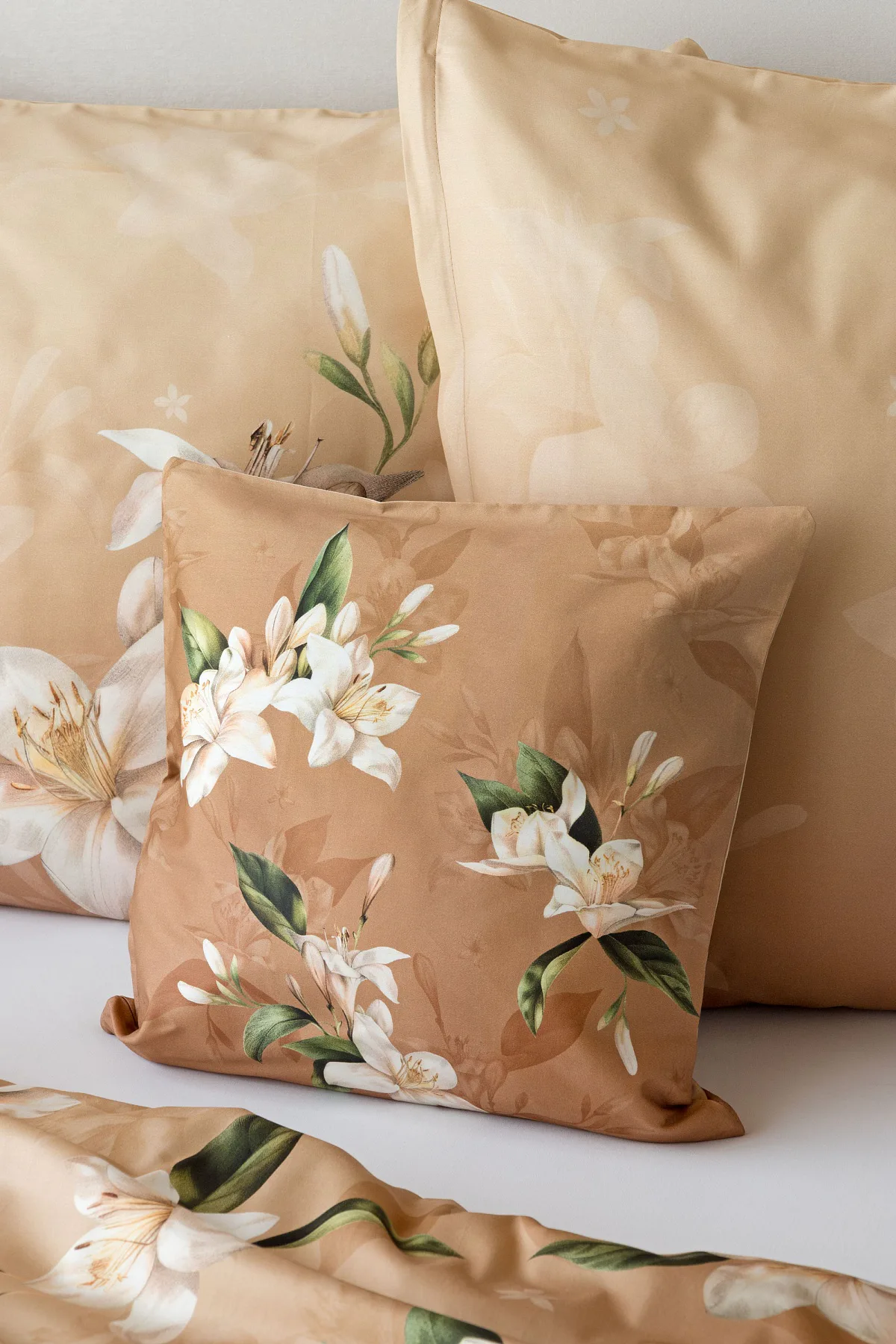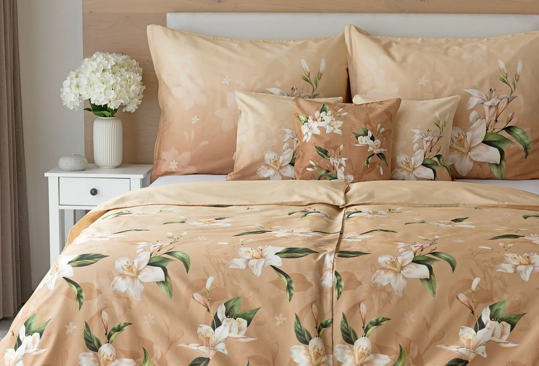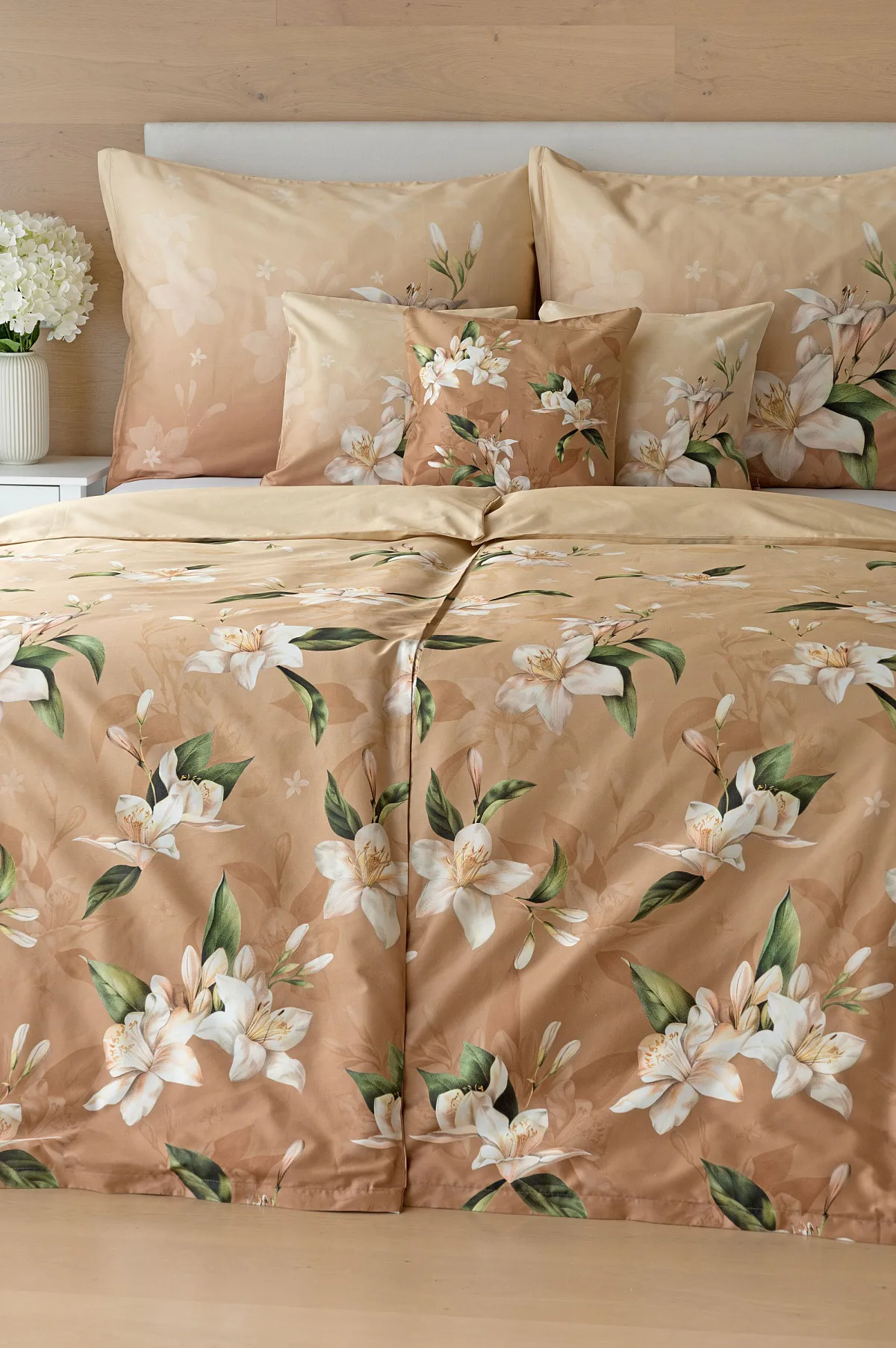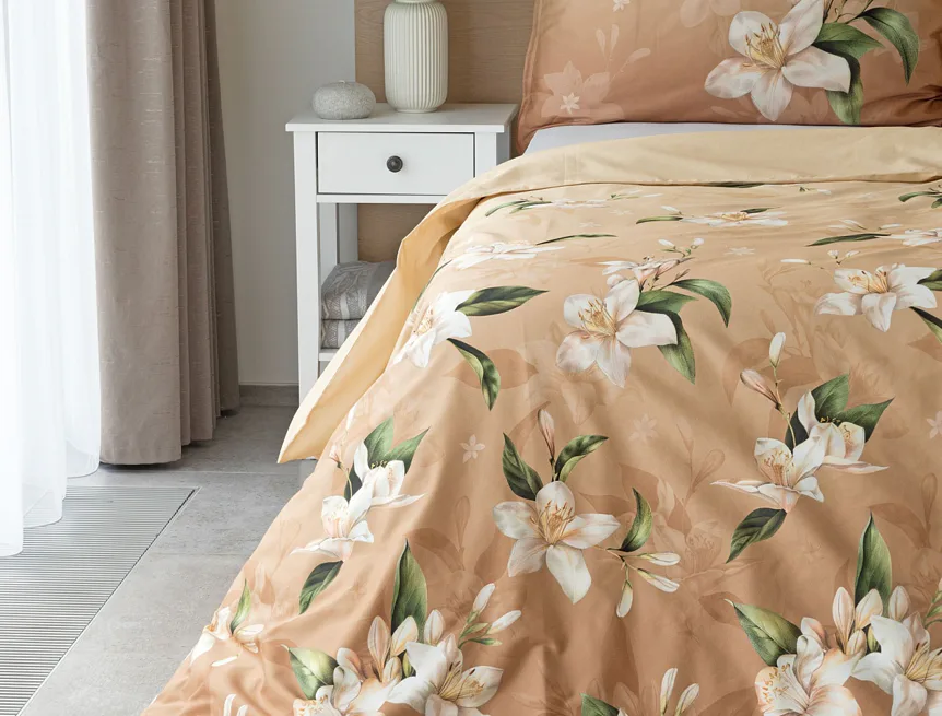 Saténové povlečení Nova s okouzlujícím motivem bílých lilií se stane elegantní ozdobou každého interiéru. Hřejivý oříškově hnědý podklad přechází postupně do béžového odstínu a dává vyniknout precizním detailům digitálního potisku.