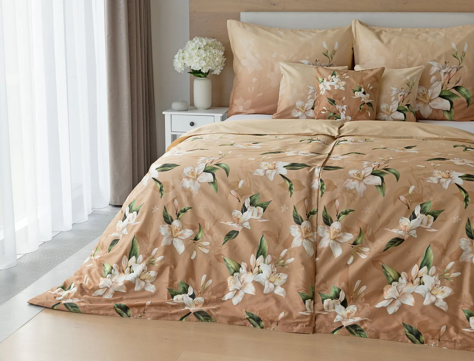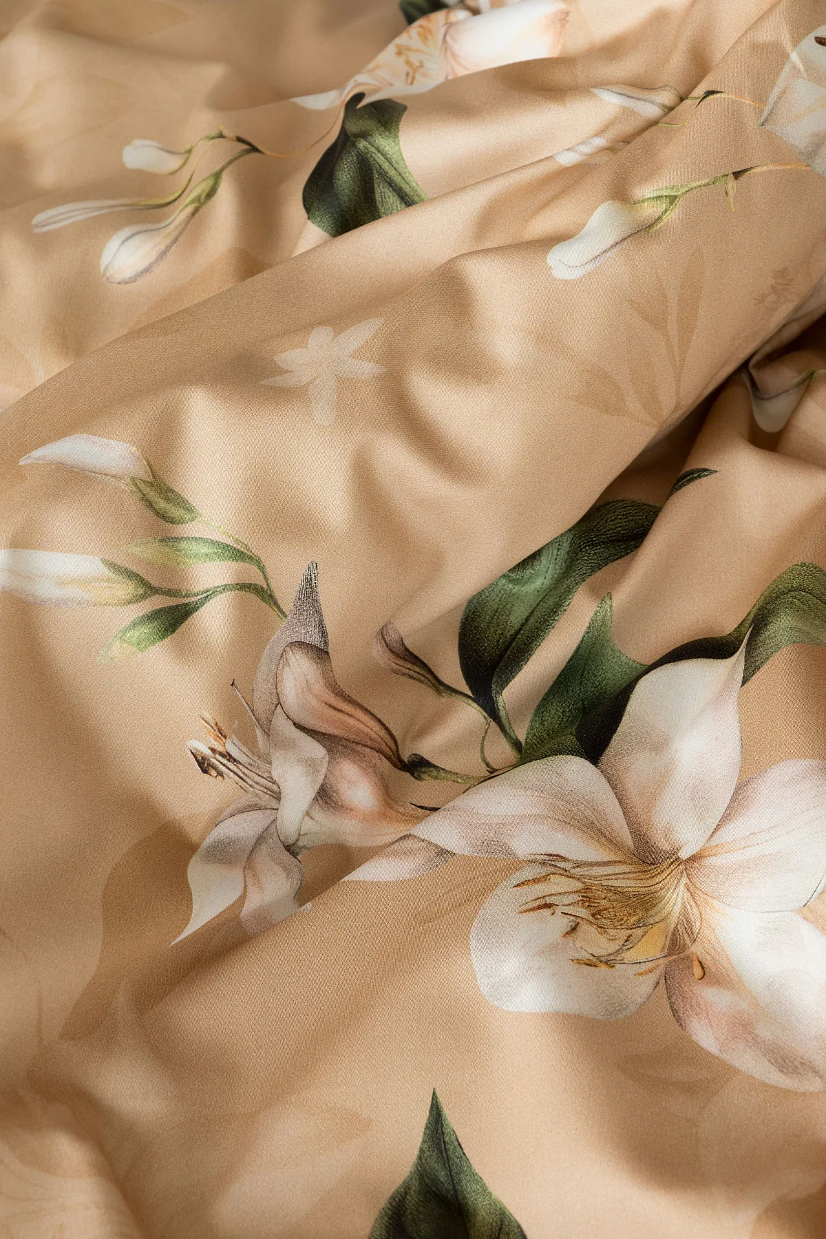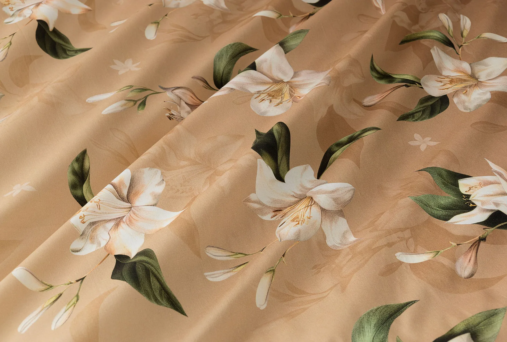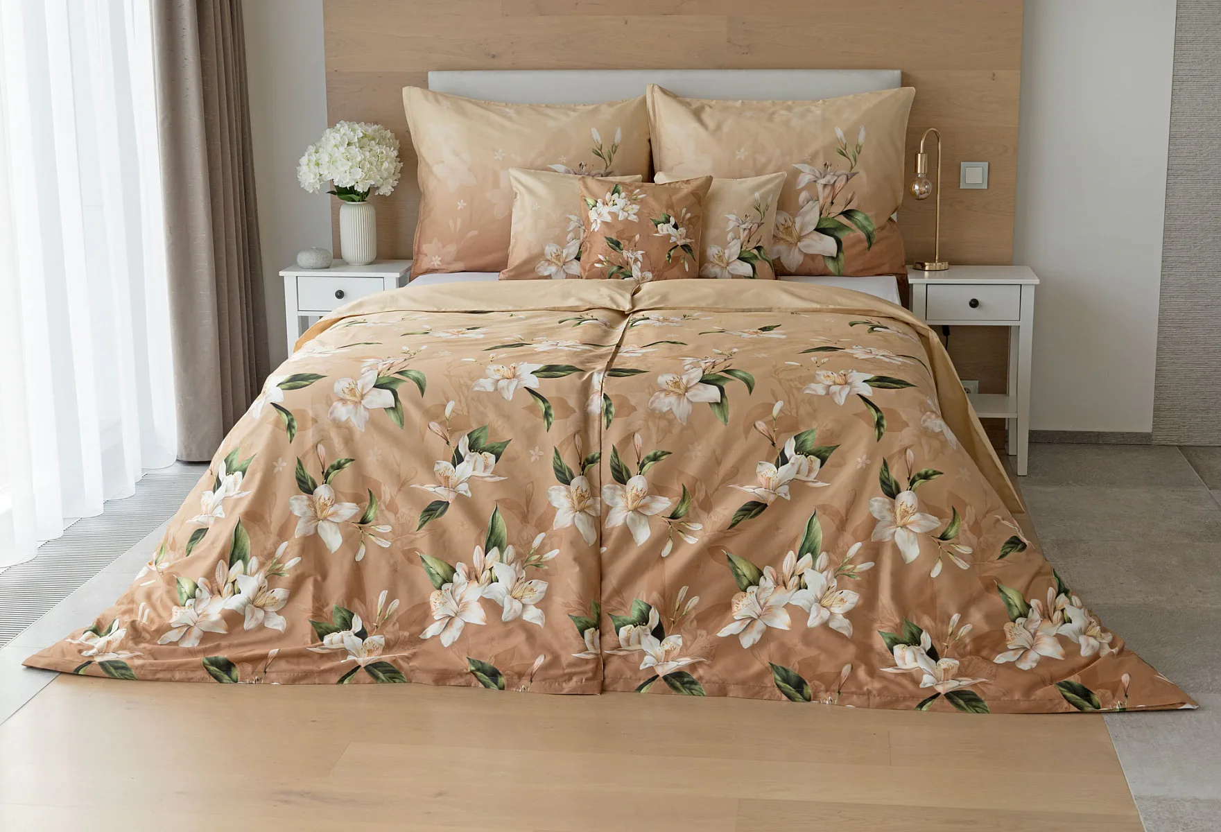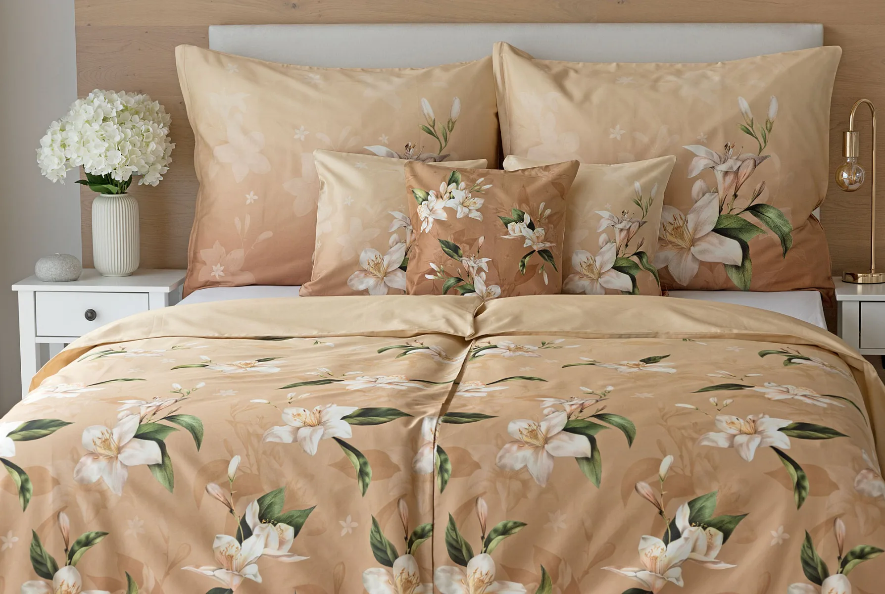 Saténové povlečení Nova s okouzlujícím motivem bílých lilií se stane elegantní ozdobou každého interiéru. Hřejivý oříškově hnědý podklad přechází postupně do béžového odstínu a dává vyniknout precizním detailům digitálního potisku.