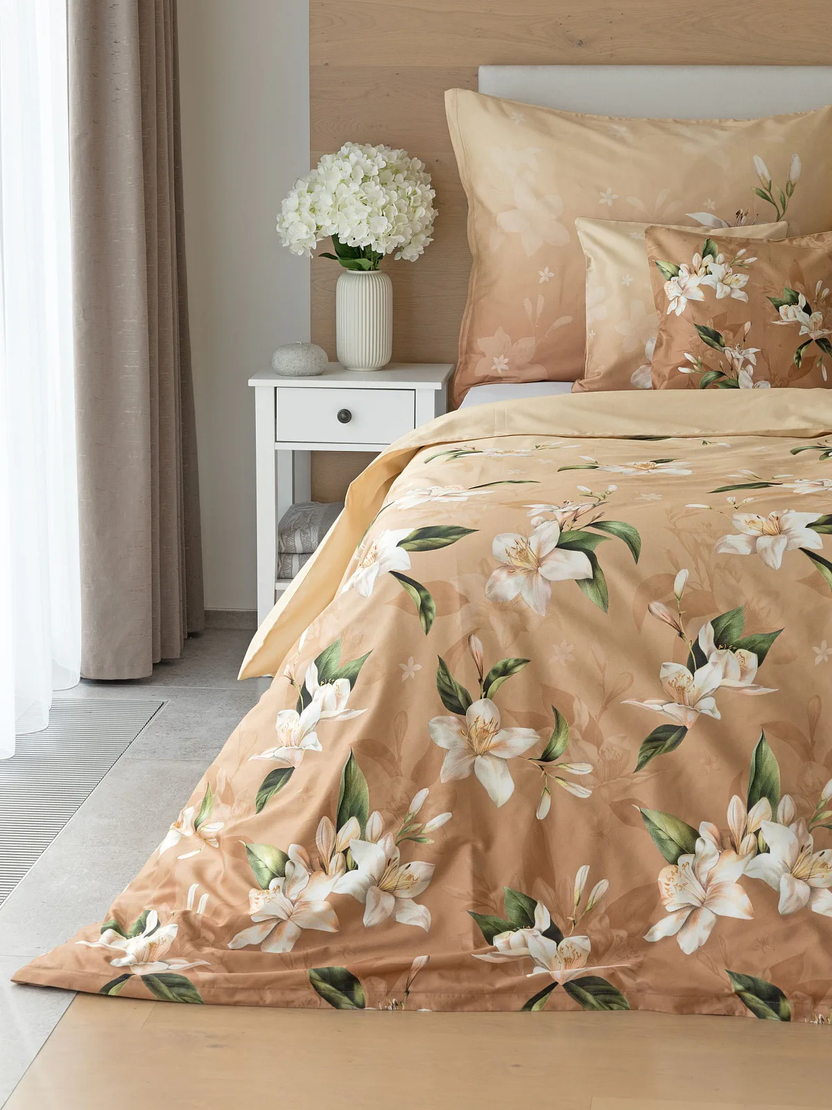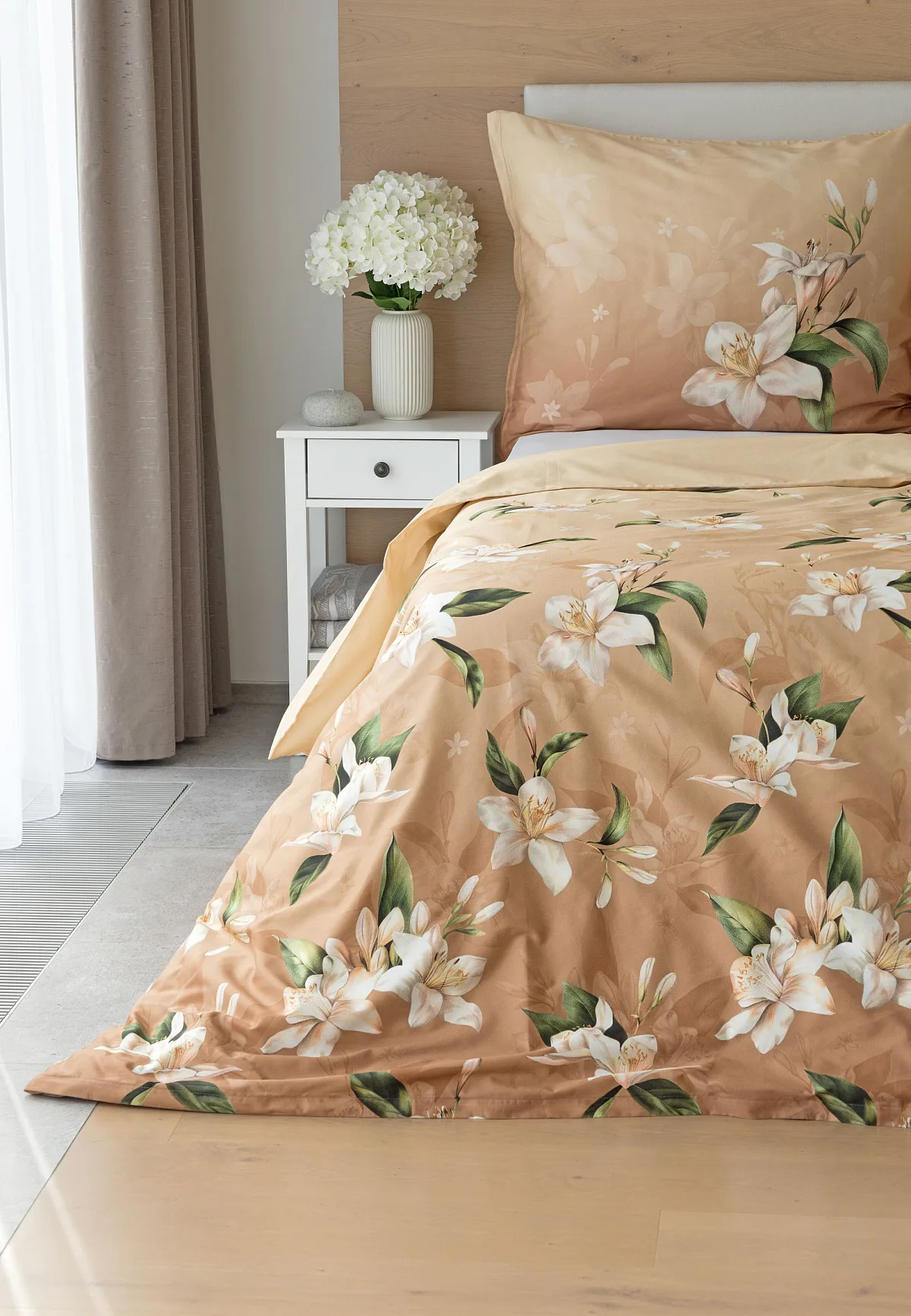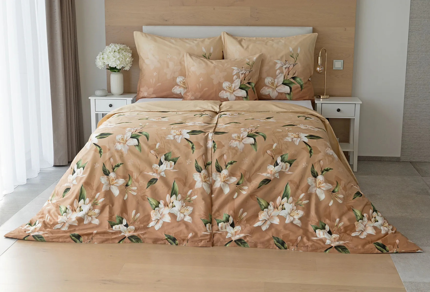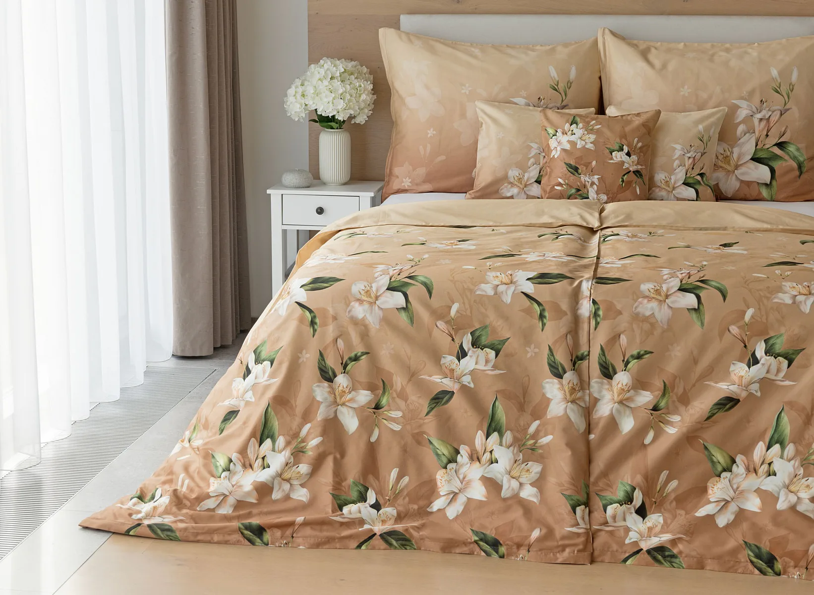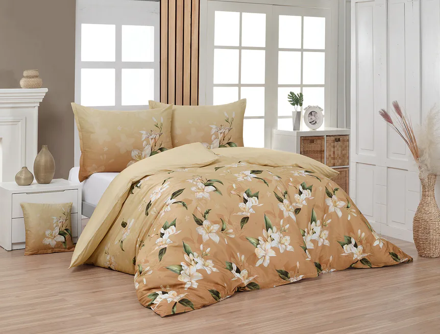 Saténové povlečení Nova s okouzlujícím motivem bílých lilií se stane elegantní ozdobou každého interiéru. Hřejivý oříškově hnědý podklad přechází postupně do béžového odstínu a dává vyniknout precizním detailům digitálního potisku.