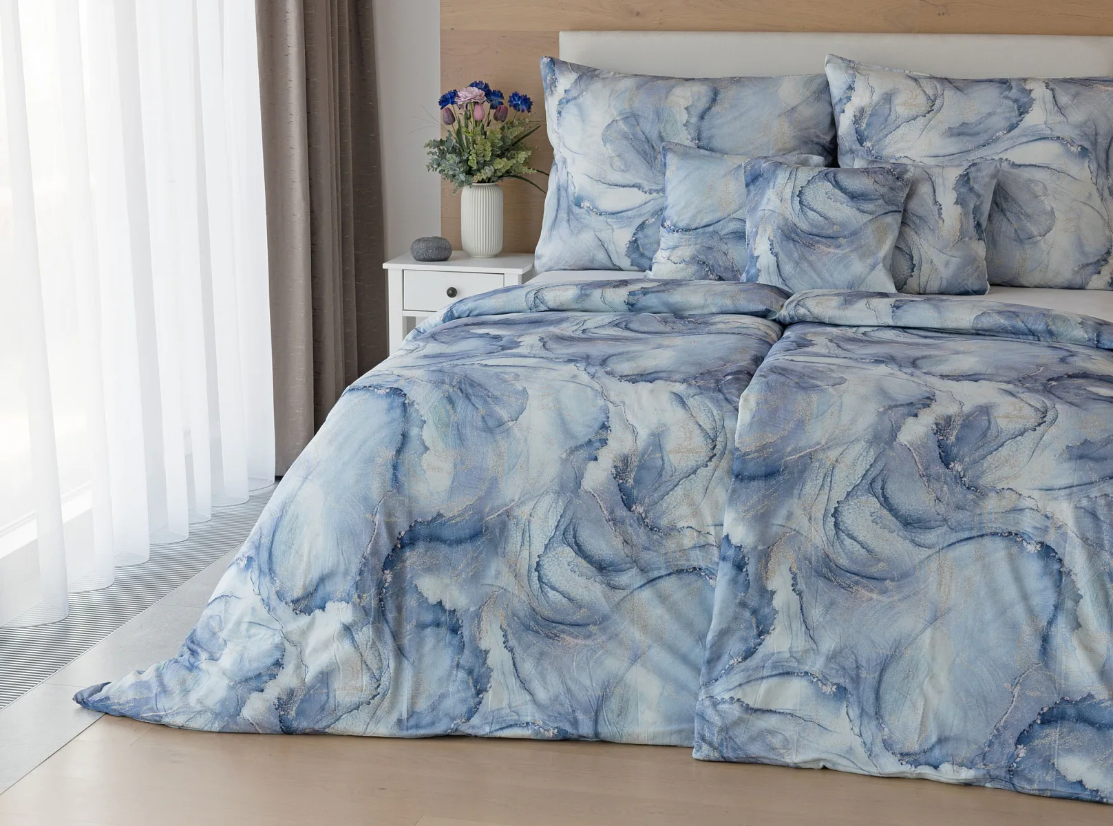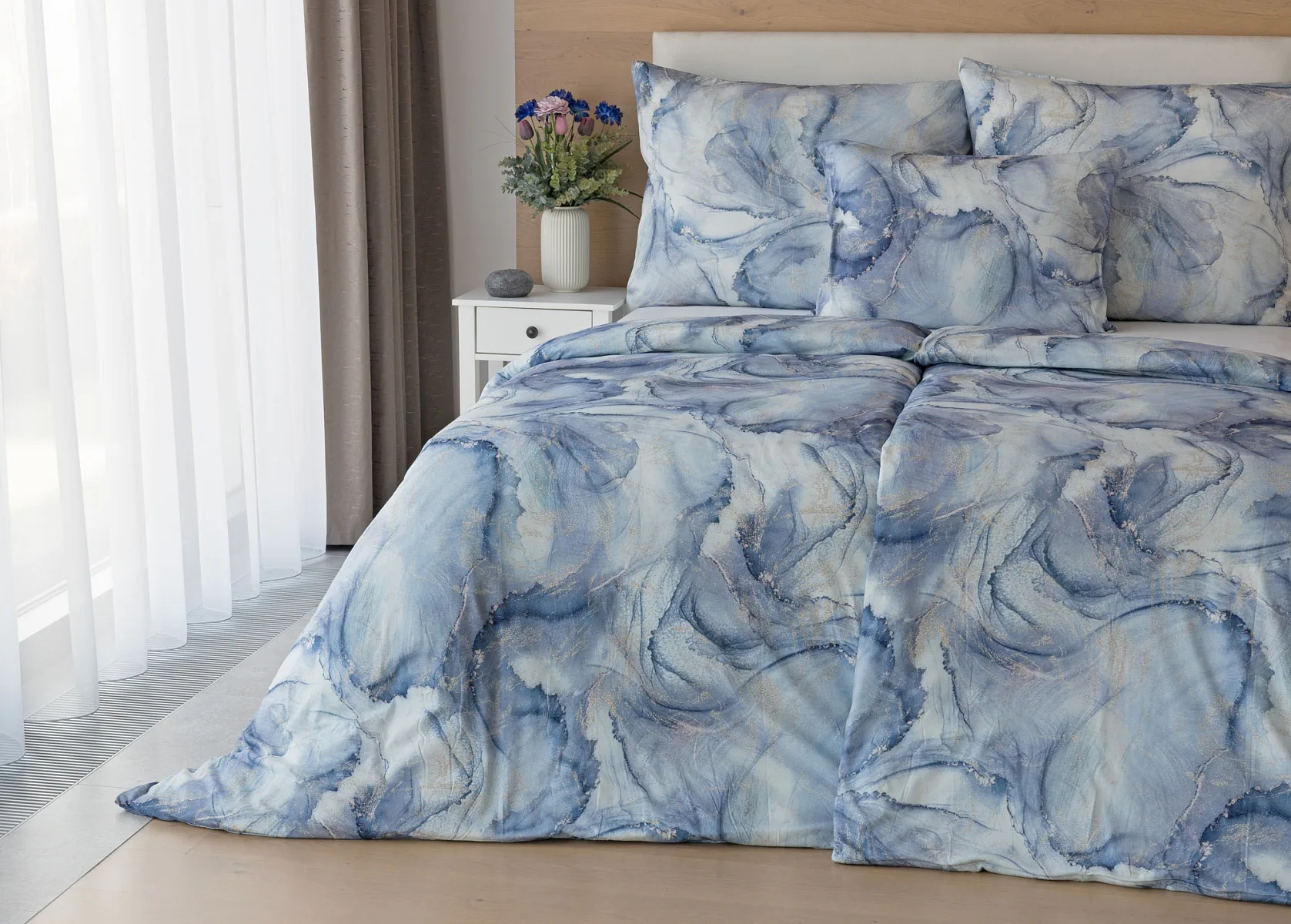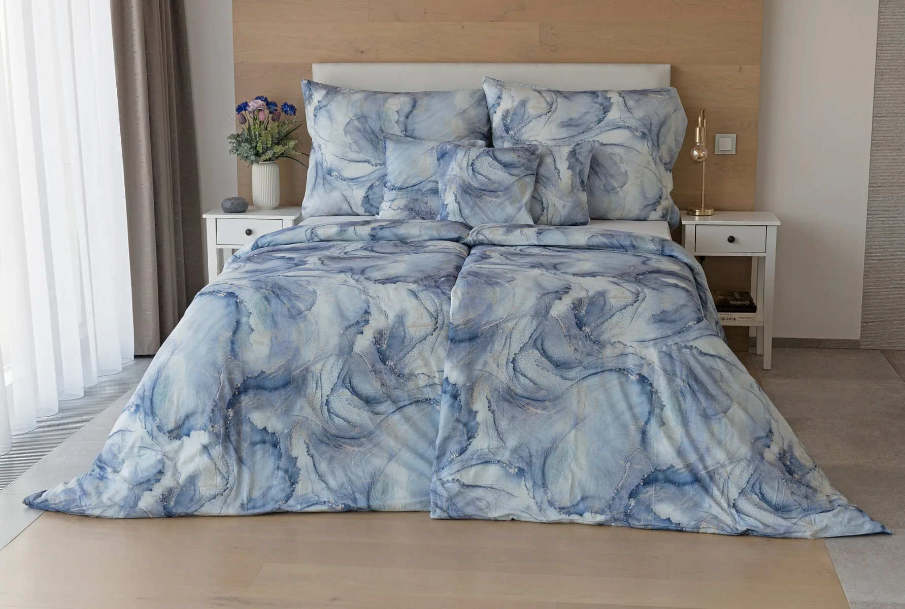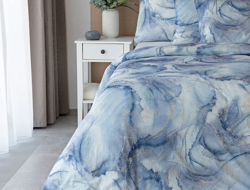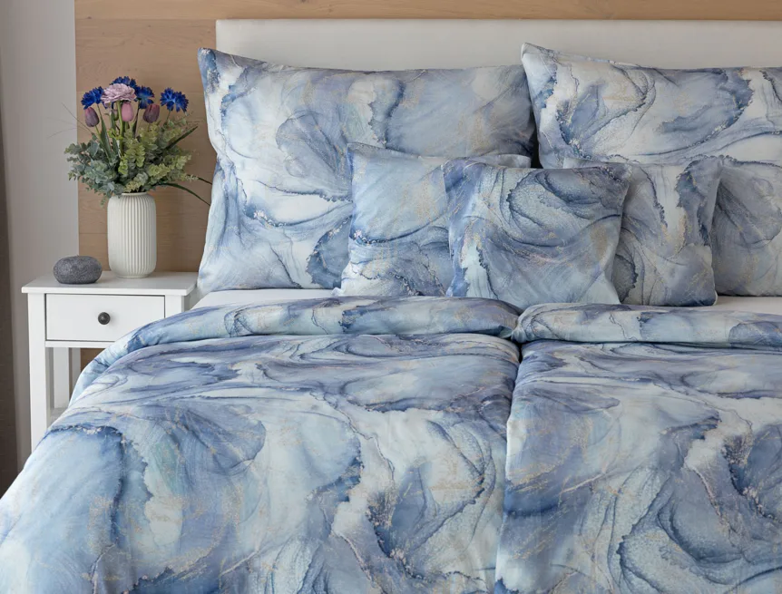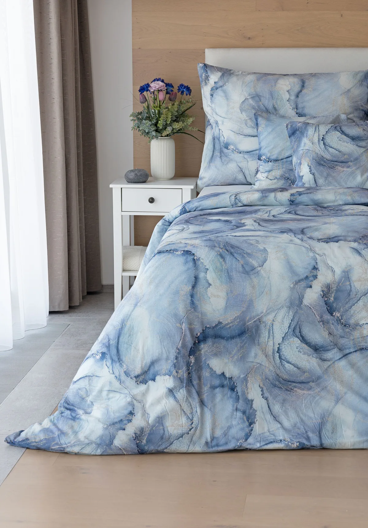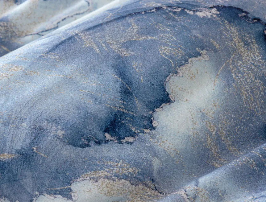 Pro novou kolekci ložního povlečení Mako jersey jsme pečlivě vybírali motivy, které tomuto pružnému materiálu sluší. Abstraktní vzor Odine, který je tvořen paletou modrých tónů protkaných zlatavými prvky, rozzáří vaši ložnici.