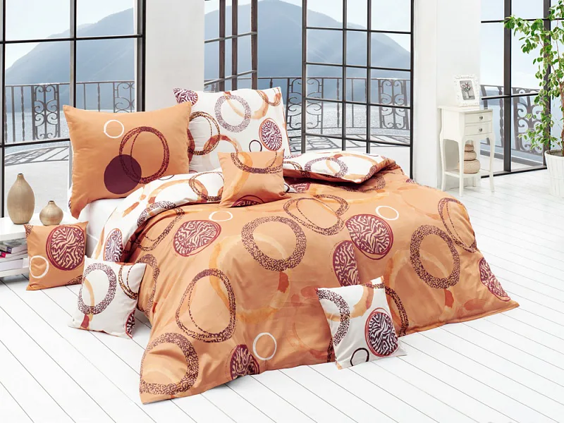 Povlečení ONYX přináší zcela nevšední design. Okouzlující odstíny měděné oranžové dokonale souzní s rozličnými kruhy v tónech čokoládově hnědé a okrové. Spodní strana povlaku na peřinu i polštář se liší - má stejný vzor, ale podklad tvoří jemná krémová barva. Povláčky na polštářky jsou šité z metráže, díky rozmanitosti vzoru je každý jiný. Ložní povlečení je opatřeno komfortním zipovým uzávěrem.