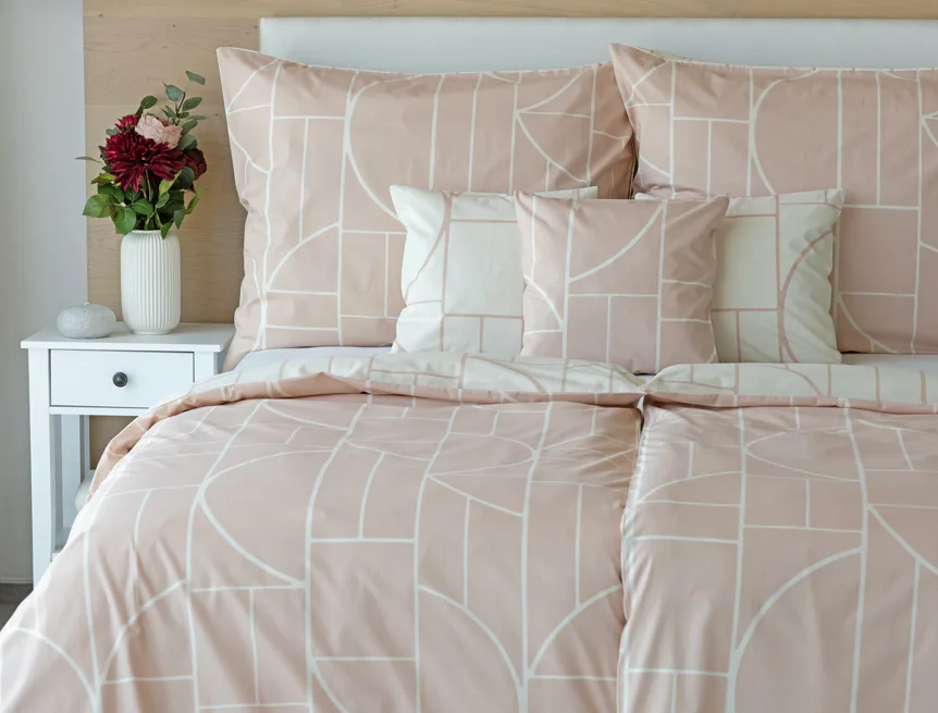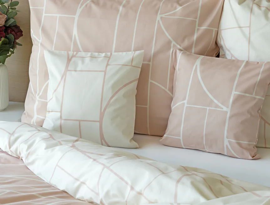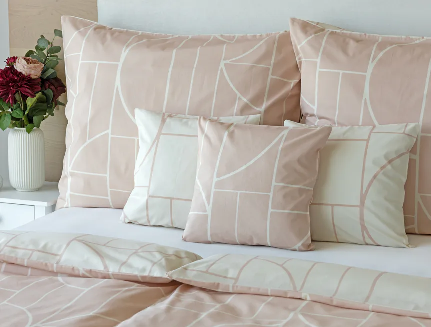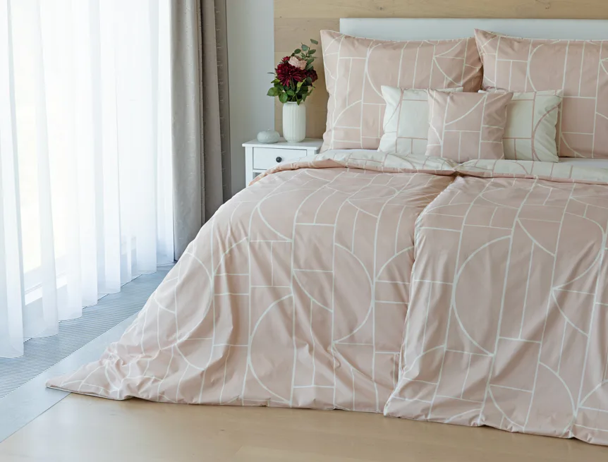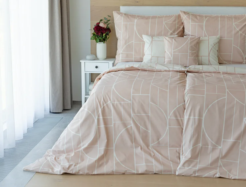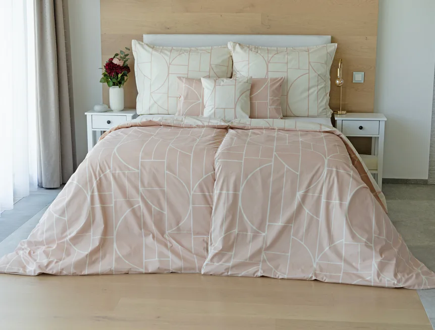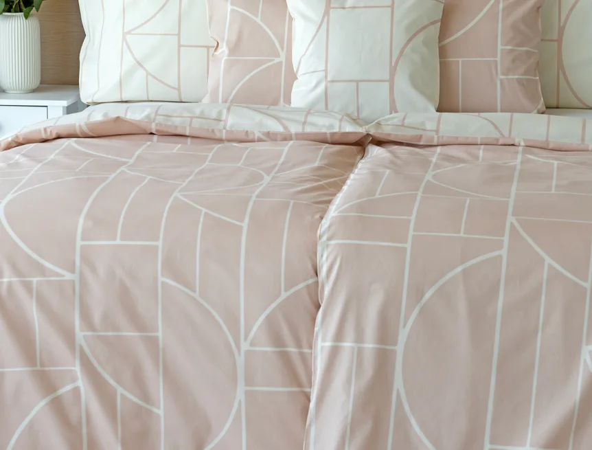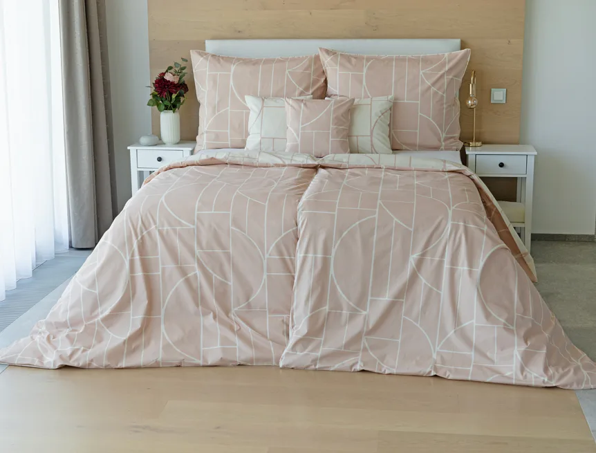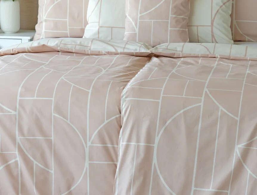 Povlak na polštář i na přikrývku je z každé strany jiný, na jedné straně dominuje pudrově růžový podklad, z druhé strany se geometrický vzor vyjímá na krémovém podkladu. Povlečení je opatřeno komfortním zipovým uzávěrem. 100% bavlna