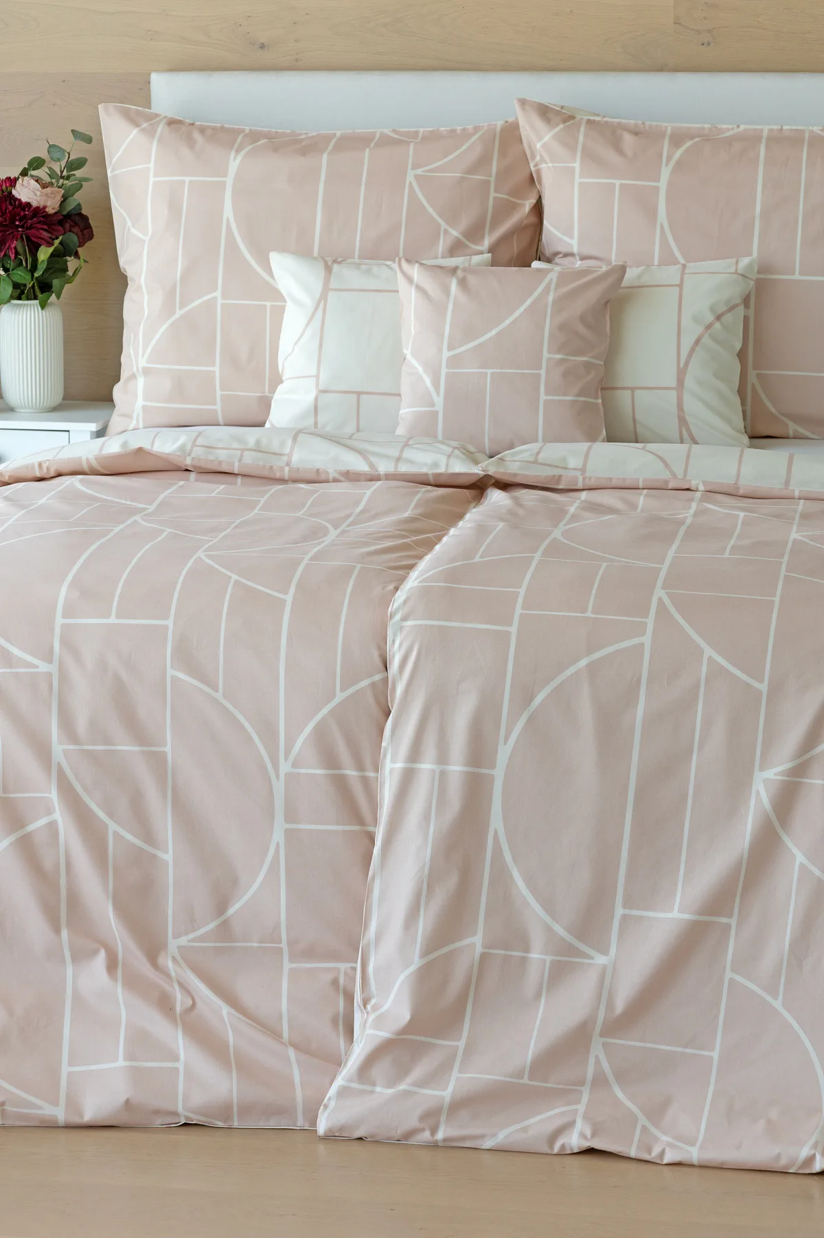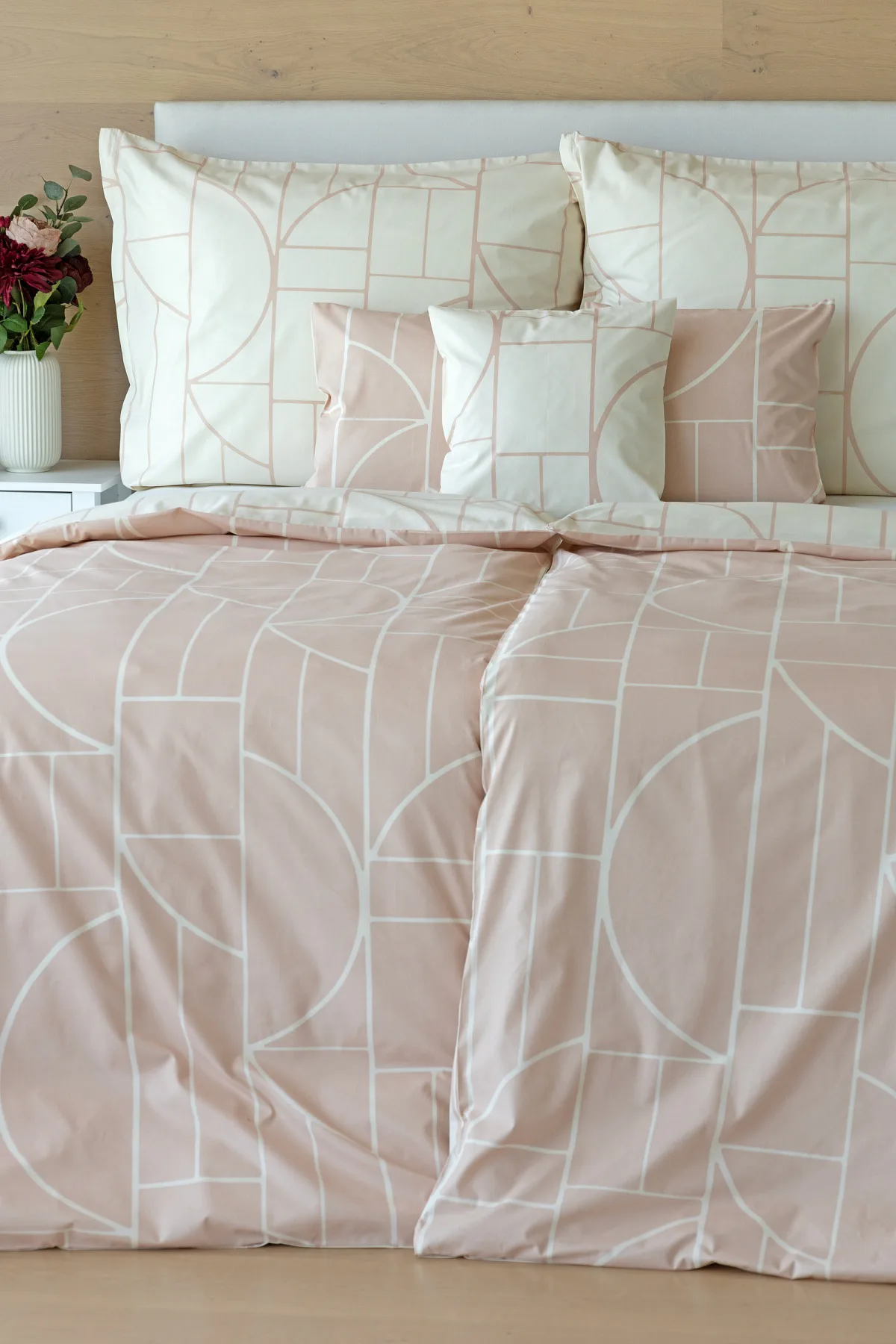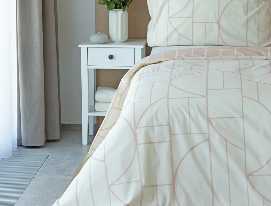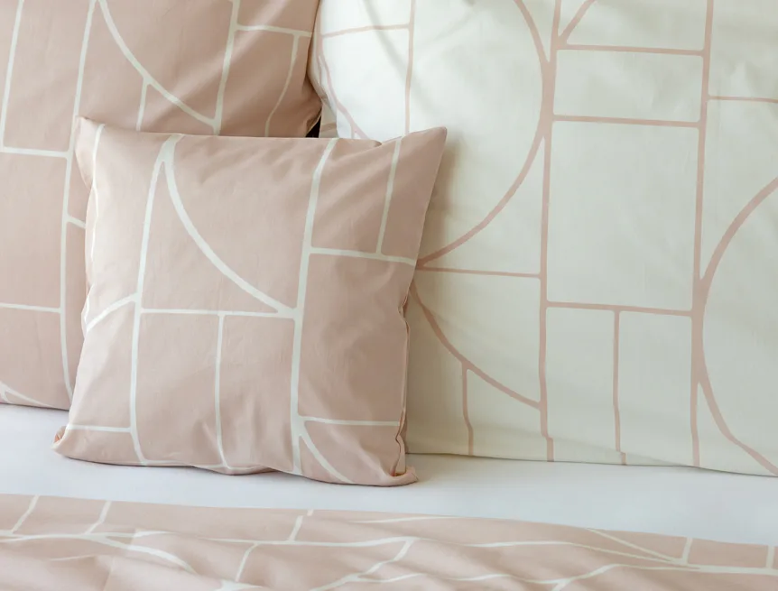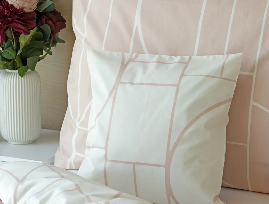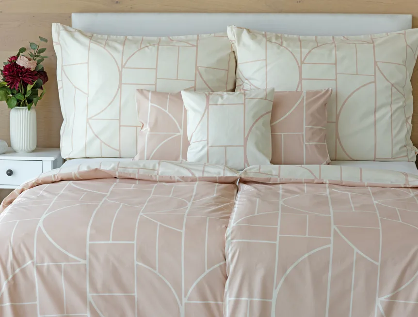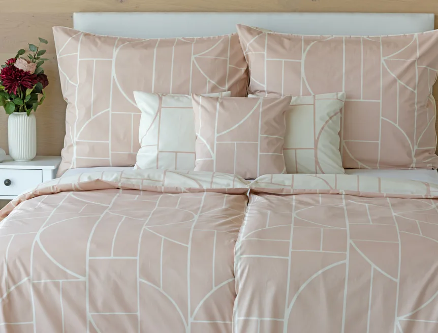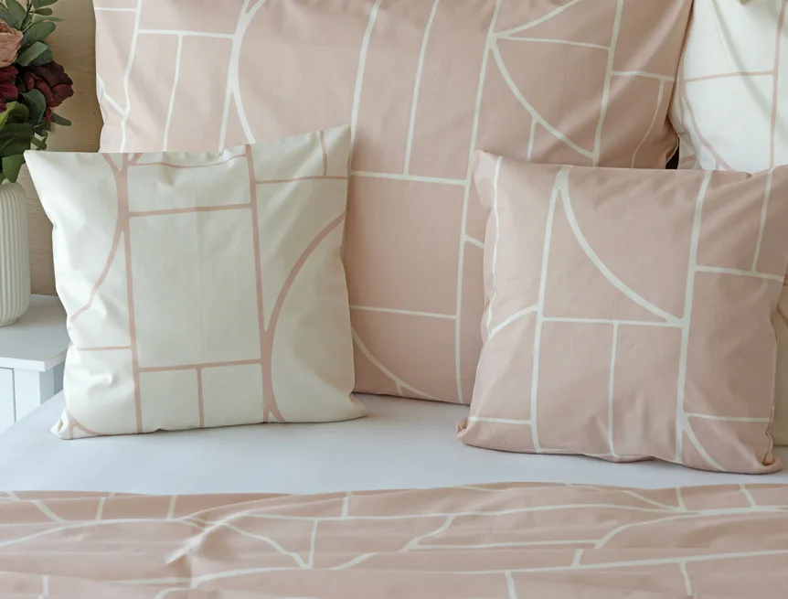 Povlak na polštář i na přikrývku je z každé strany jiný, na jedné straně dominuje pudrově růžový podklad, z druhé strany se geometrický vzor vyjímá na krémovém podkladu. Povlečení je opatřeno komfortním zipovým uzávěrem. 100% bavlna